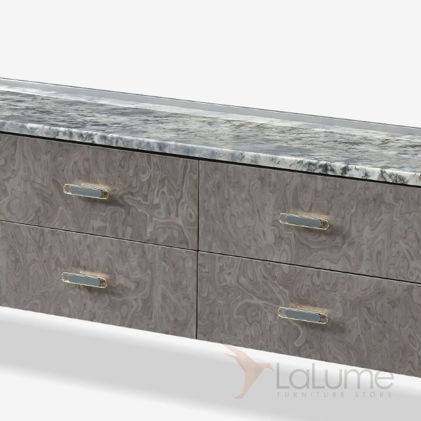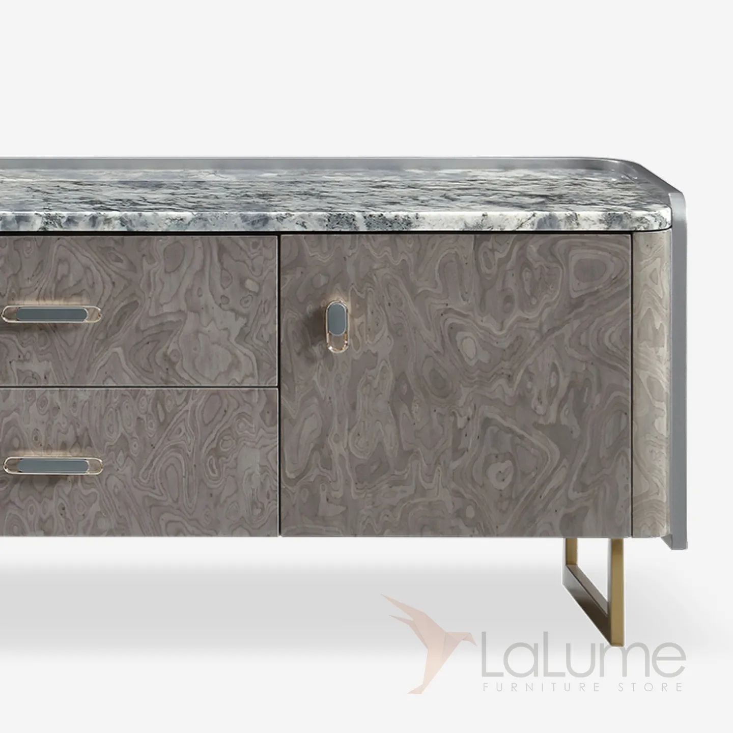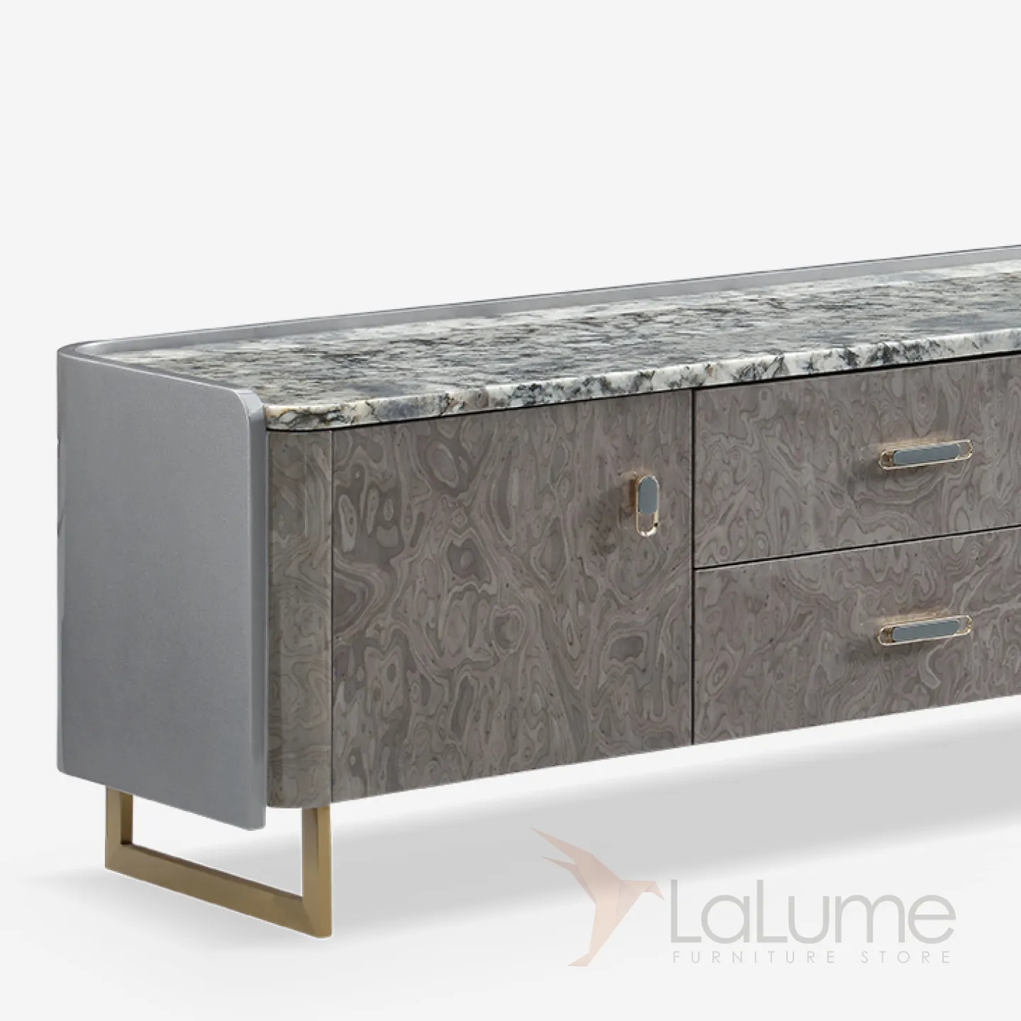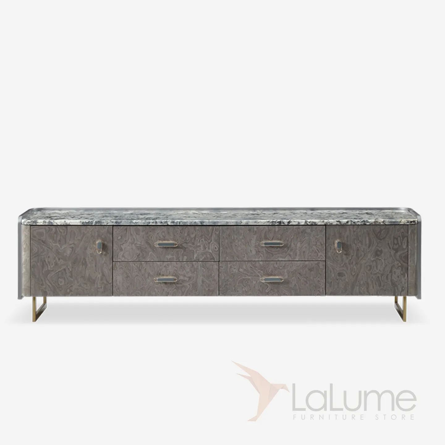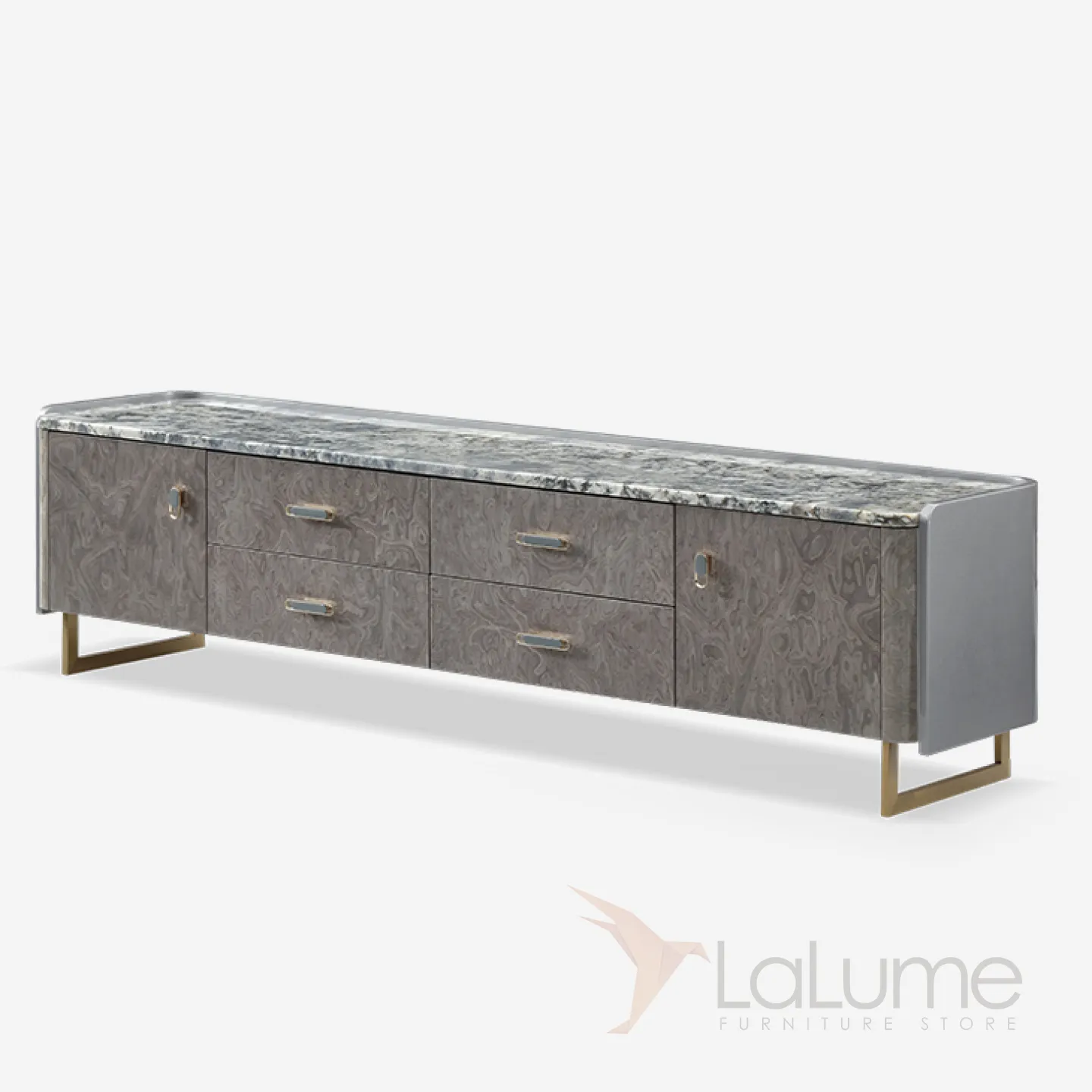 Дизайнерская ТВ-тумба с золотыми ножками и мраморной столешницей. Она оснащена четырьмя выдвижными ящиками и двумя дверцами, что позволяет организовать пространство с элегантностью и шиком.