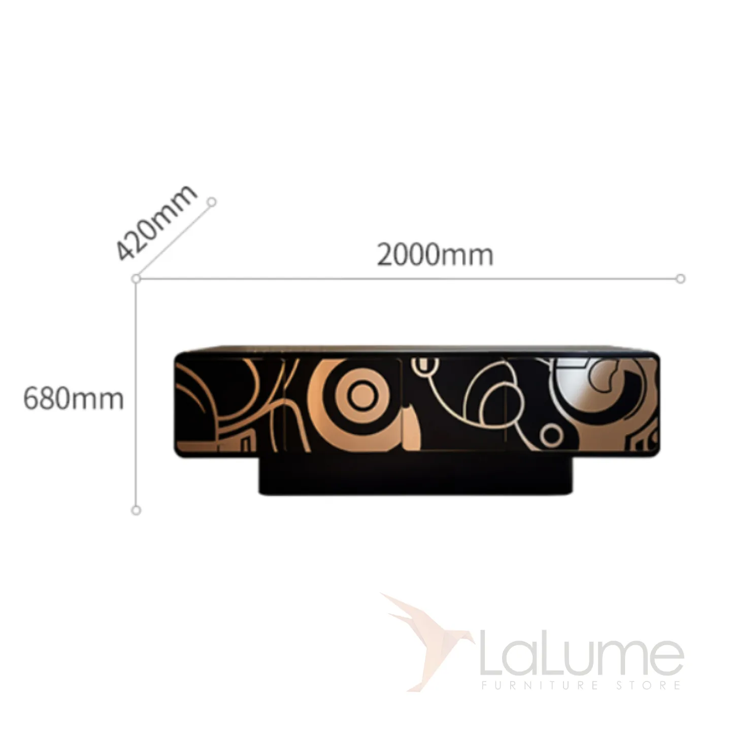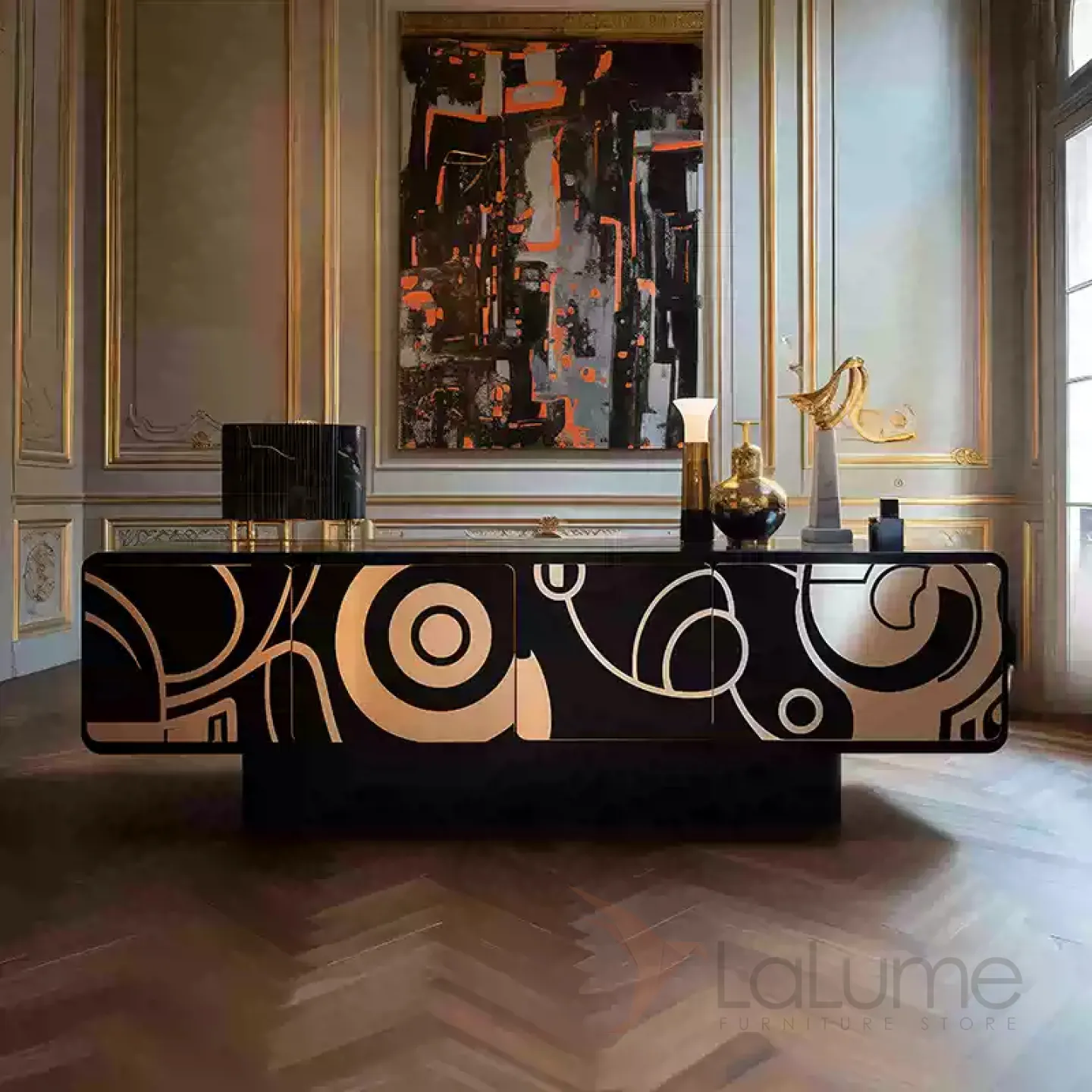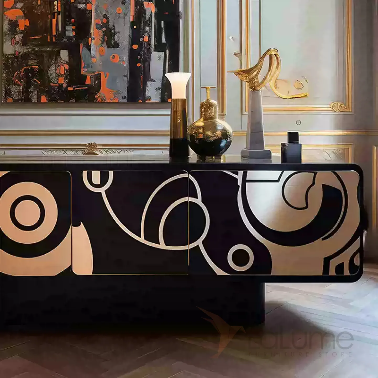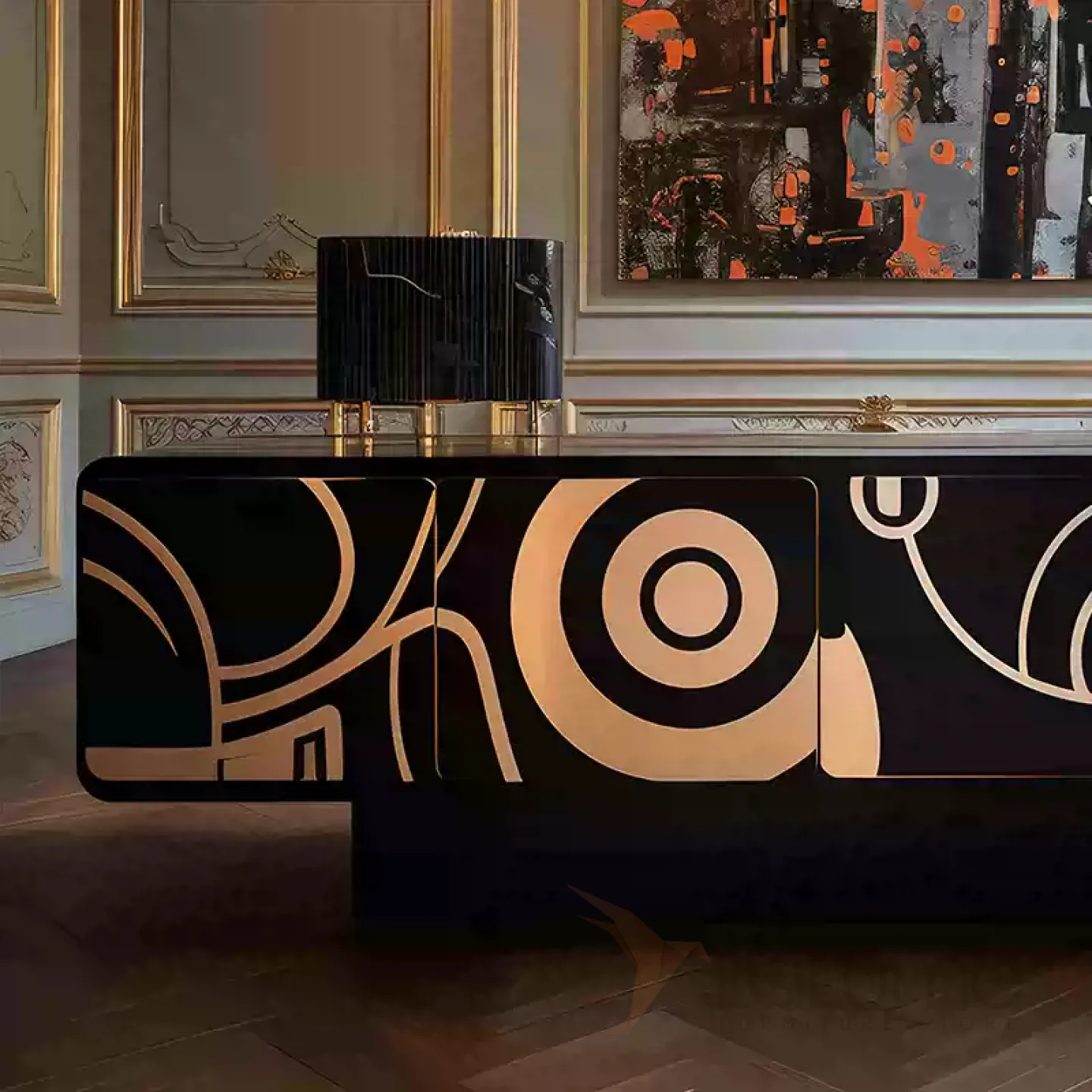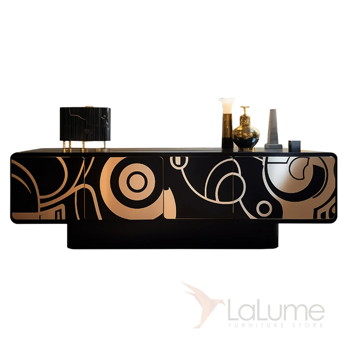 Дизайнерская тумба под телевизор, выполненная из дерева и украшенная оригинальным узором, который привлекает внимание своим золотистым оттенком. Функциональность этой тумбы обеспечивается наличием четырёх отсеков с дверцами, что позволяет разместить все необходимые вещи.