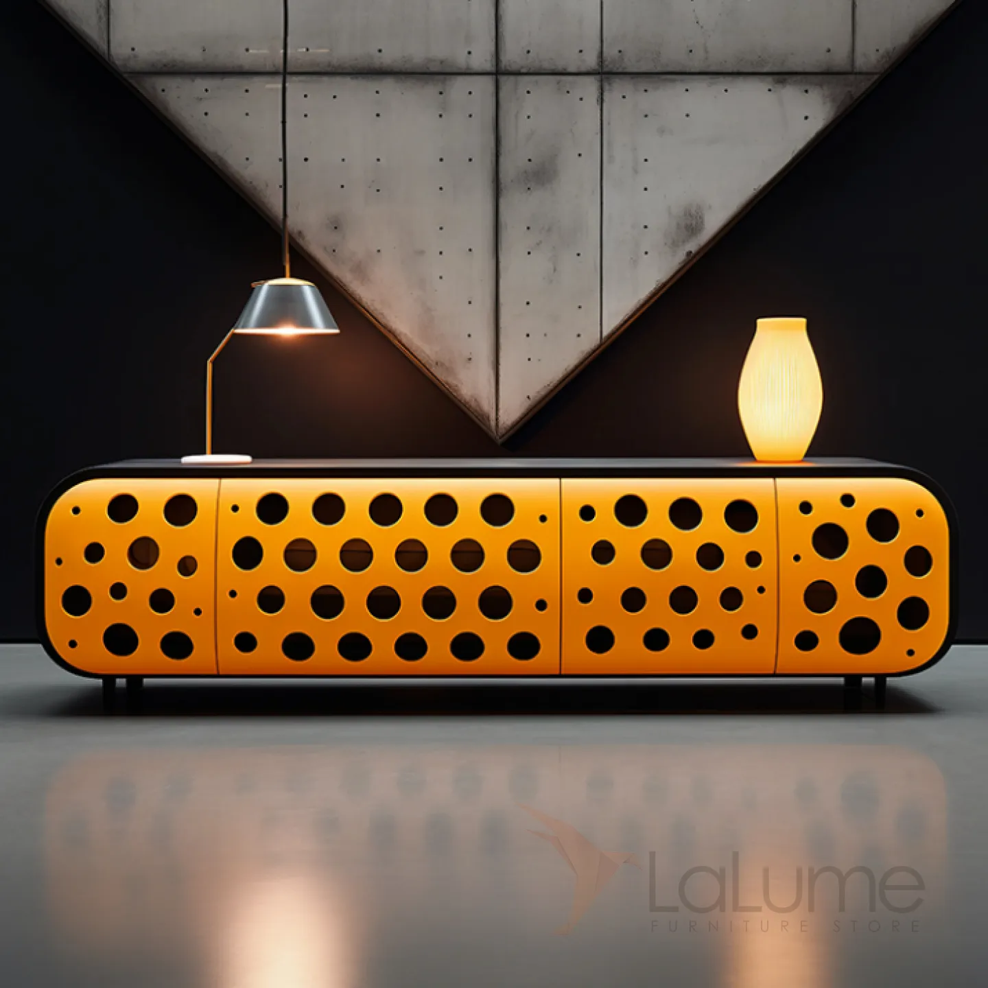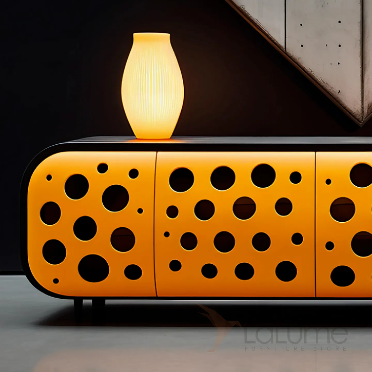 Тумба под телевизор, выполненная из дерева, отличается оригинальным дизайном. Её фактура и яркий цвет фасадов станут украшением интерьера. Закрытые четырьмя дверцами ниши помогут организовать пространство и удобно разместить вещи.