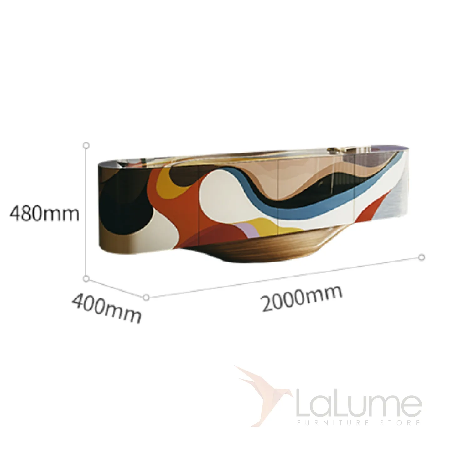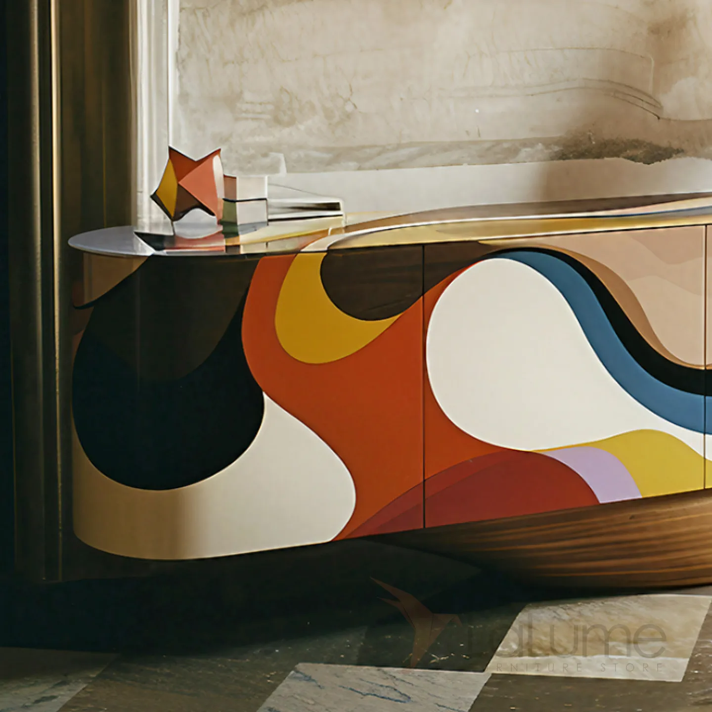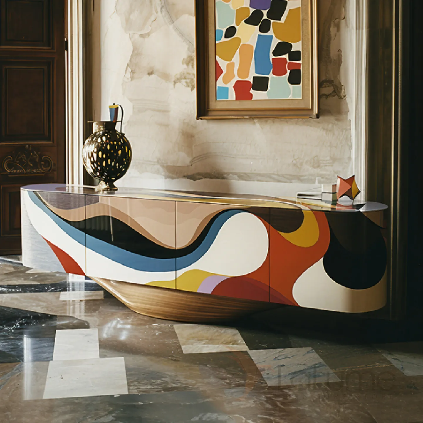 Изящная деревянная тумба для телевизора с уникальным принтом, созданная вручную. В ней есть четыре отделения, которые закрываются распашными дверцами.