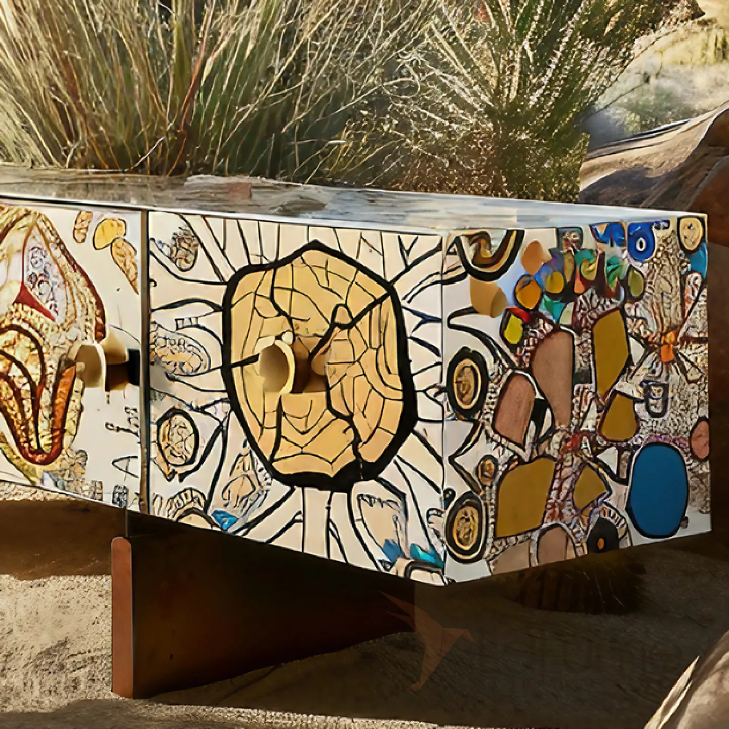 Элегантная деревянная тумба для телевизора, декорированная уникальным принтом, представляет собой произведение ручной работы. Конструкция изделия включает четыре функциональные секции, доступ к которым обеспечивается посредством распашных дверей.