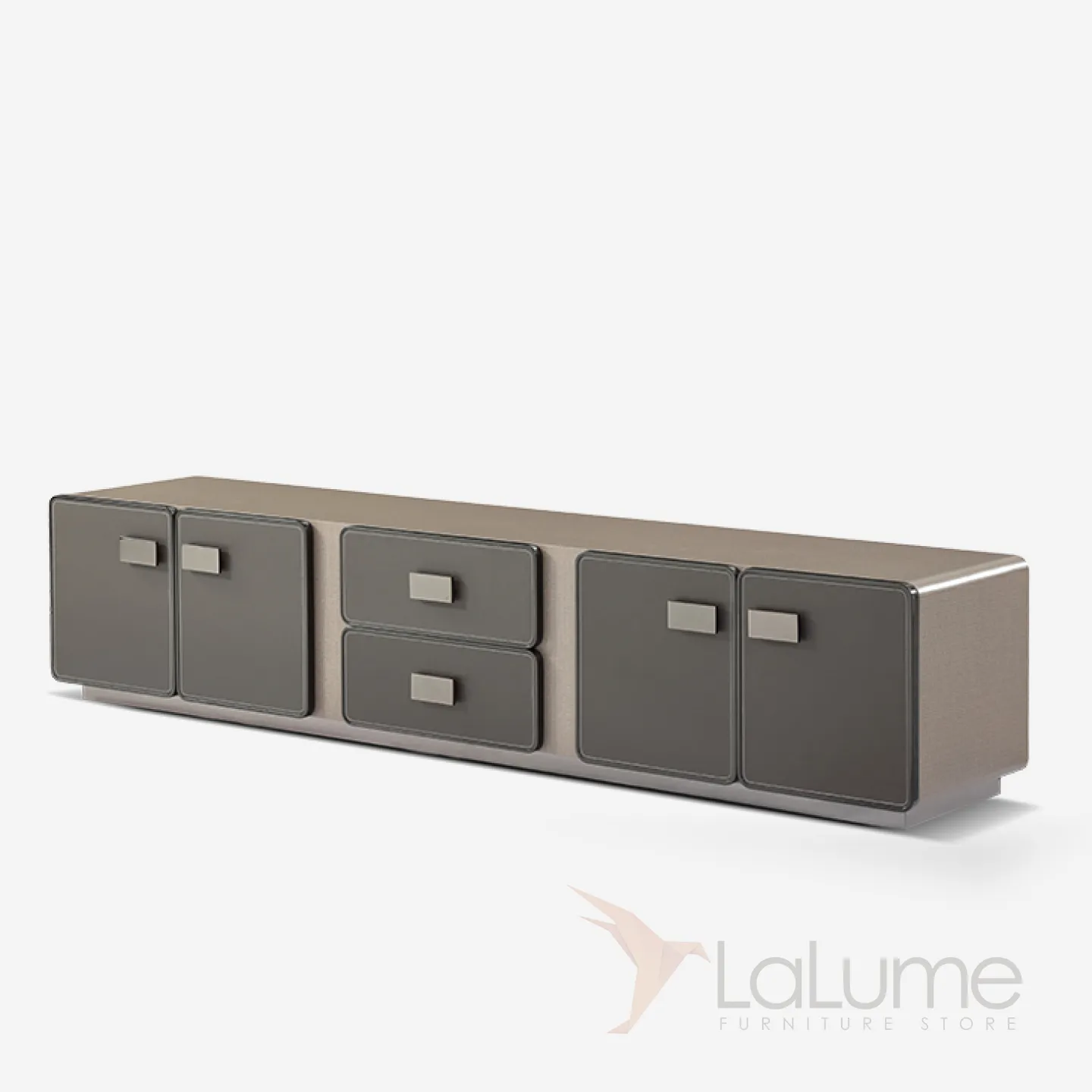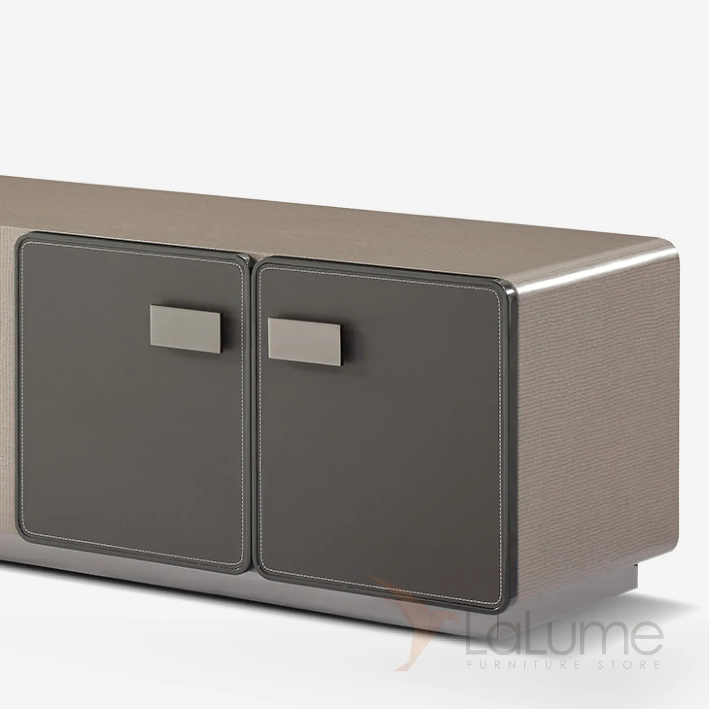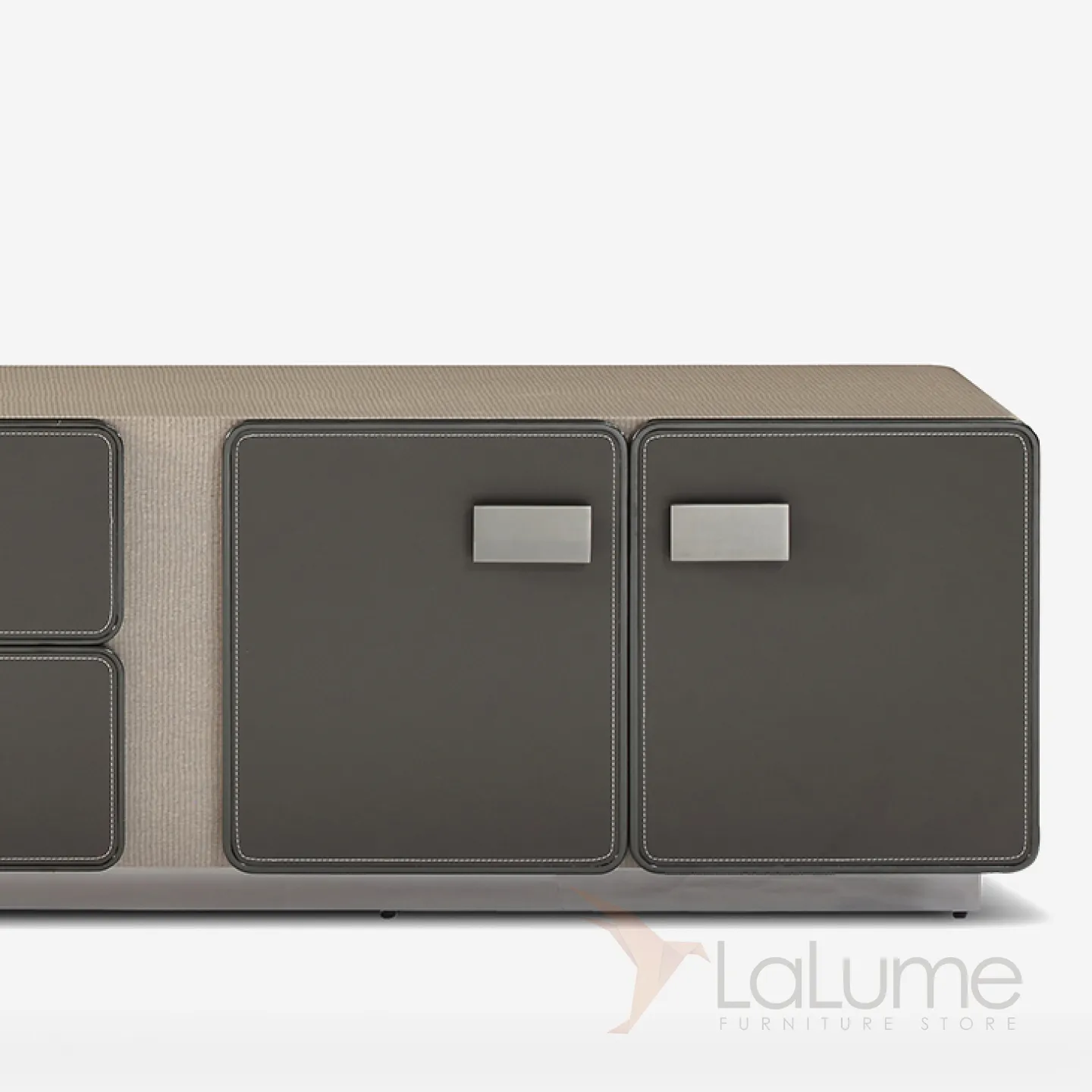 Тумба под телевизор изготовлена из массива розового дерева, а её фасад отделан кожей из микрофибры. Внутри есть четыре секции с дверцами и два выдвижных ящика для хранения вещей.