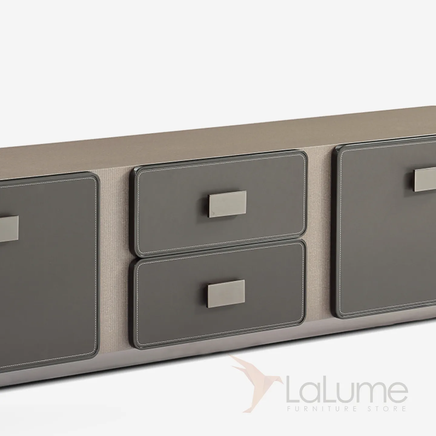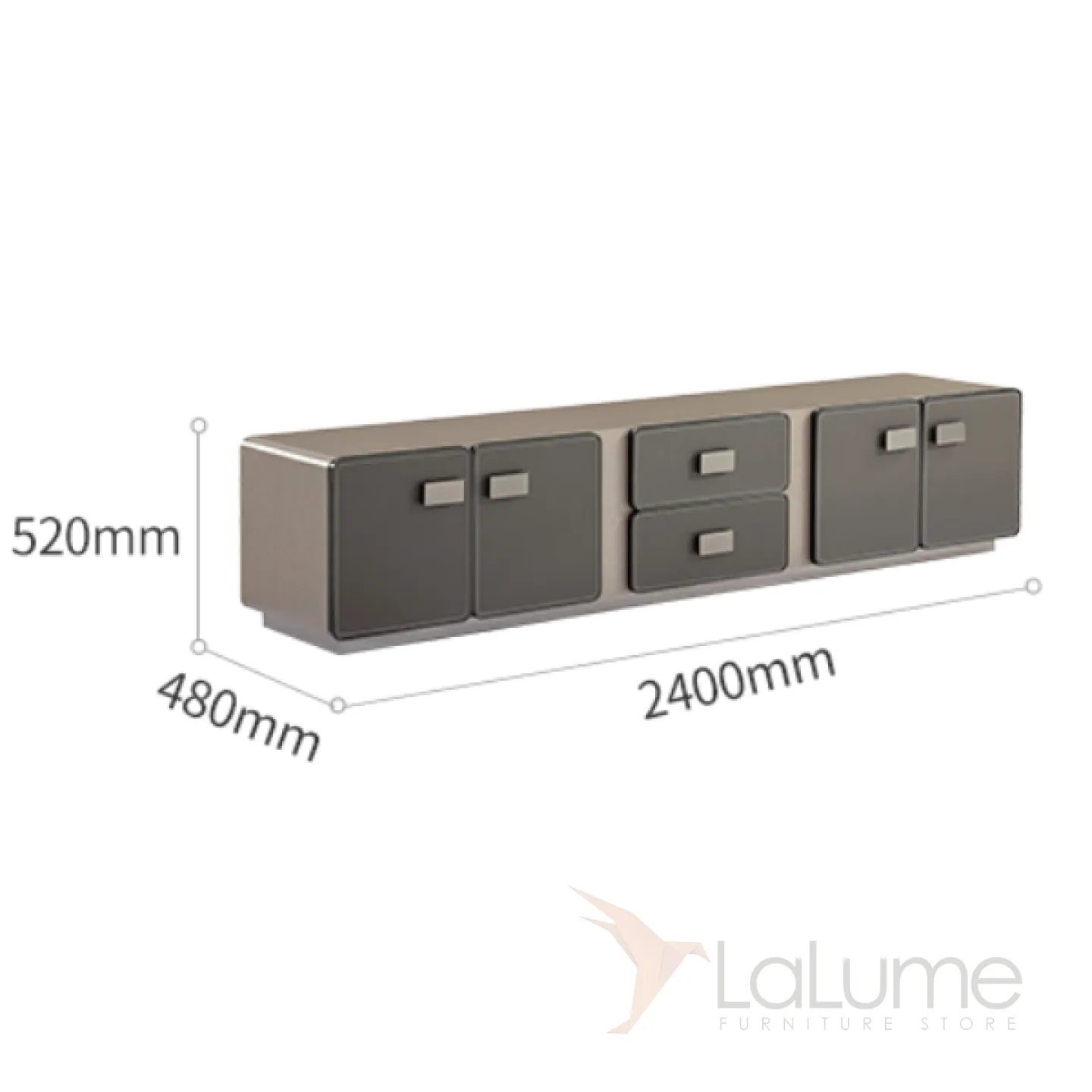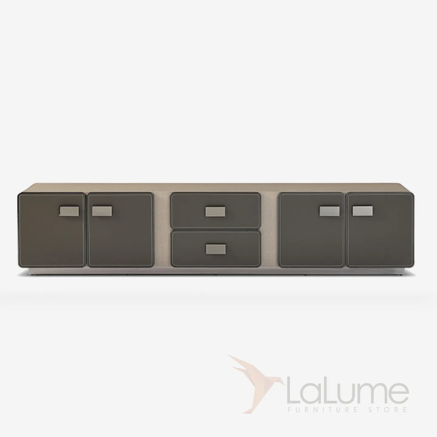 Тумба под телевизор изготовлена из массива розового дерева, а её фасад отделан кожей из микрофибры. Внутри есть четыре секции с дверцами и два выдвижных ящика для хранения вещей.