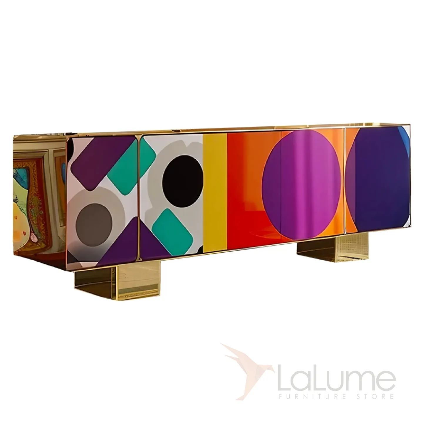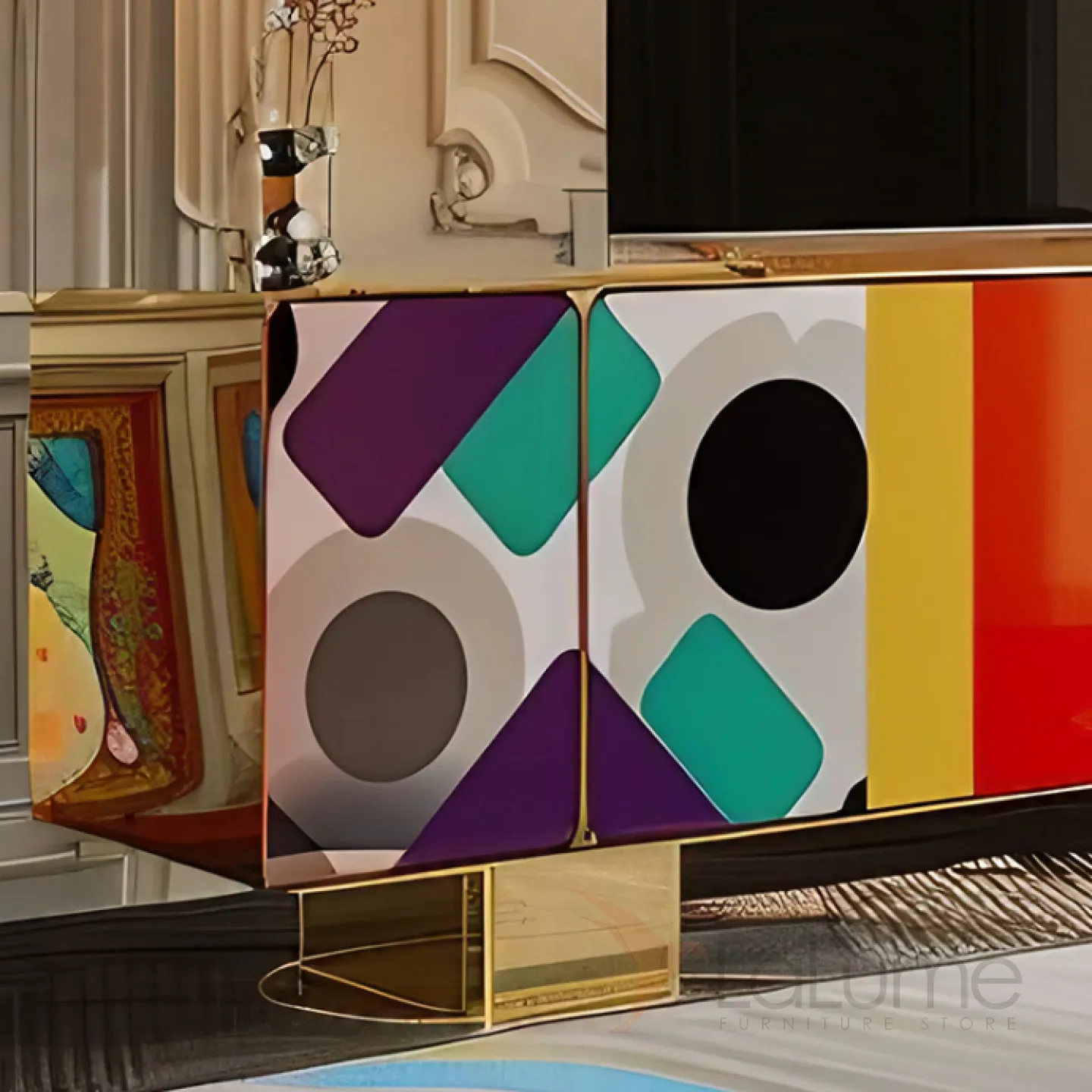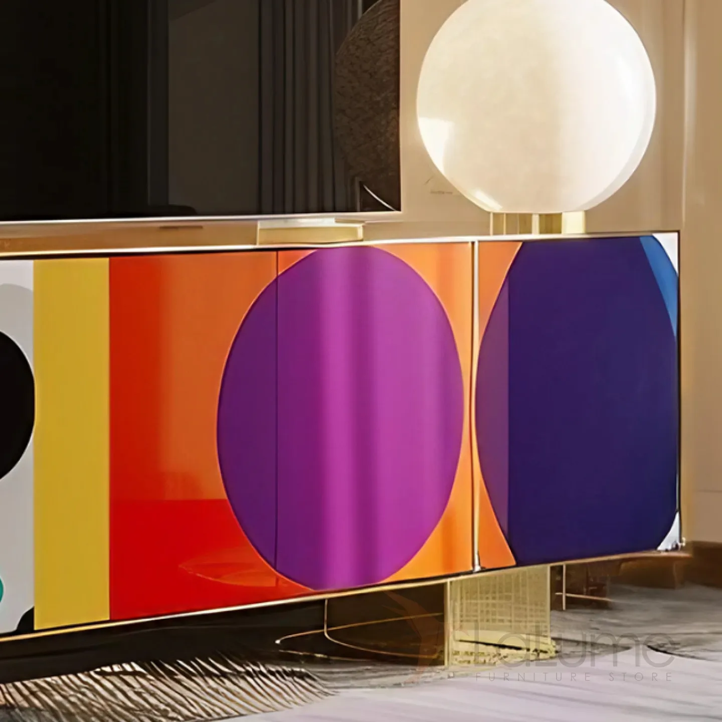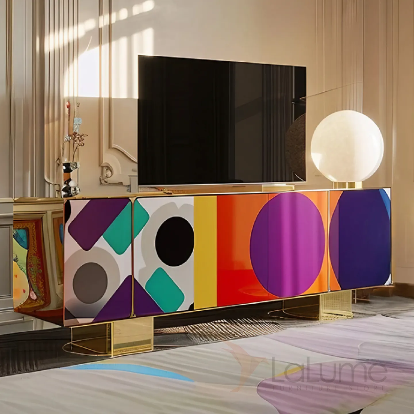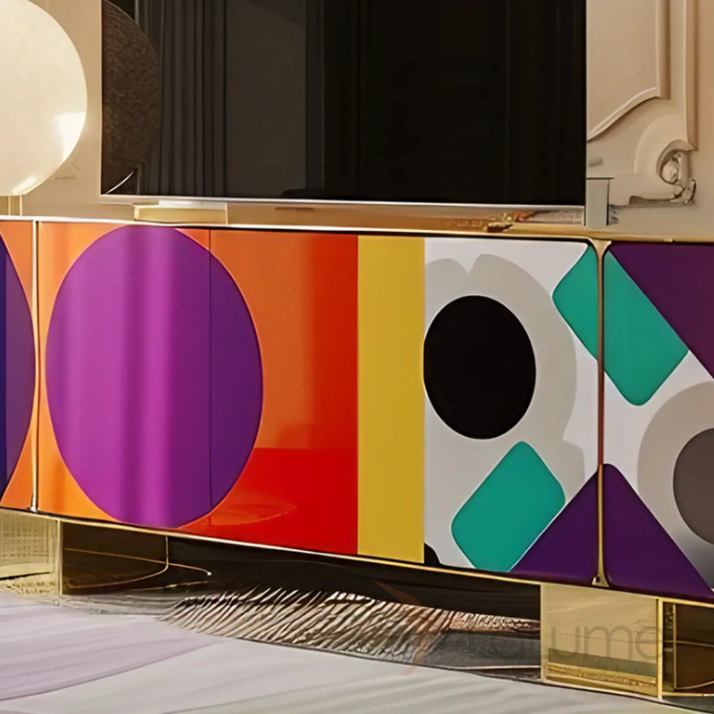 Тумба под телевизор с эффектным рисунком, золотистыми ножками и декоративной отделкой — идеальный выбор для тех, кто ценит современный дизайн и роскошь. Четыре секции с дверцами позволяют удобно разместить и систематизировать вещи.