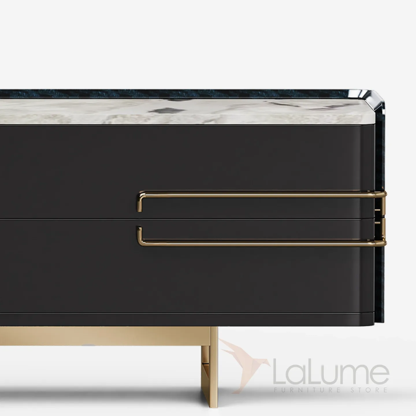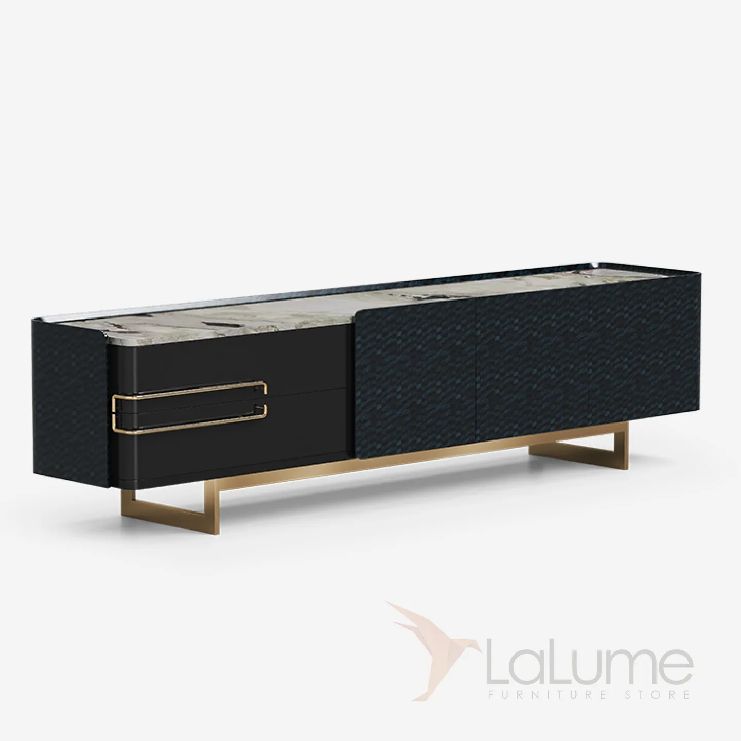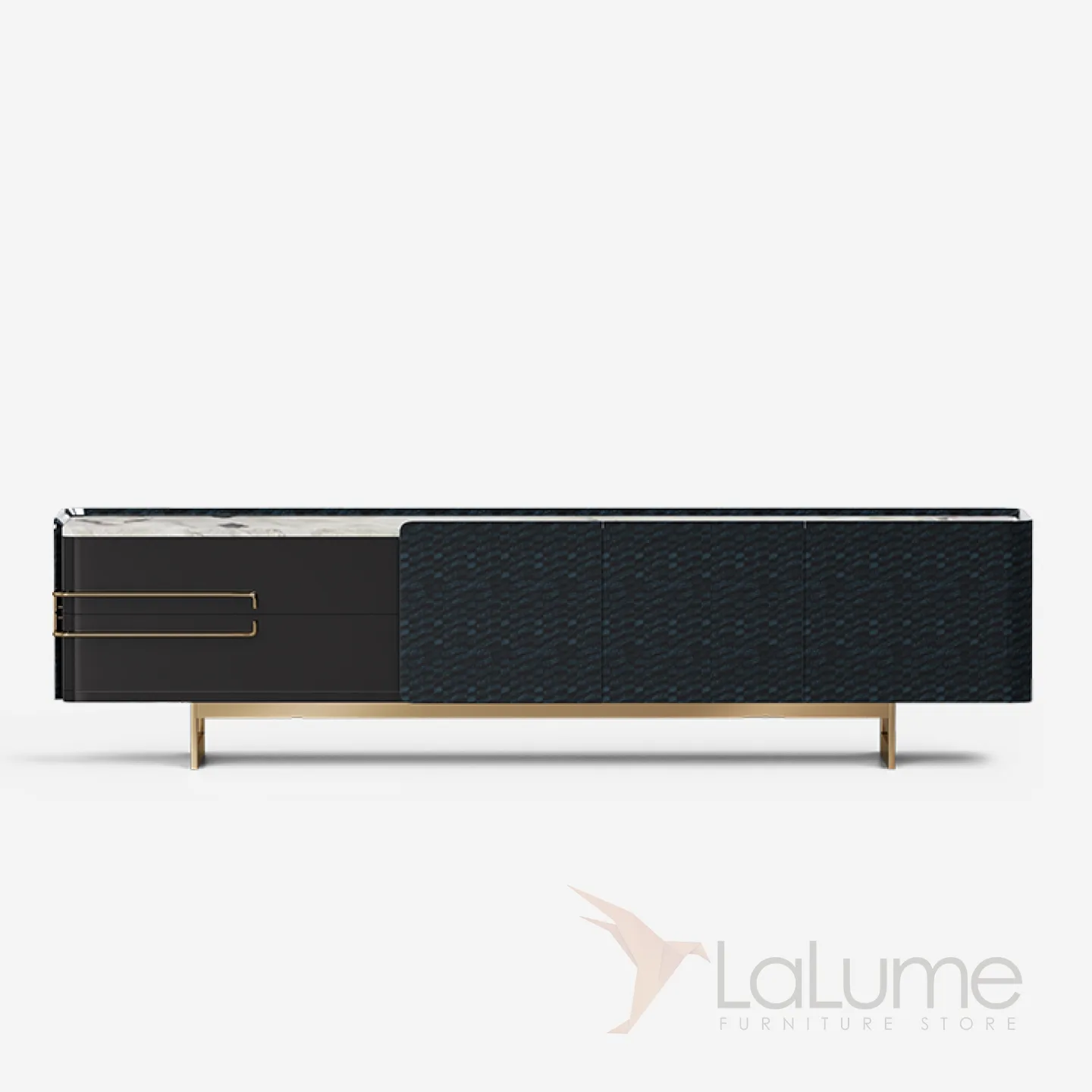 Тумба под телевизор изготовлена из бука и шпона. Столешница выполнена из натурального мрамора. Внутри есть две дверцы и два выдвижных ящика для хранения.