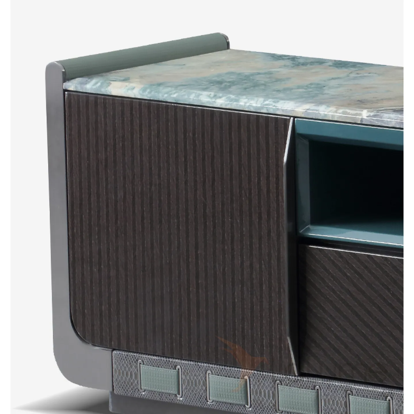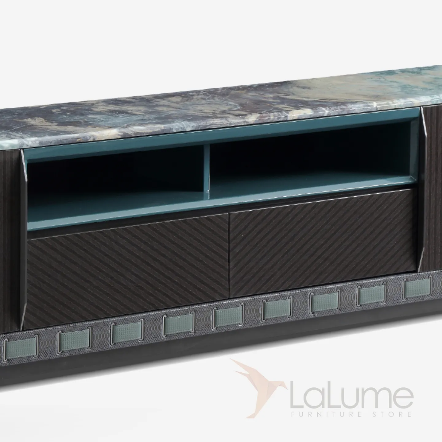 Тумба для телевизора сделана из древесины и древесных материалов. Поверхность выполнена из натурального мрамора. Внутри расположены две дверцы и два ящика с выдвижными механизмами, а также две открытые полки.