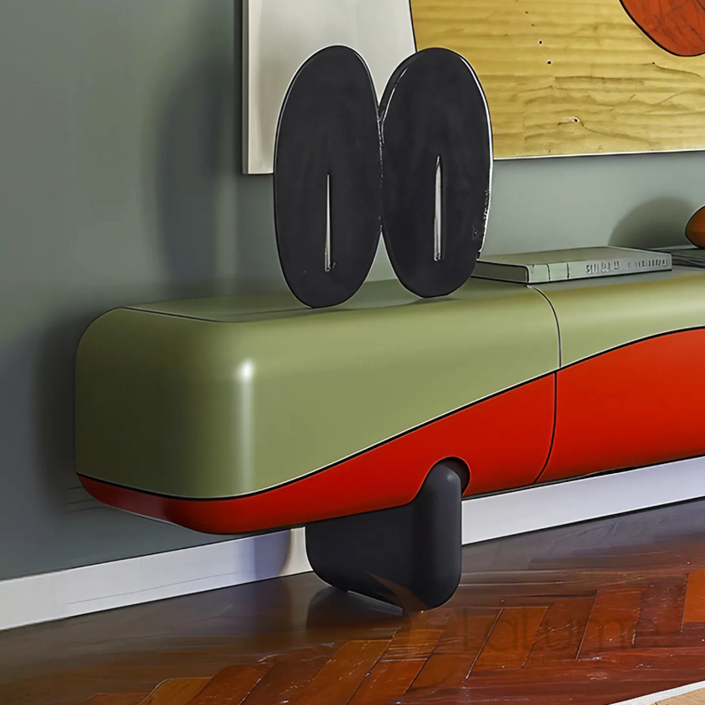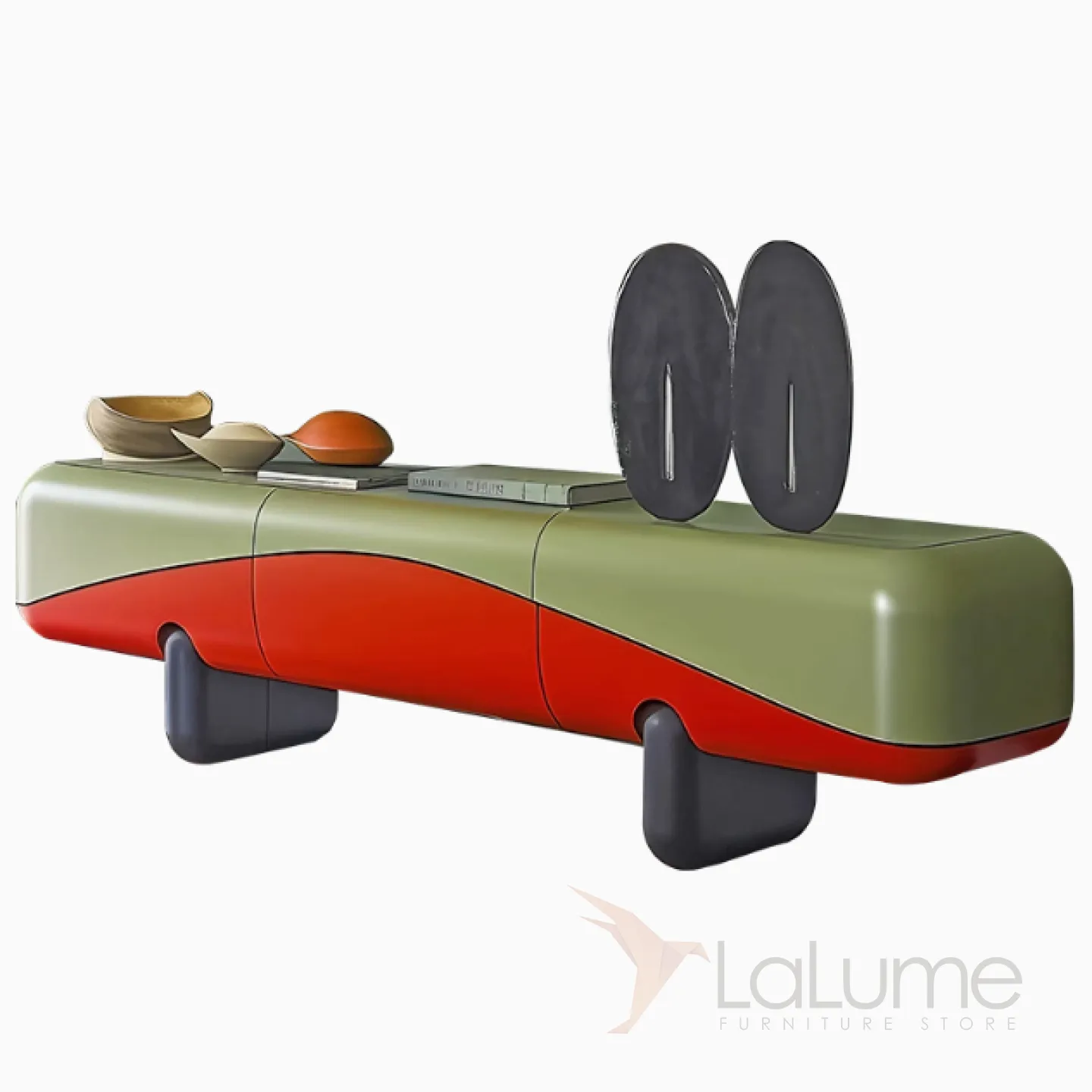 Тумба под телевизор из цельного дерева отличается оригинальным дизайном с мягкими линиями. В ней есть три отделения за открывающимися дверцами, предназначенные для хранения разных предметов.