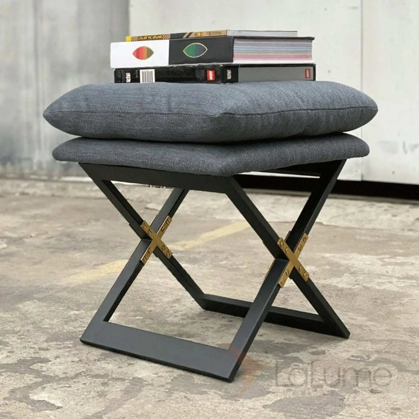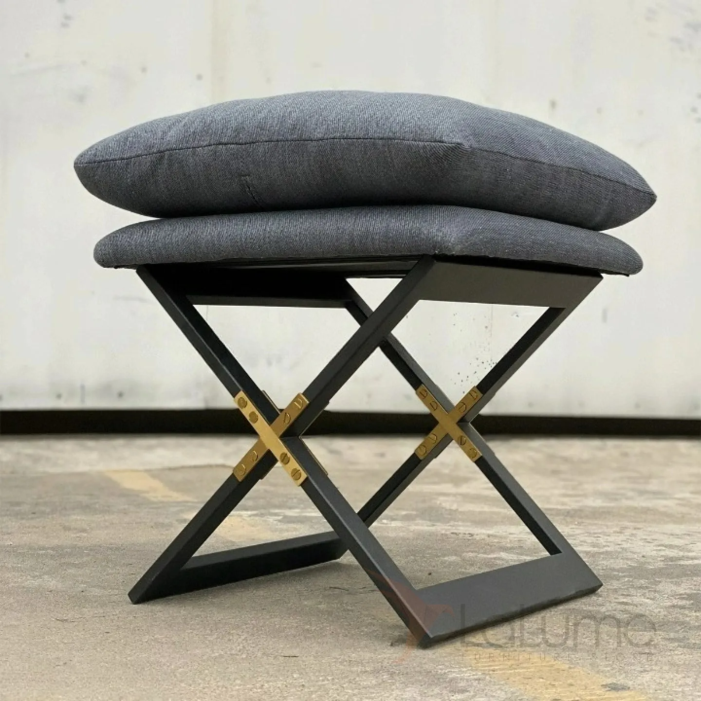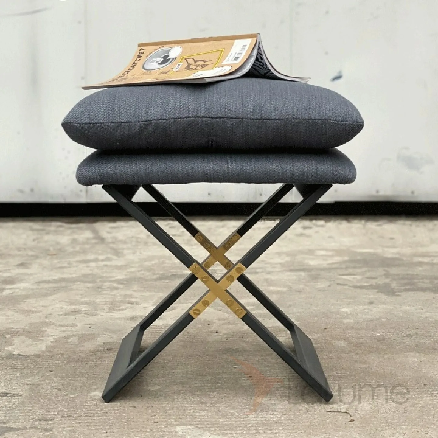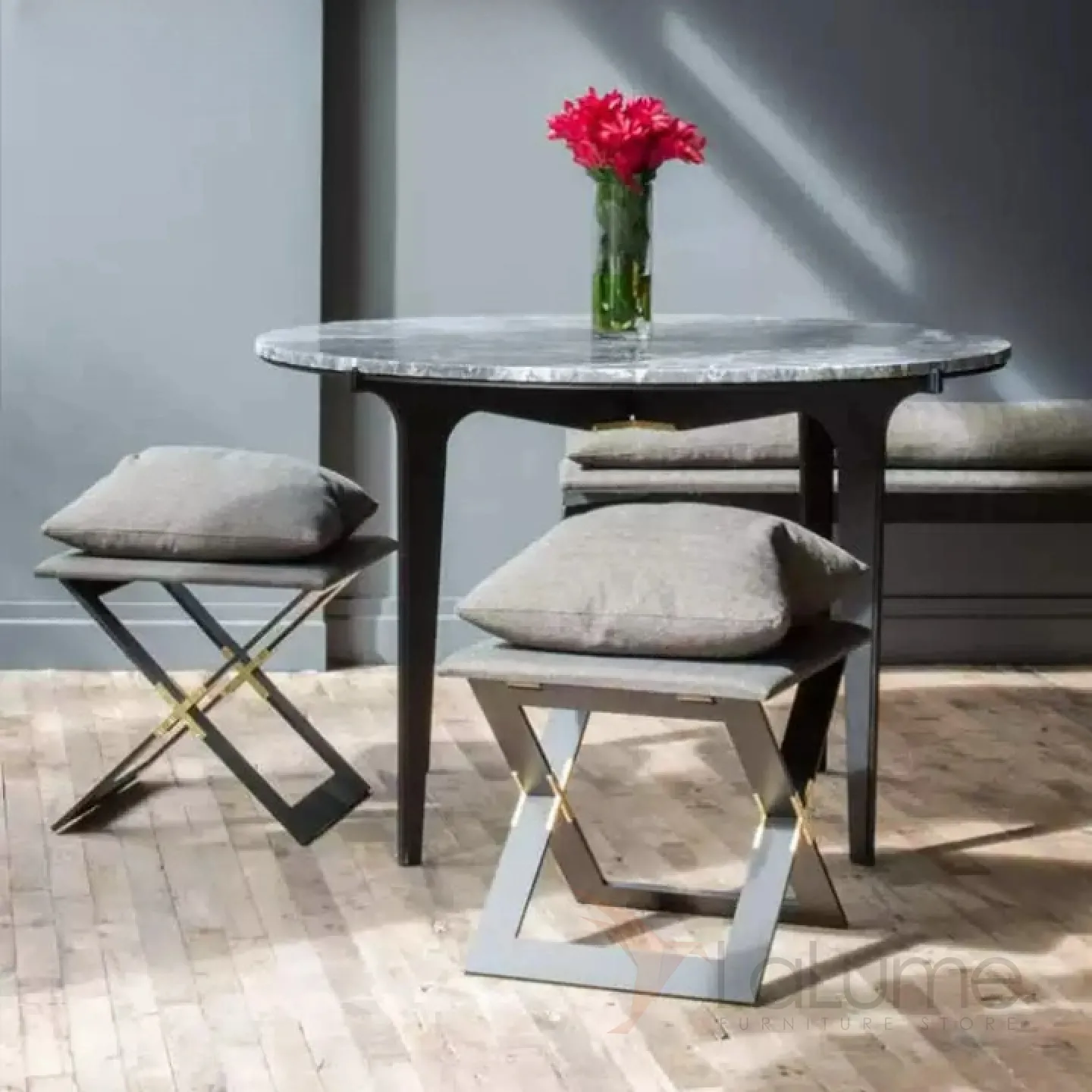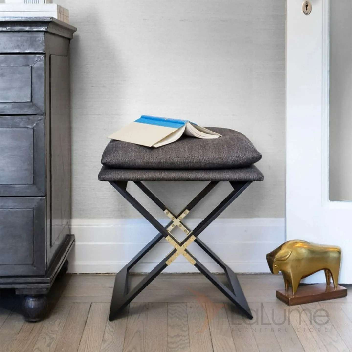 Стильный легкий табурет из нержавеющей стали и дерева. Сидушка с поролоновым наполнителем оформлена натуральным льняным текстилем.