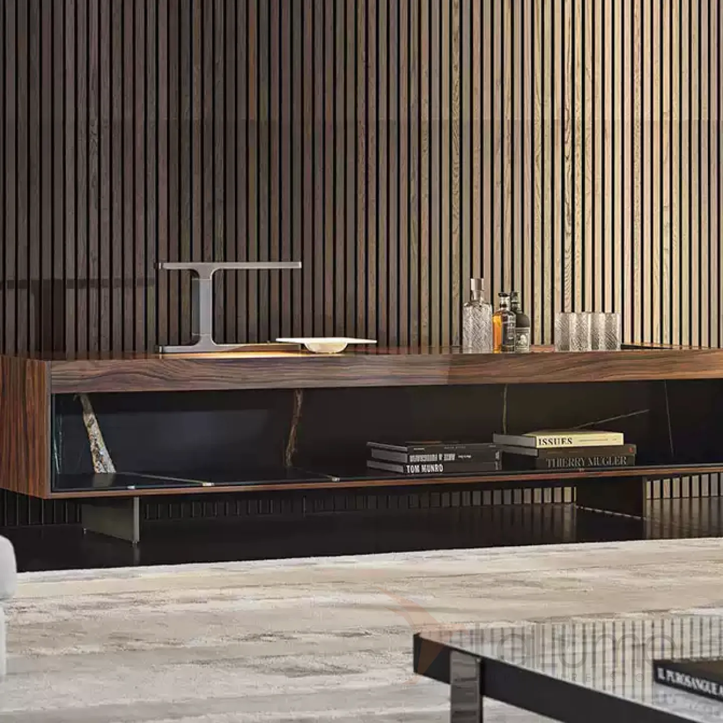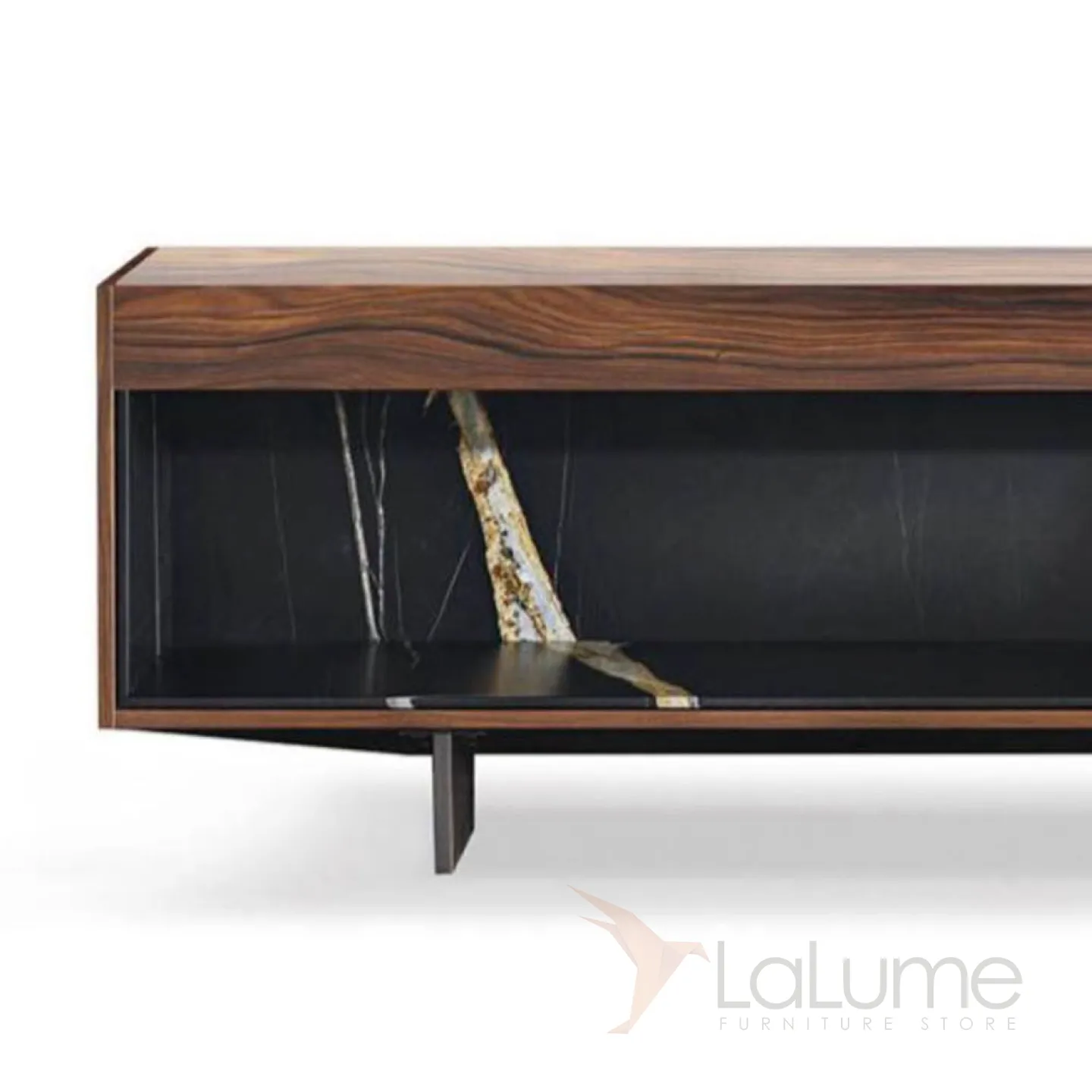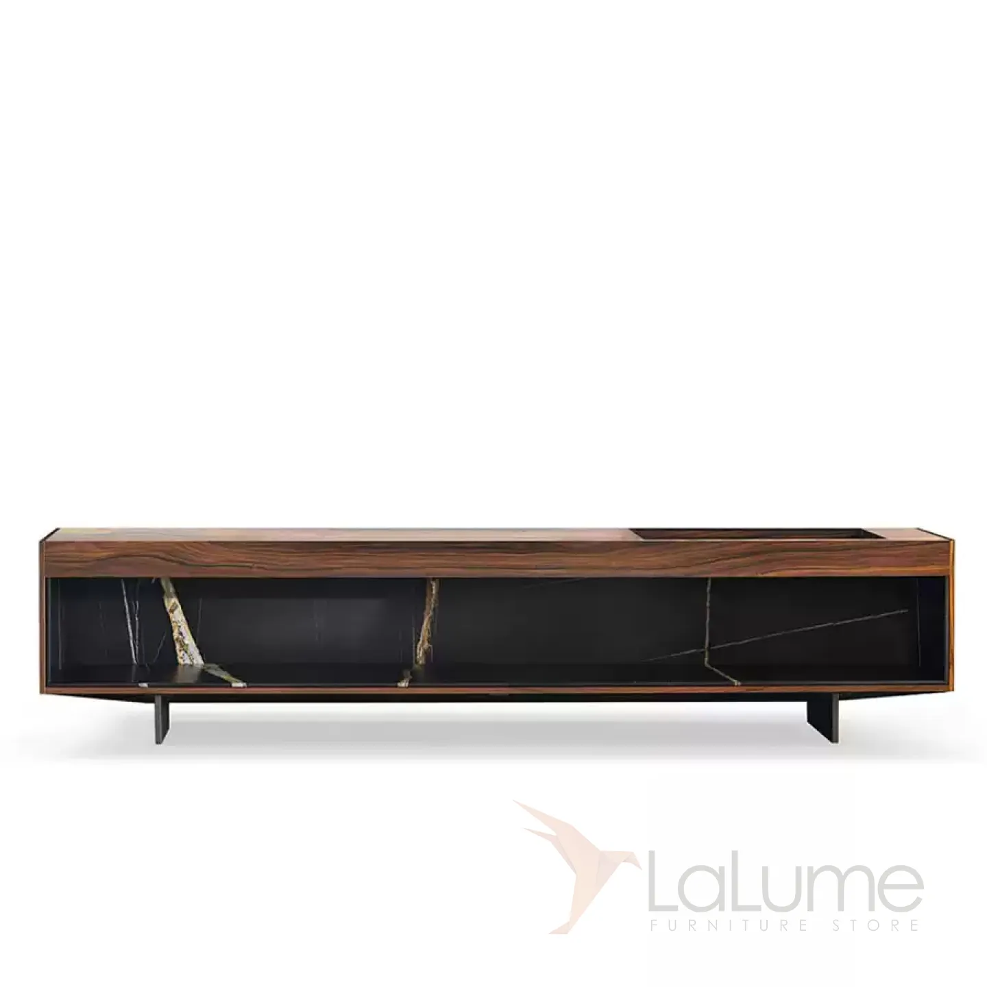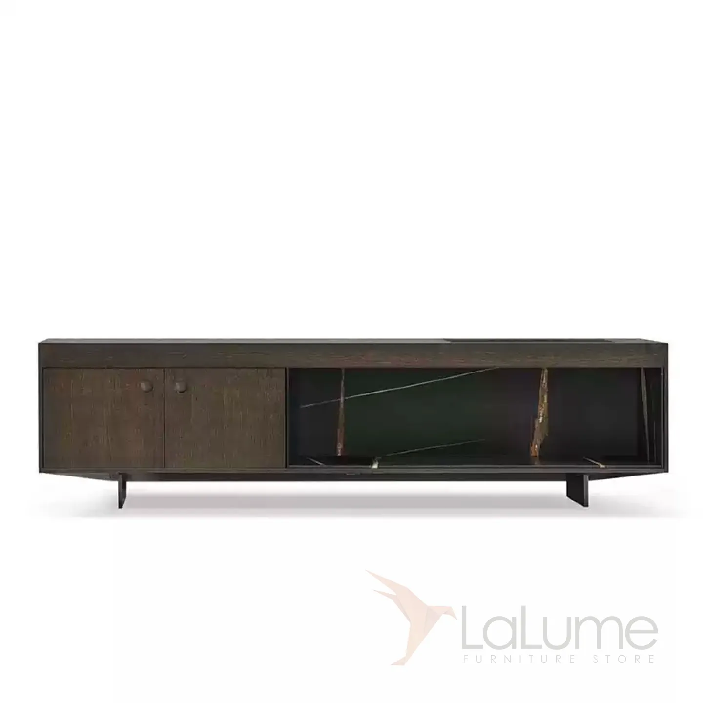 Современная ТВ-тумба из массива чёрного ореха в двух вариациях: с открытыми полками или закрытой дверками. Металлические ножки из нержавеющей стали добавляют лёгкости конструкции.