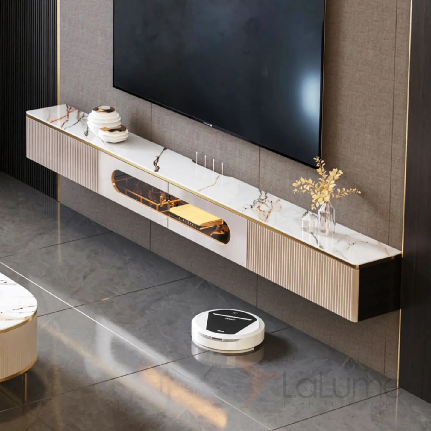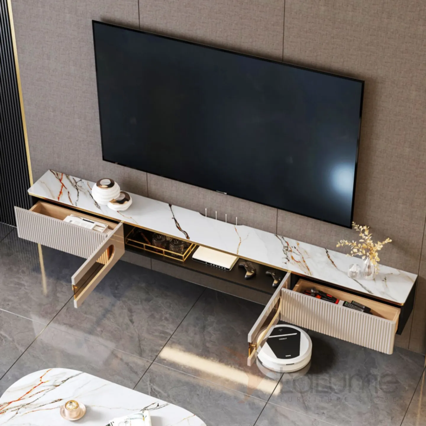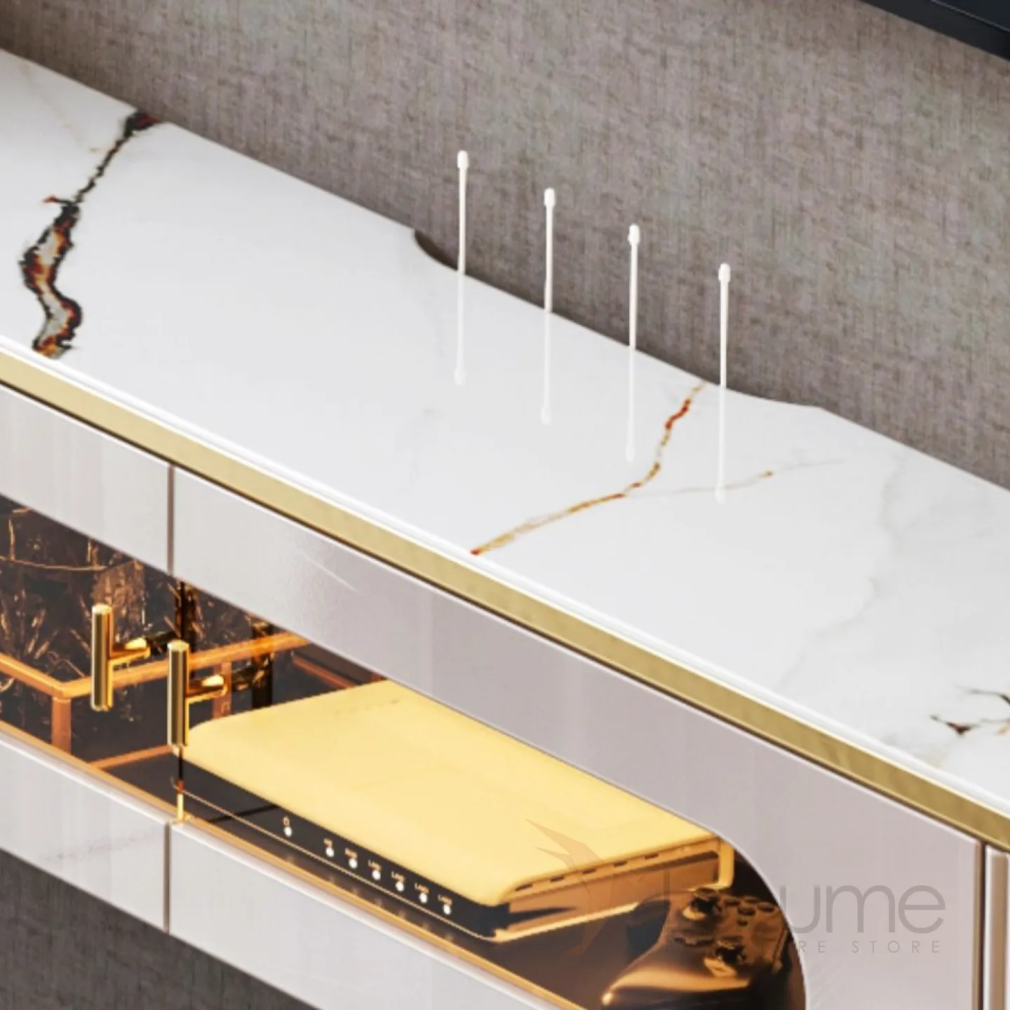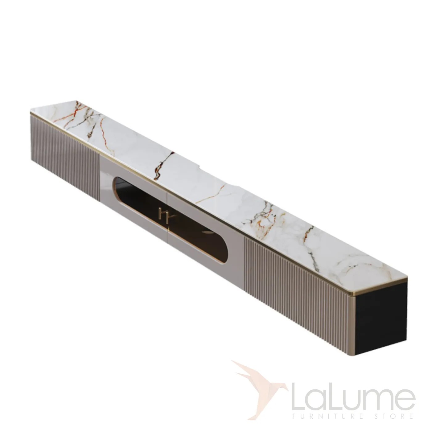Современная ТВ-тумба выполнена из массива дерева с мраморной столешницей, которая придаёт ей элегантный и изысканный вид. Внутри тумбы есть два вместительных ящика и две дверцы с вставками из закалённого стекла, что добавляет ей функциональности и стиля.