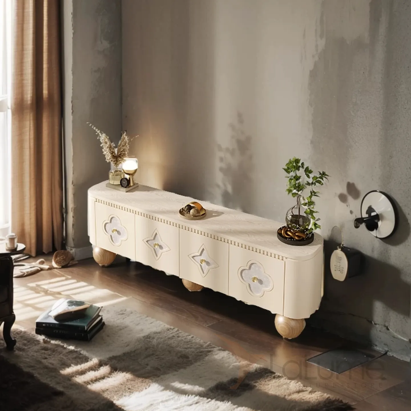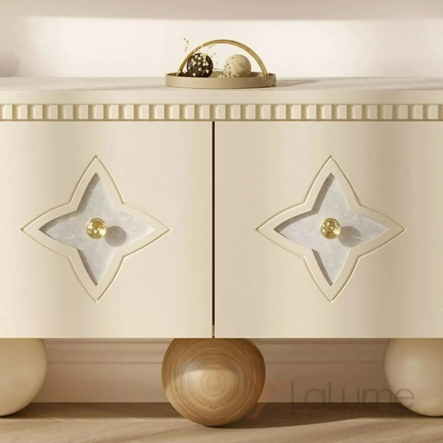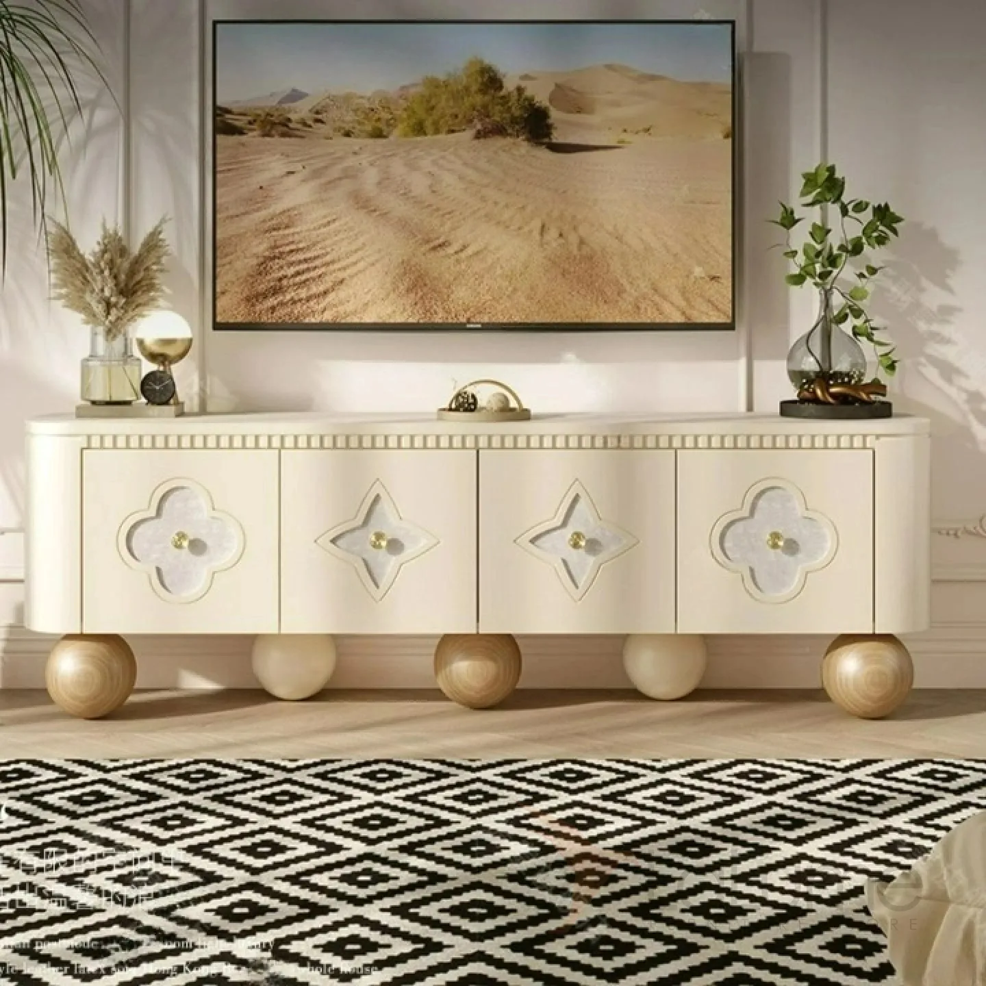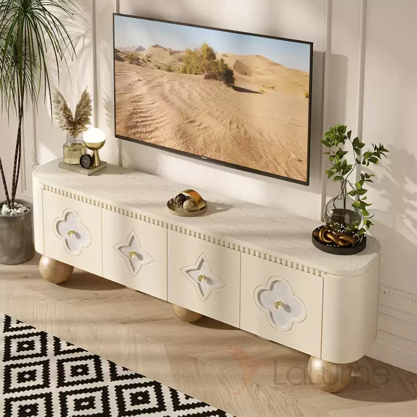 Элегантная тумба под телевизор из качественной древесины с изящными круглыми ножками. Дверцы украшены натуральным перламутром. Внутри достаточно места для хранения благодаря четырем дверцам. Доступны разные цветовые решения.
