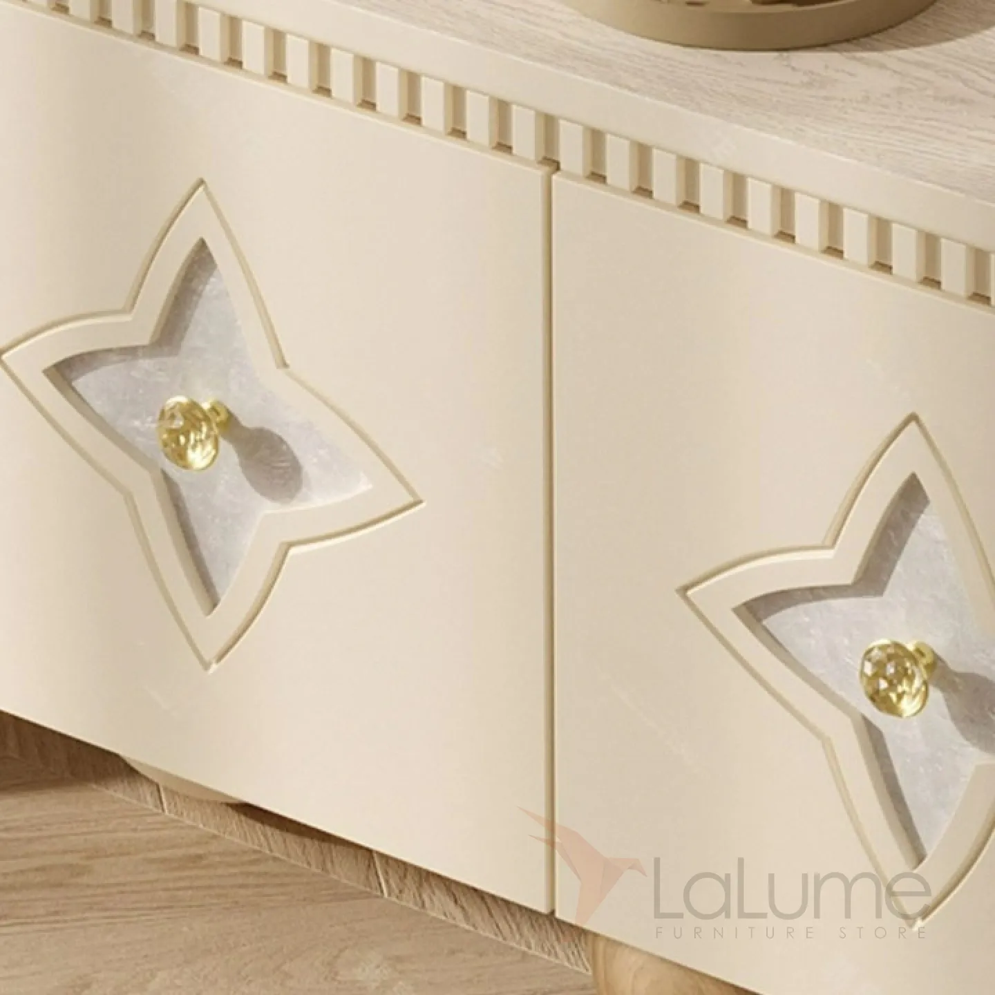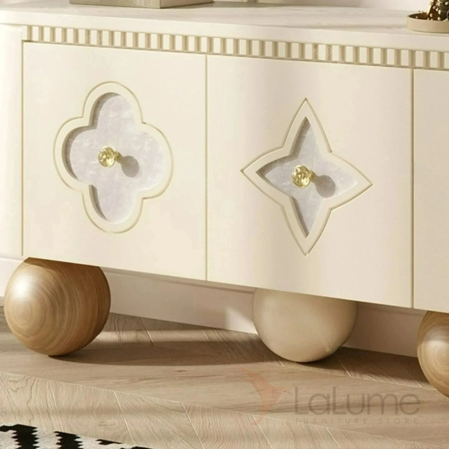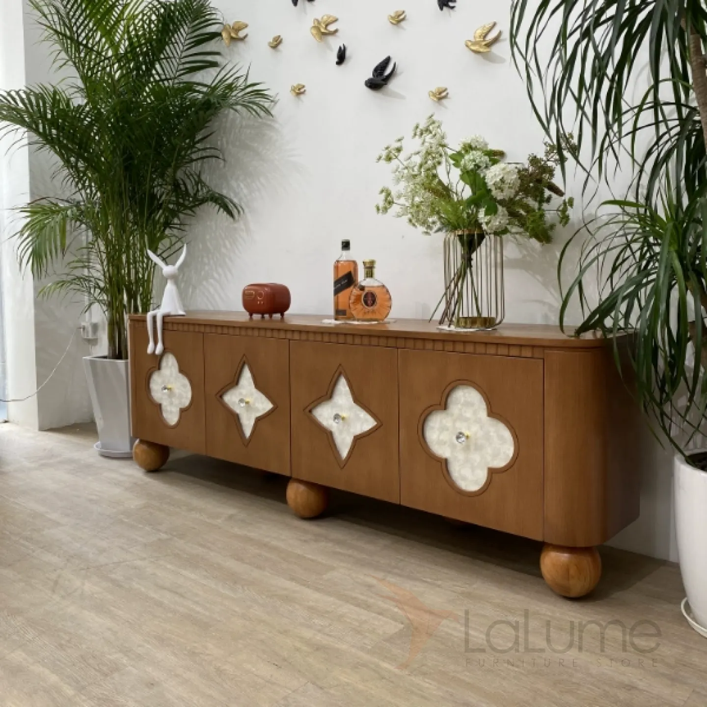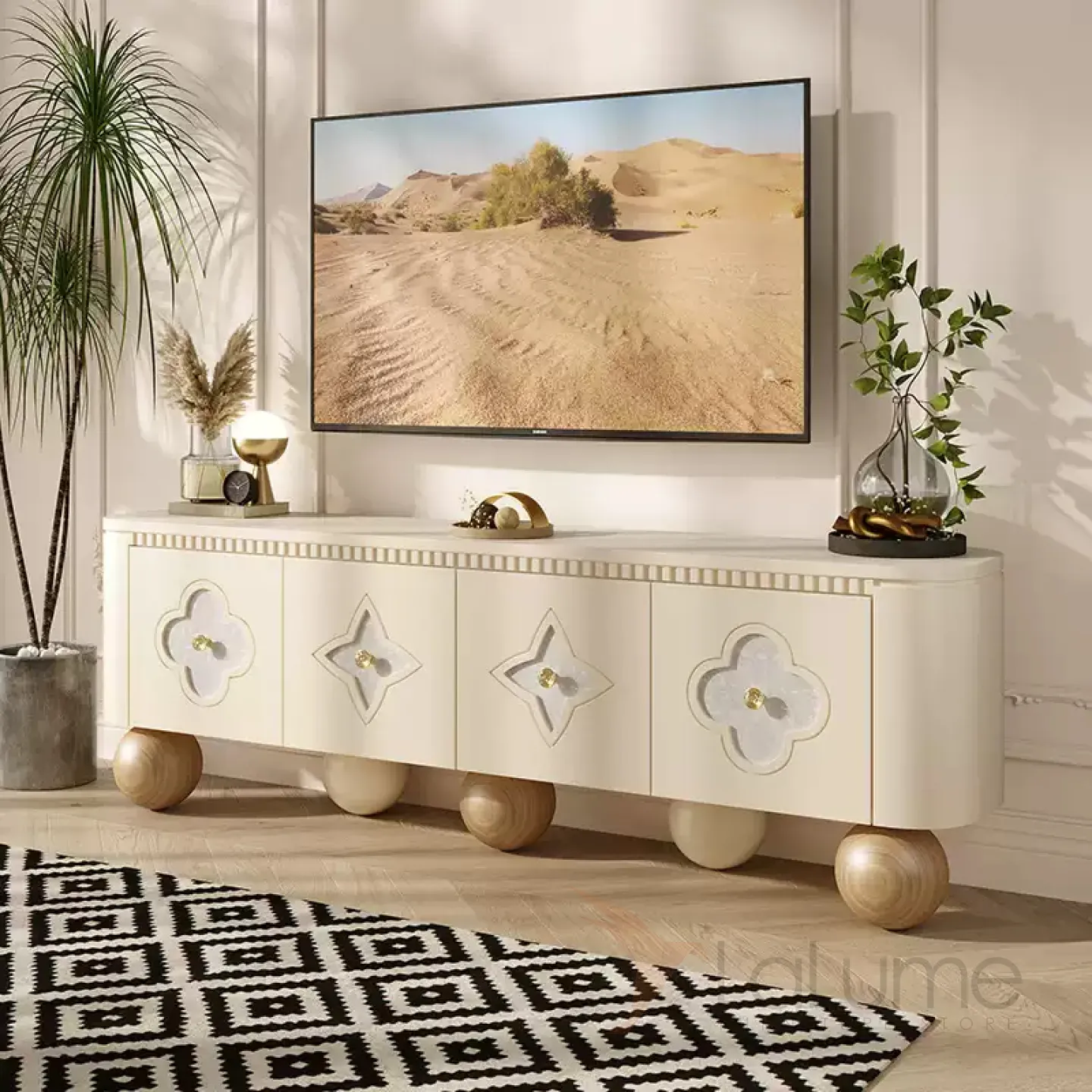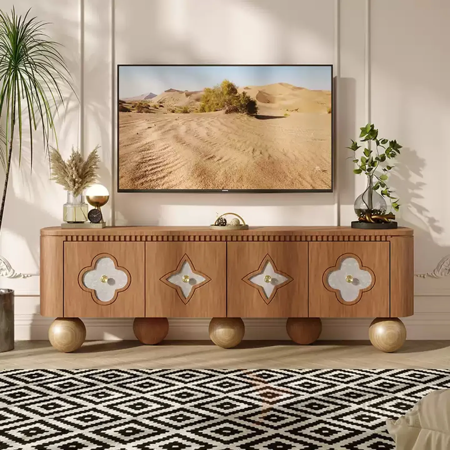 Элегантная тумба под телевизор из качественной древесины с изящными круглыми ножками. Дверцы украшены натуральным перламутром. Внутри достаточно места для хранения благодаря четырем дверцам. Доступны разные цветовые решения.