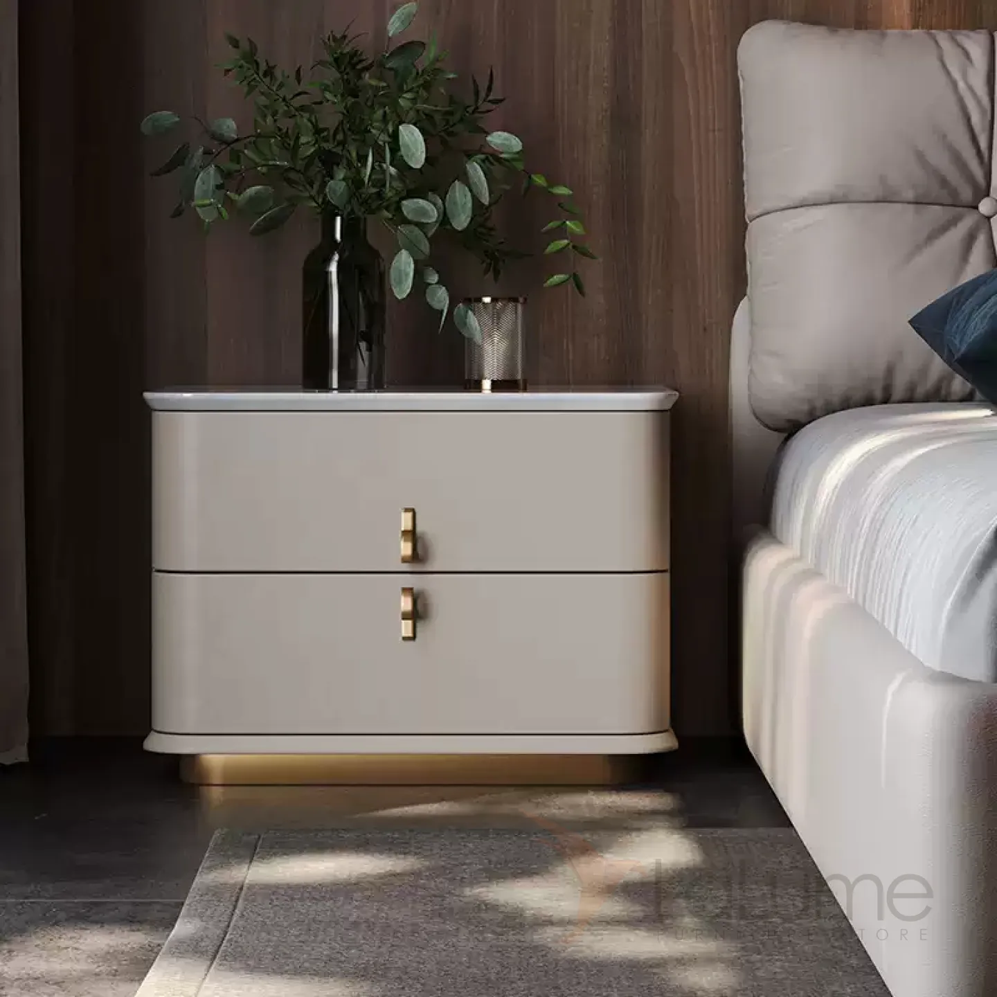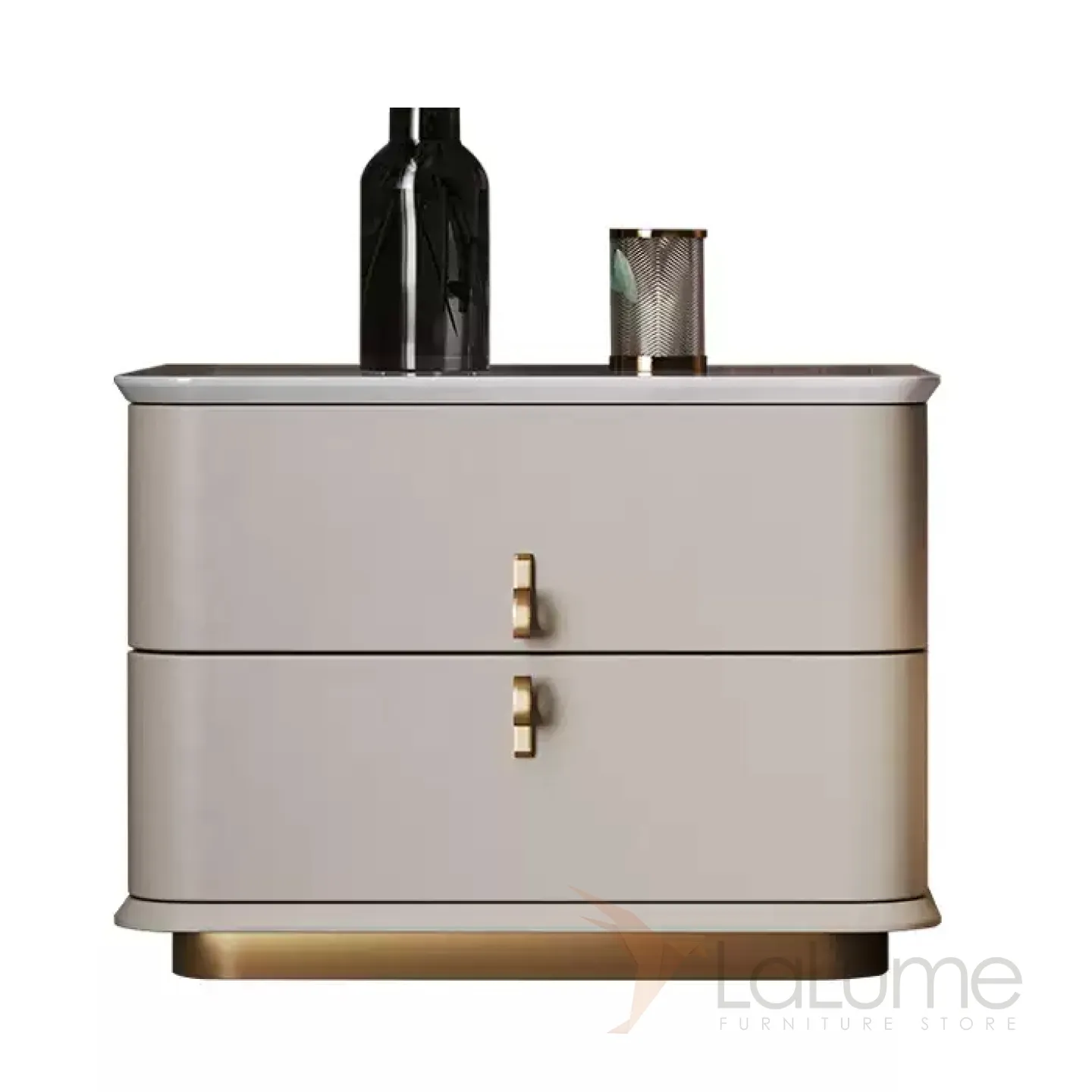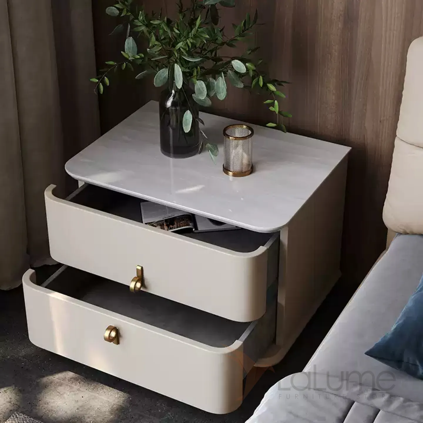 Прикроватная тумба с основанием из нержавеющей стали доступна в двух цветах. Каркас выполнен из дерева, столешница может быть из мрамора или чёрного ореха. Внутри — два выдвижных ящика. Вы можете выбрать один из двух размеров.