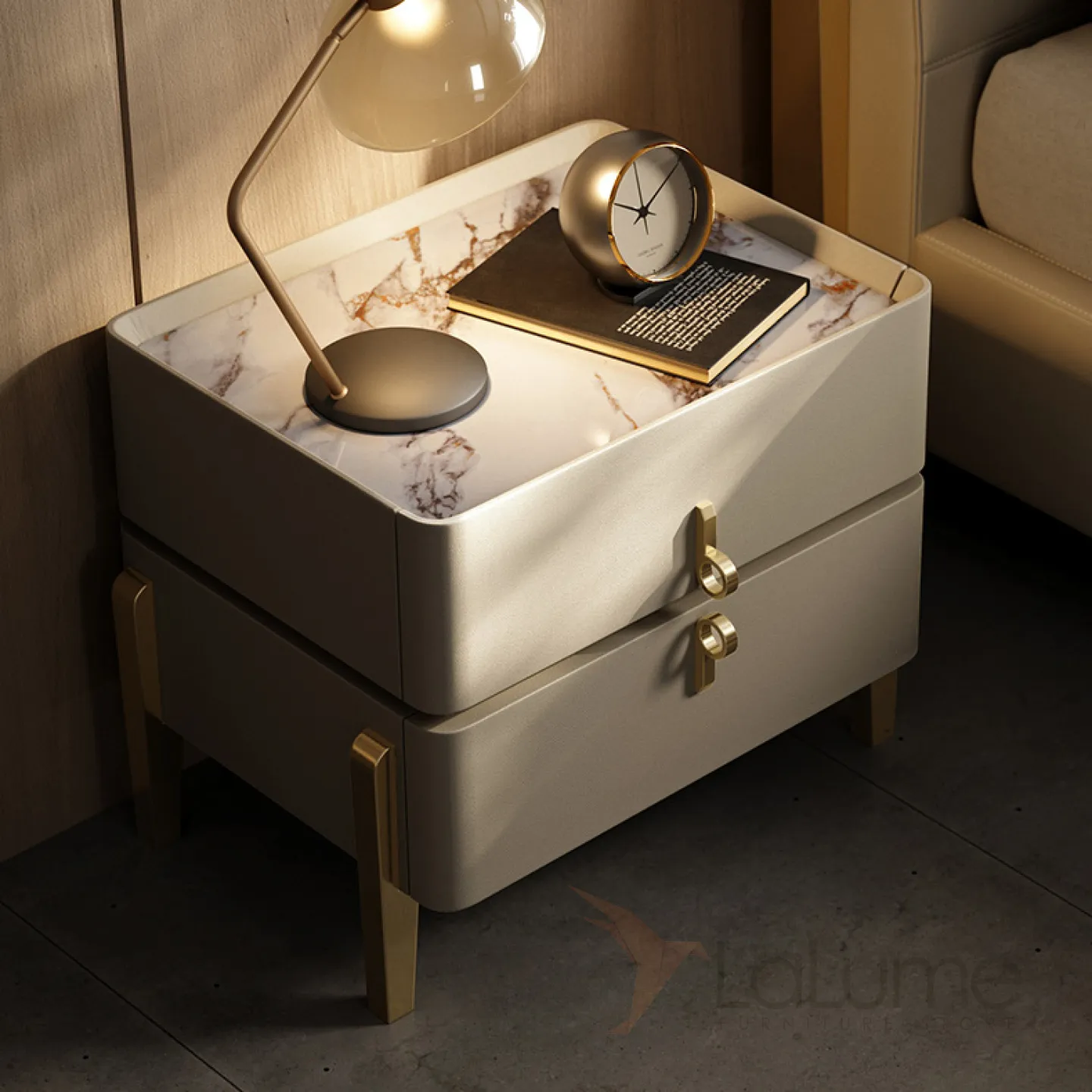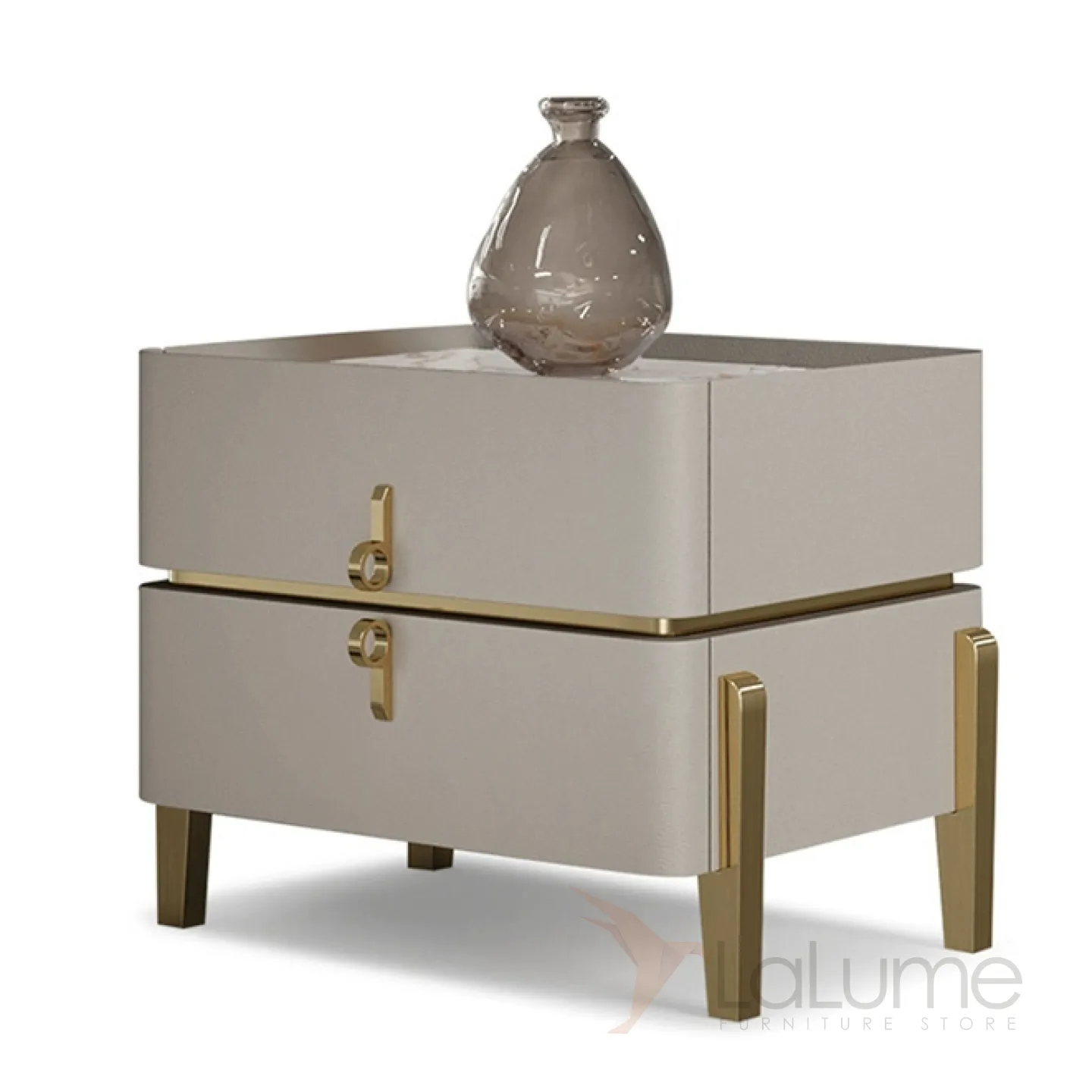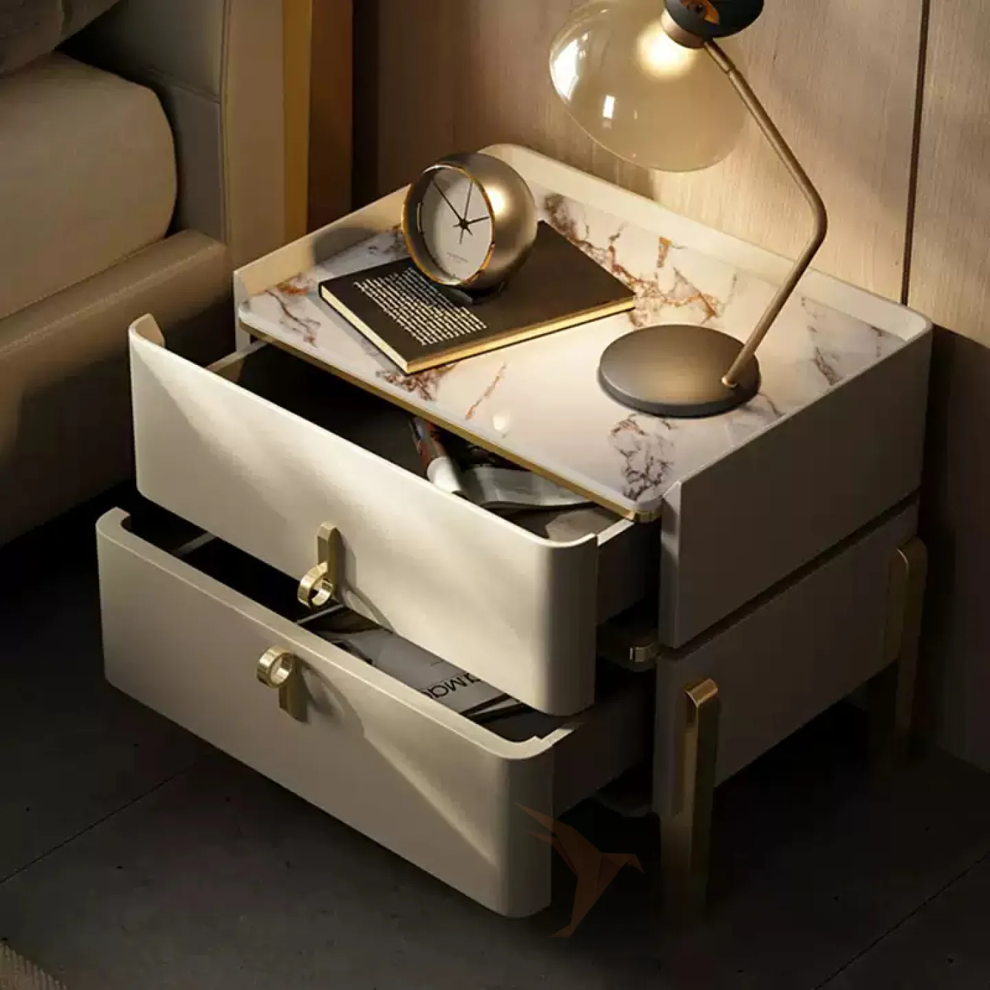 Прикроватная тумба, имеет основание из металла и деревянную столешницу, покрытую кожей. Верхняя часть тумбы выполнена из мрамора. Внутри тумбы есть два ящика, которые можно выдвигать.