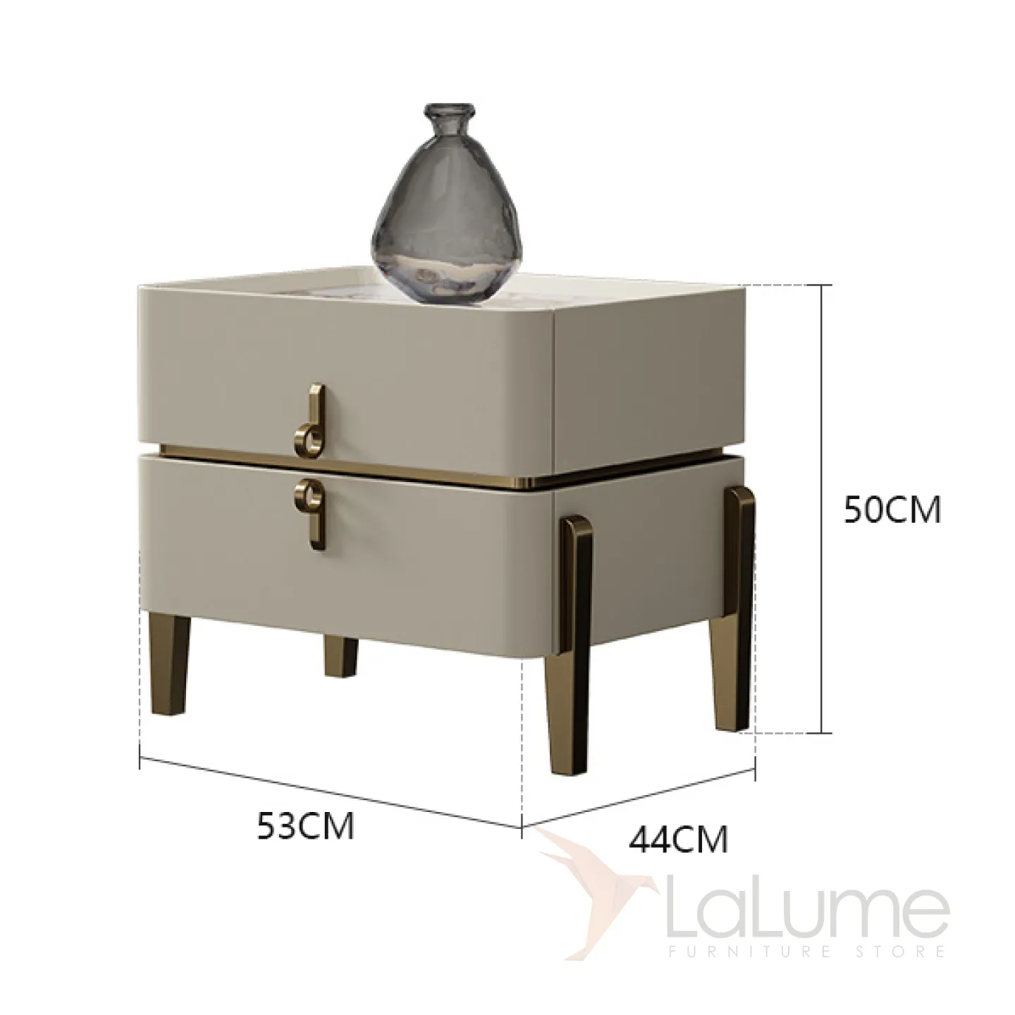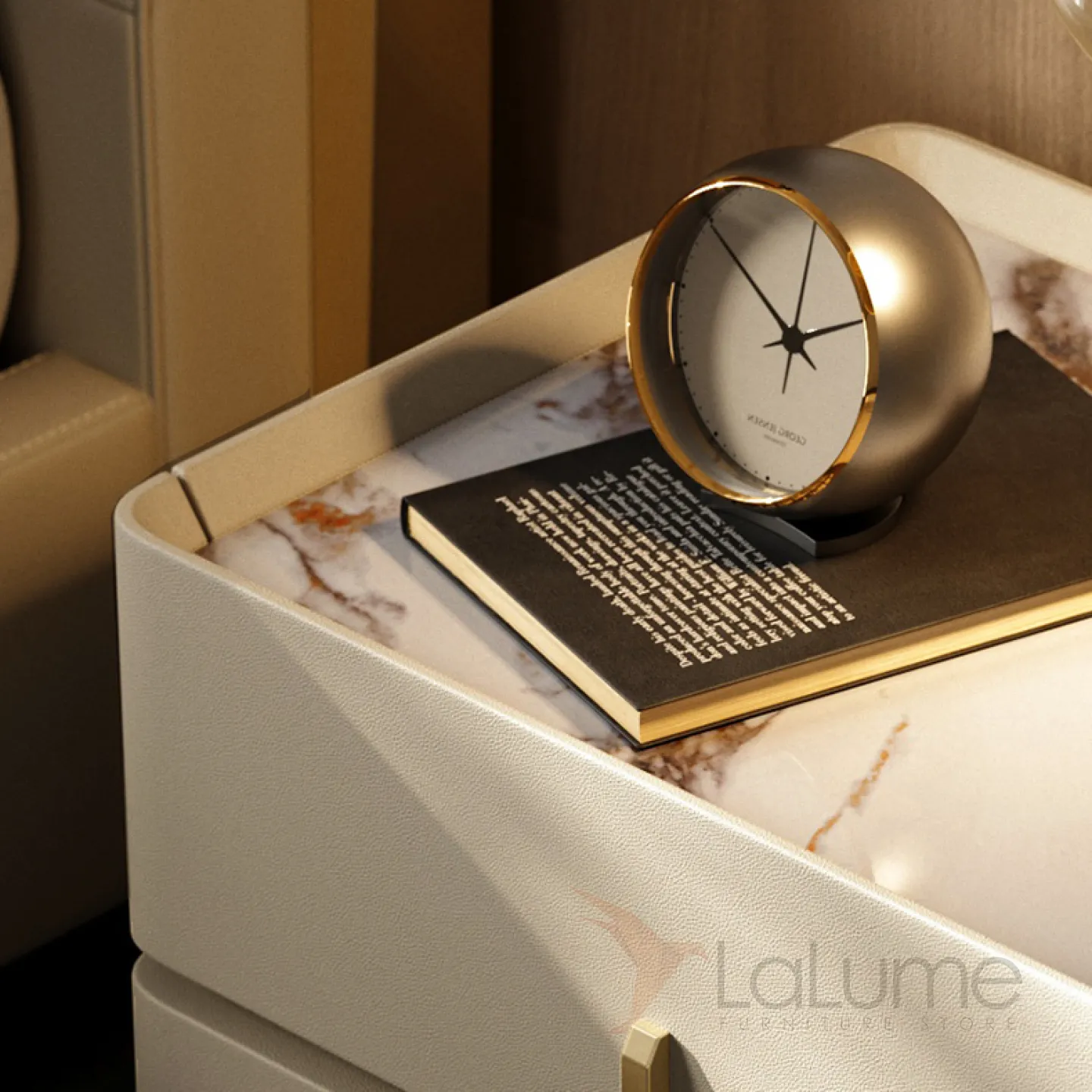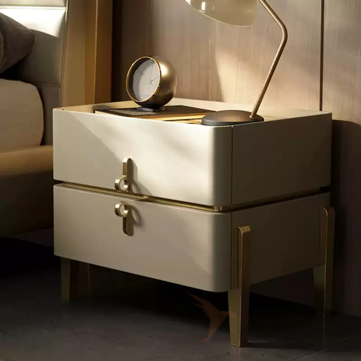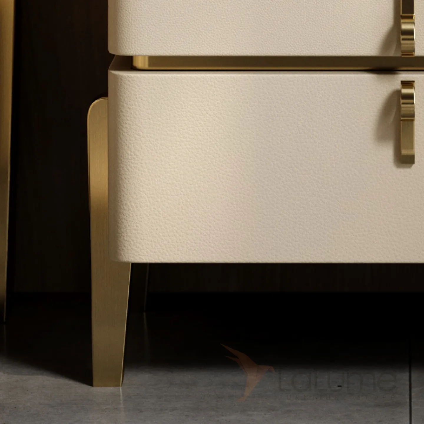 Прикроватная тумба, имеет основание из металла и деревянную столешницу, покрытую кожей. Верхняя часть тумбы выполнена из мрамора. Внутри тумбы есть два ящика, которые можно выдвигать.