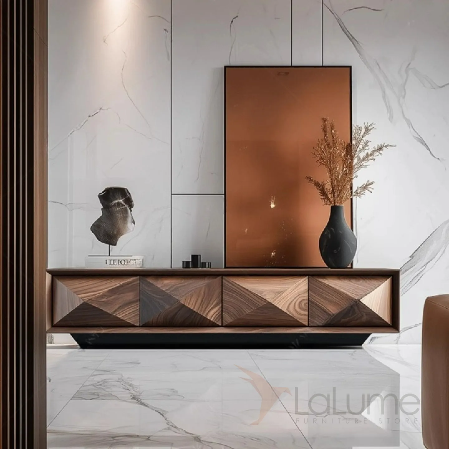 Резной комод из дерева ореха станет ярким акцентом в любом интерьере. Он оснащен четырьмя выдвижными ящиками с оригинальной фактурой фасада.