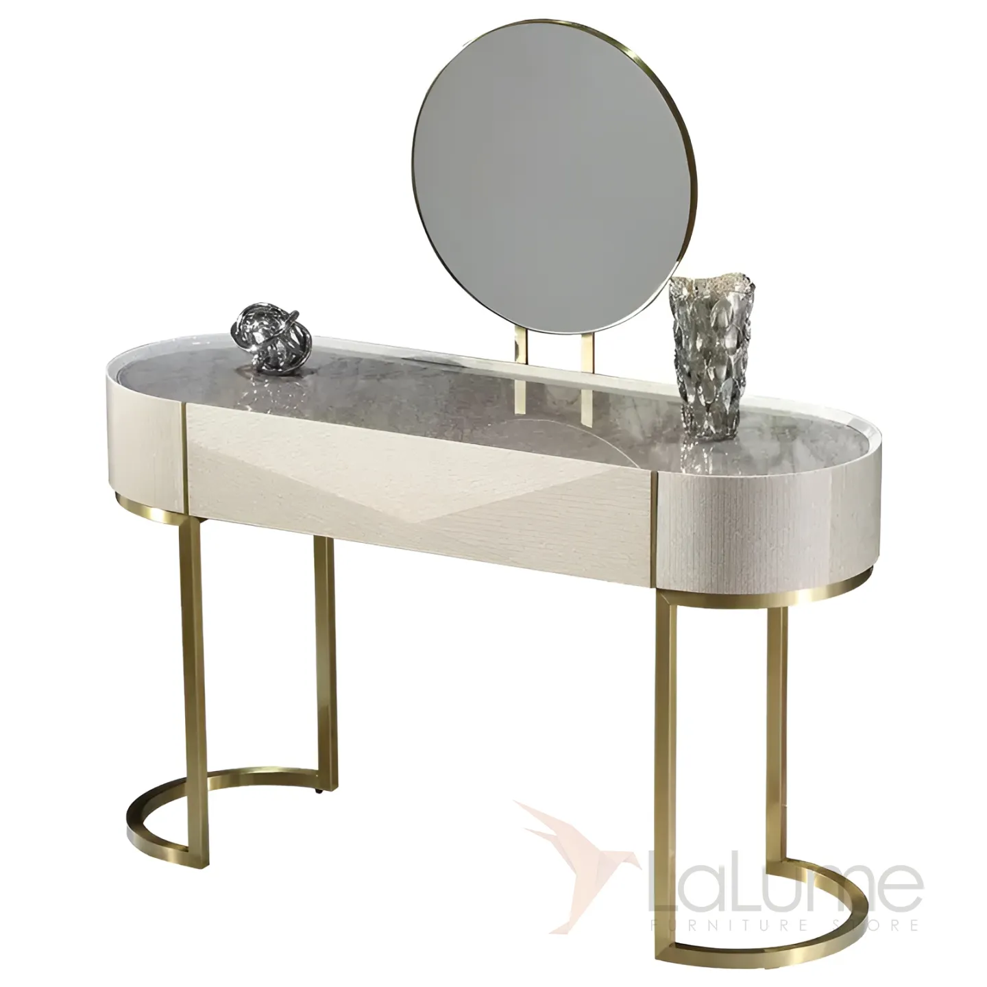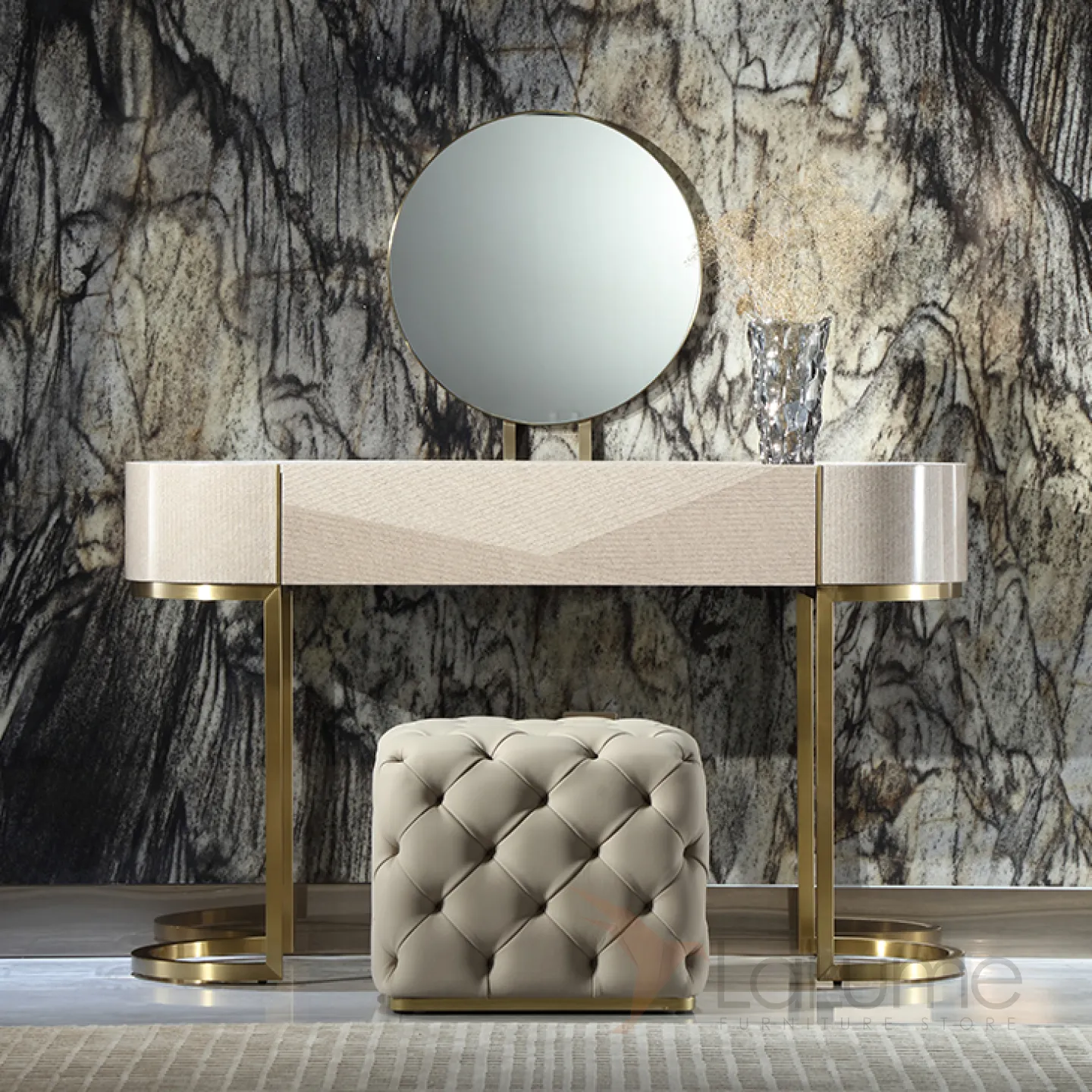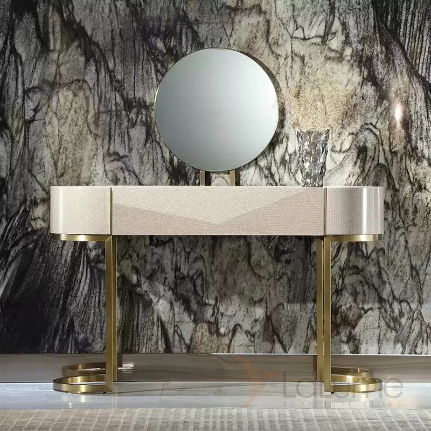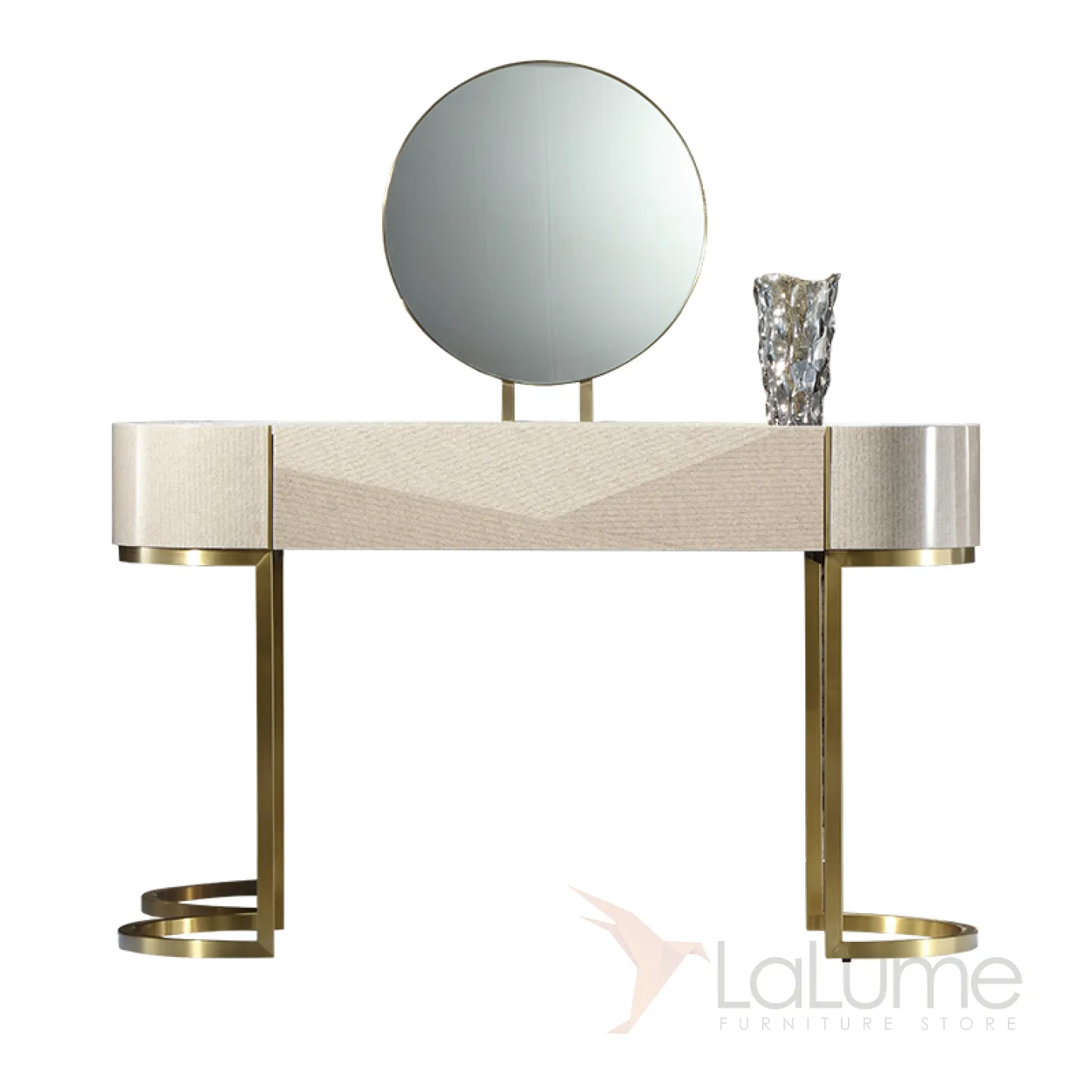 Туалетный столик с зеркалом в золотистых оттенках создан из латуни и красного дерева с декоративным покрытием. Его безупречный дизайн и элегантная форма, а также продуманная функциональность не оставят равнодушной ни одну его владелицу.