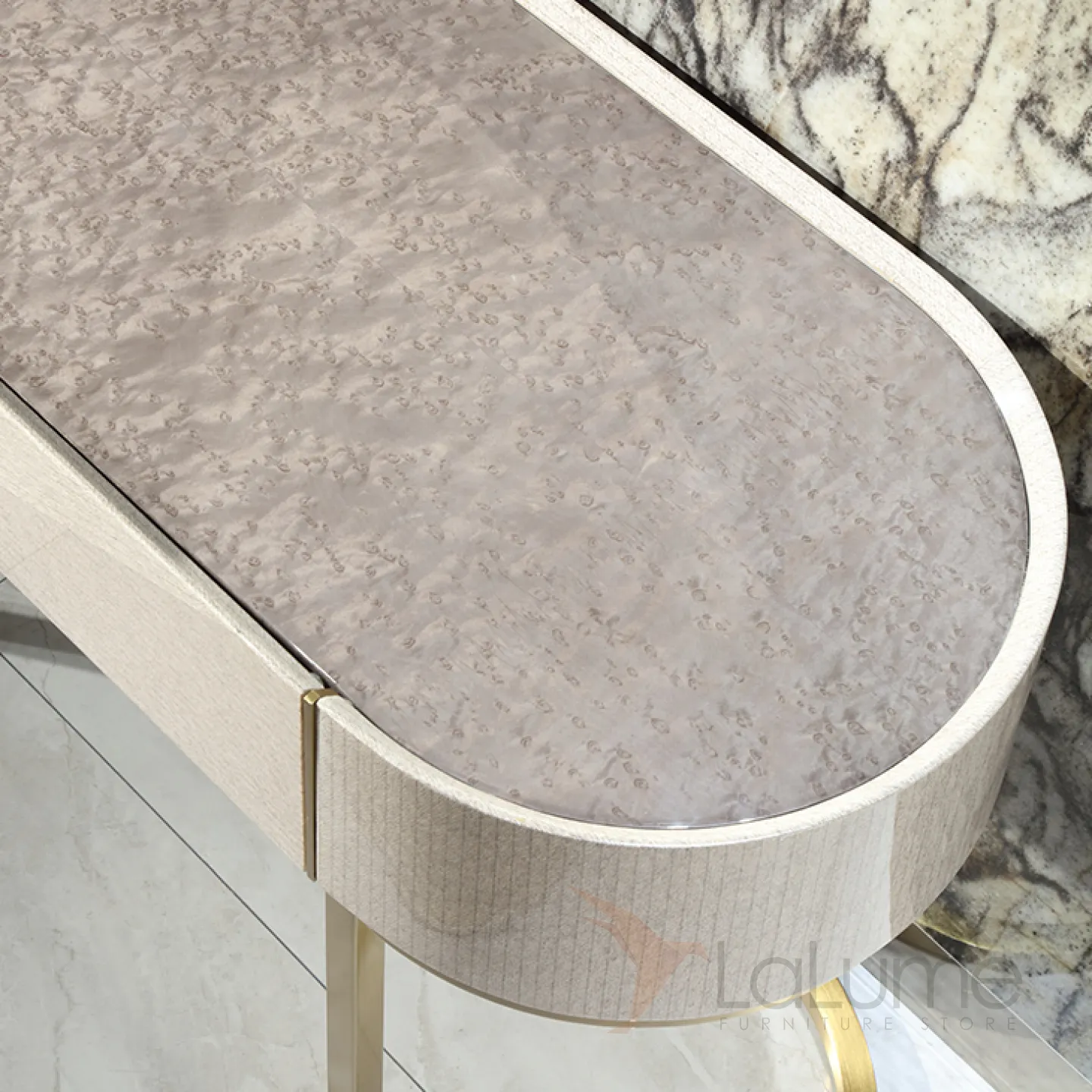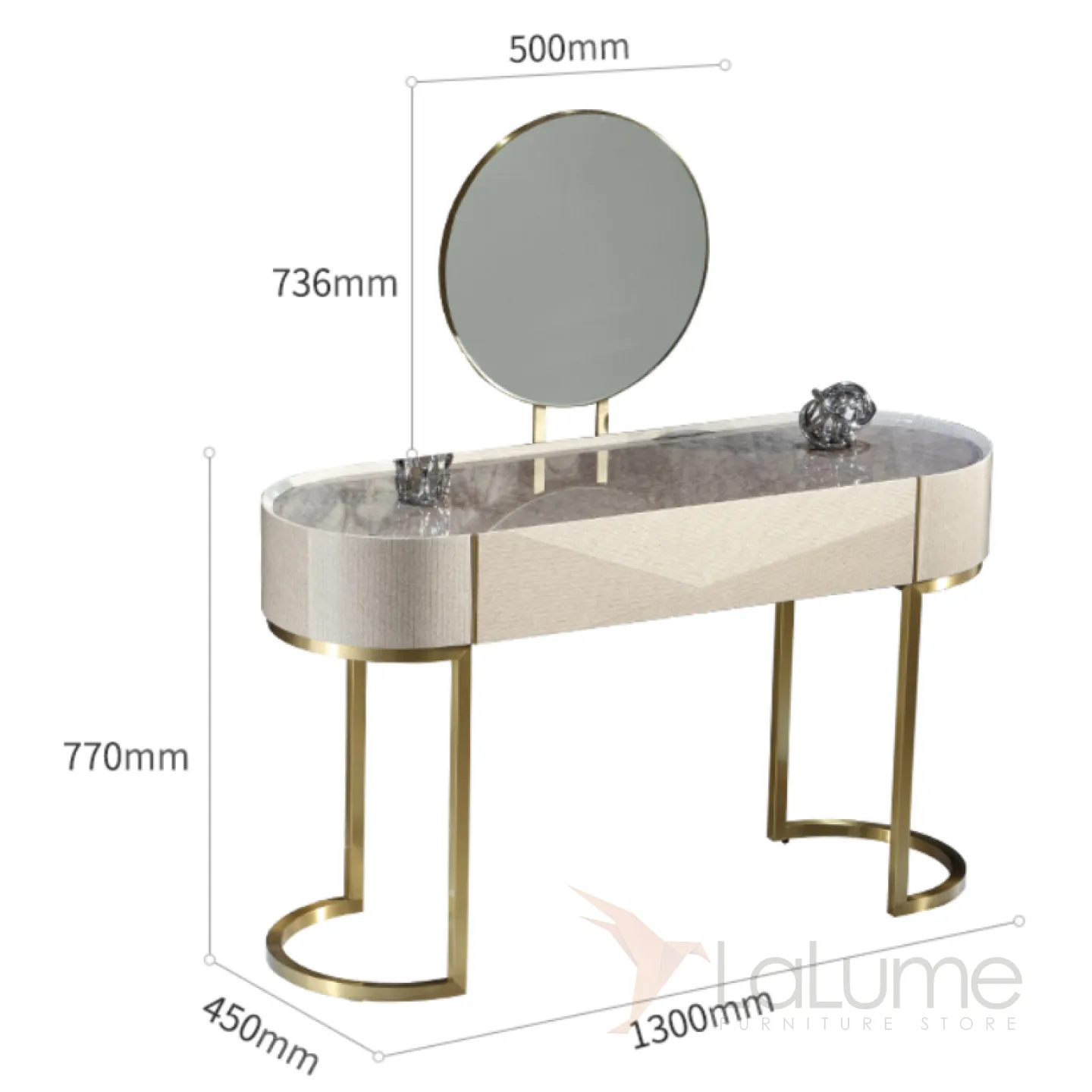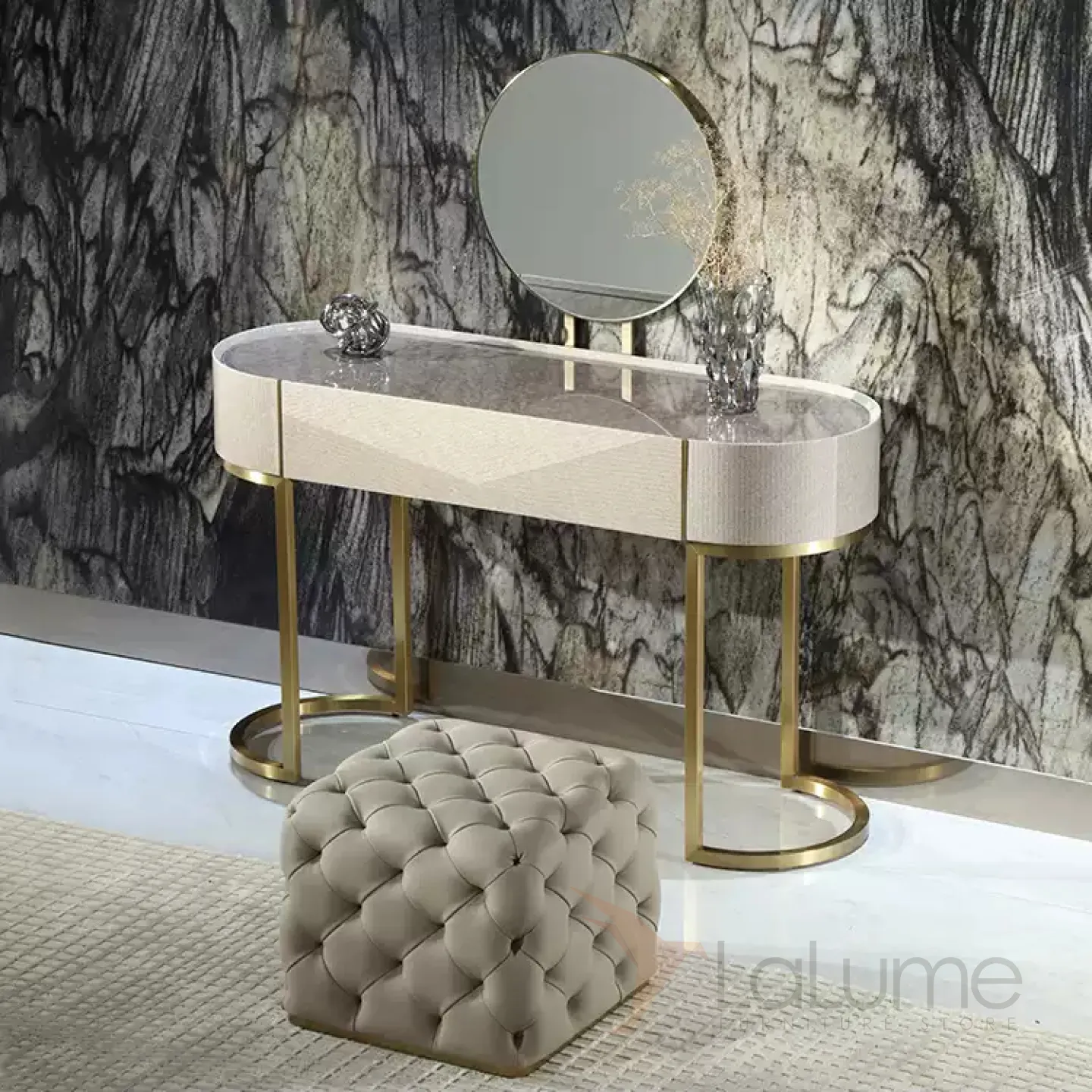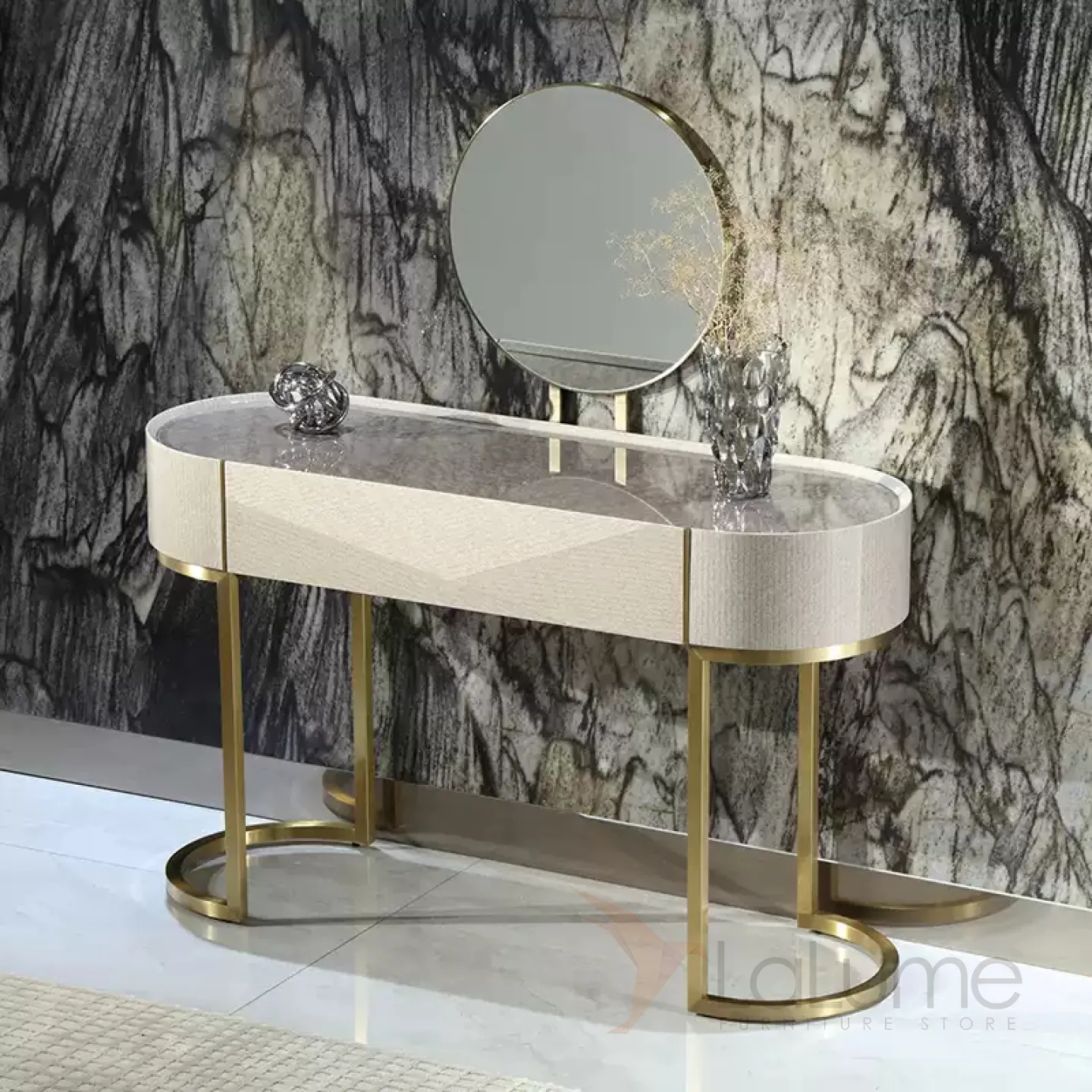 Туалетный столик с зеркалом в золотистых оттенках создан из латуни и красного дерева с декоративным покрытием. Его безупречный дизайн и элегантная форма, а также продуманная функциональность не оставят равнодушной ни одну его владелицу.
