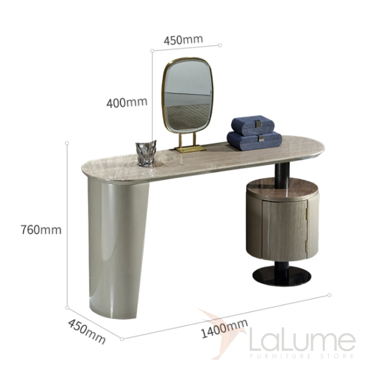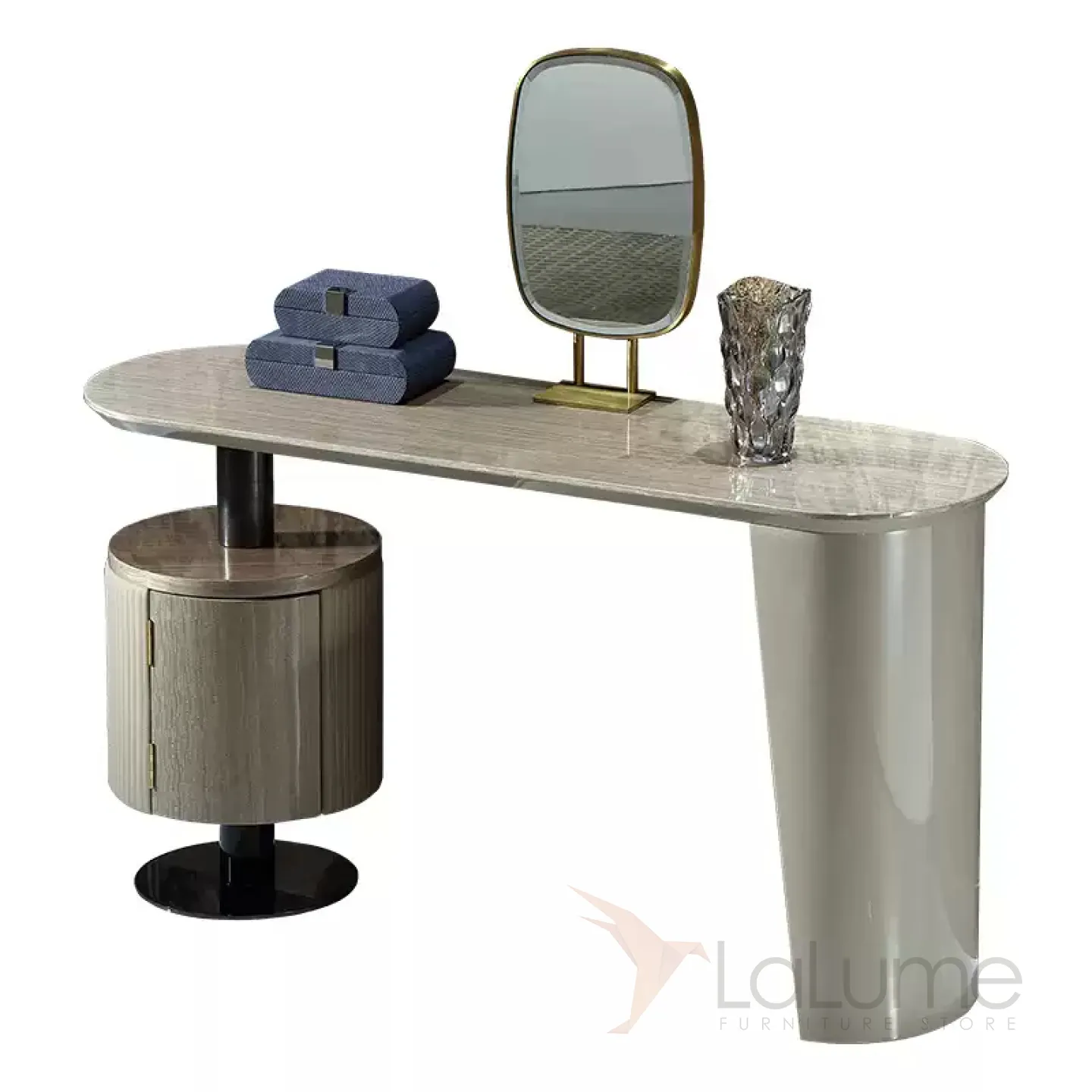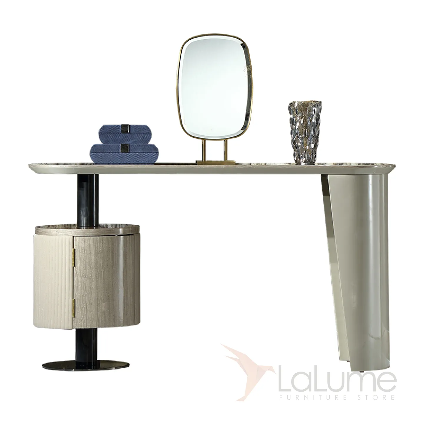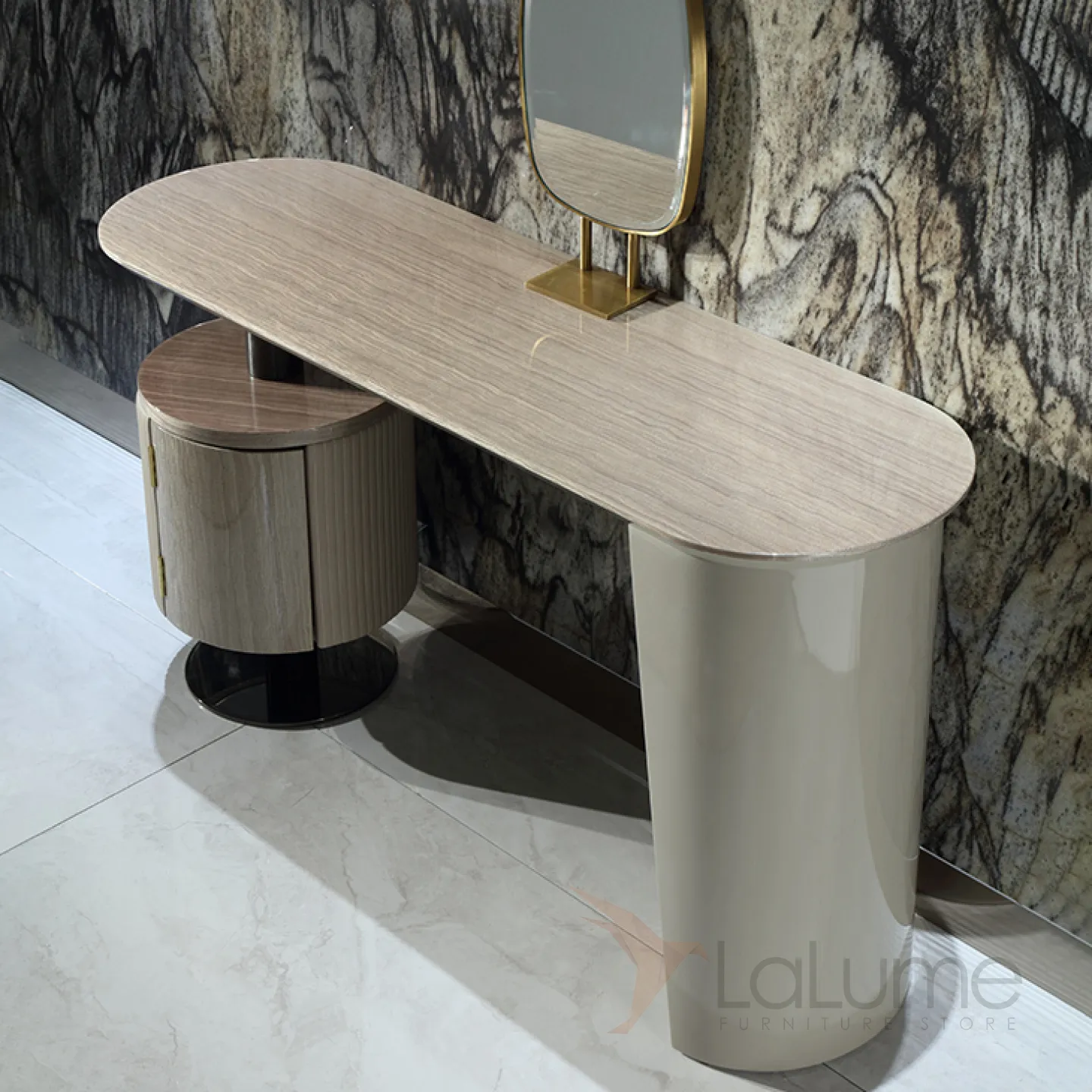 Туалетный столик с зеркалом в нежных бежевых тонах выполнен из латуни и древесины красного дерева, покрытых декоративным слоем. В ножке столика есть полка с дверцей, где можно хранить косметику.
