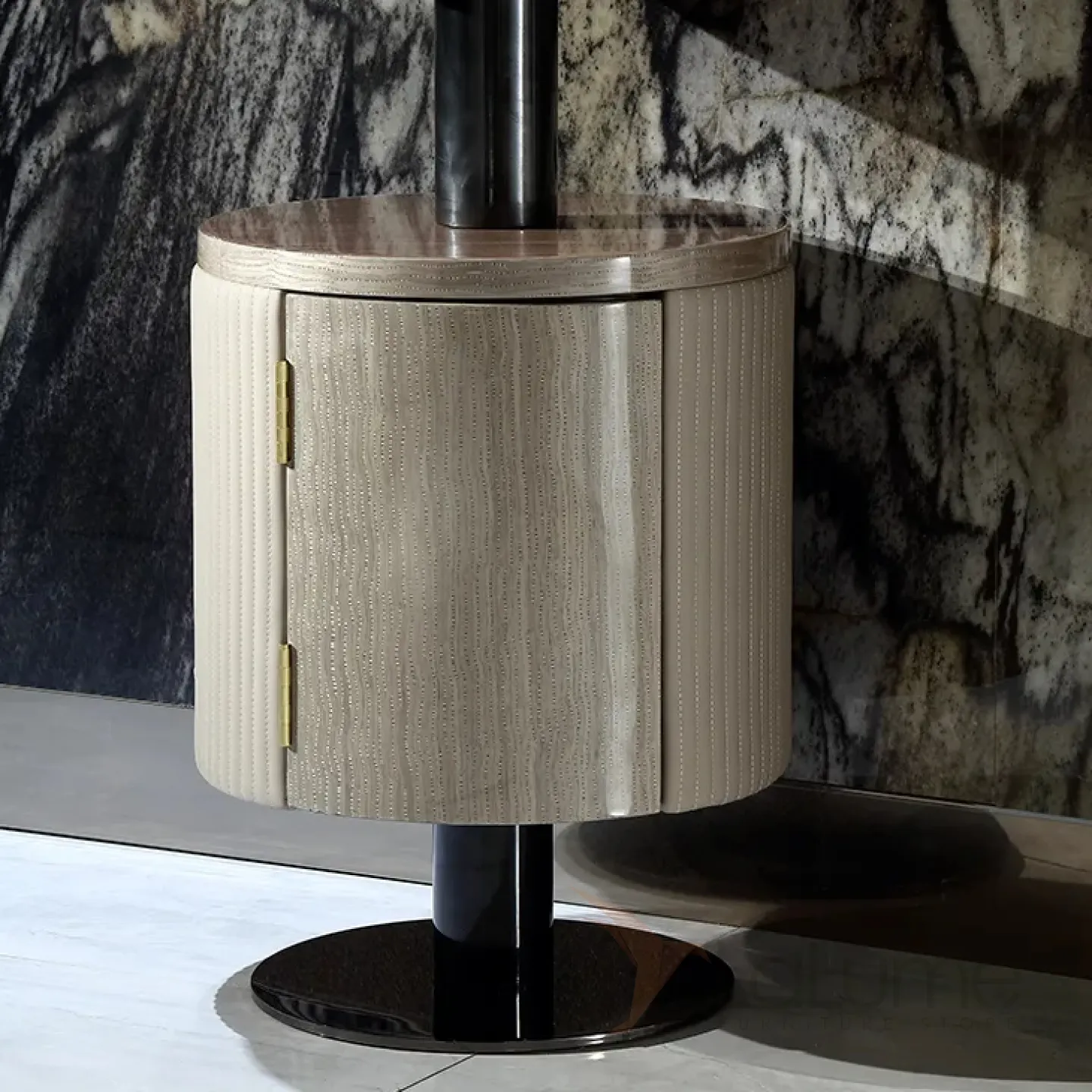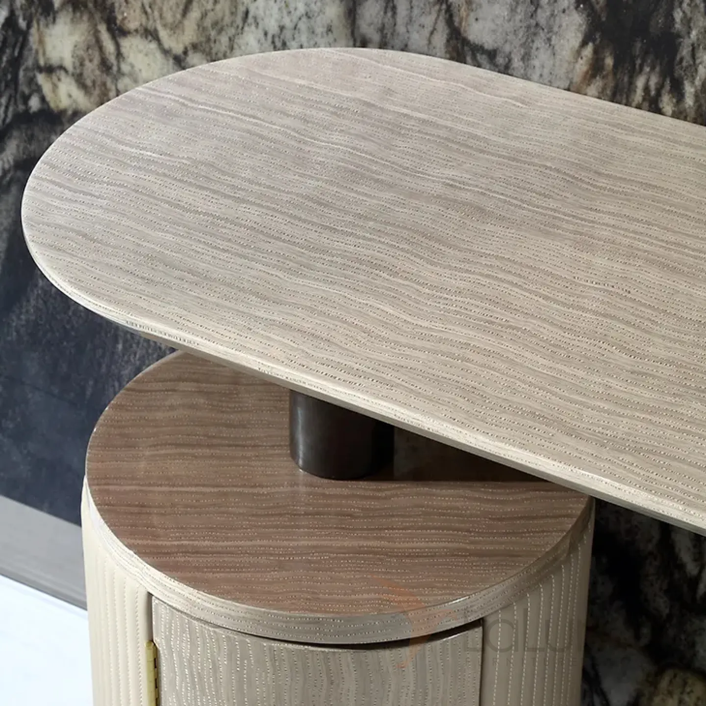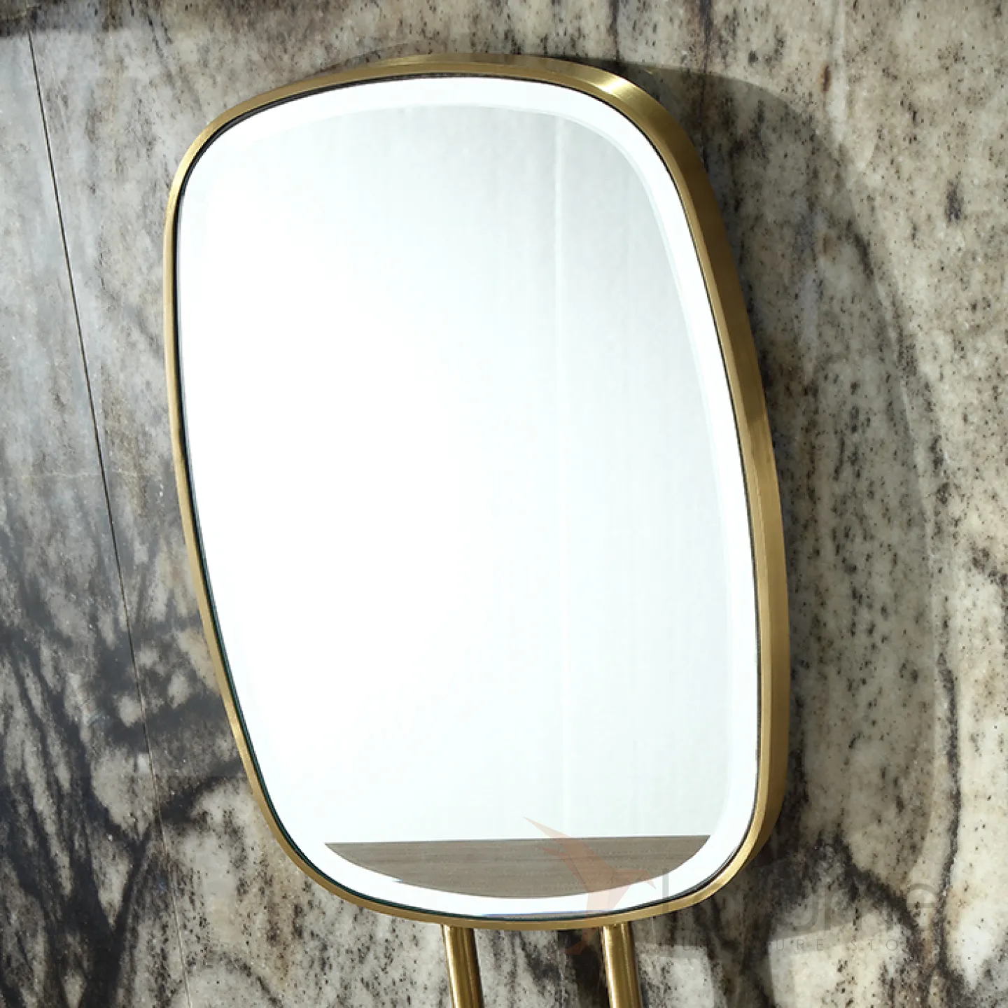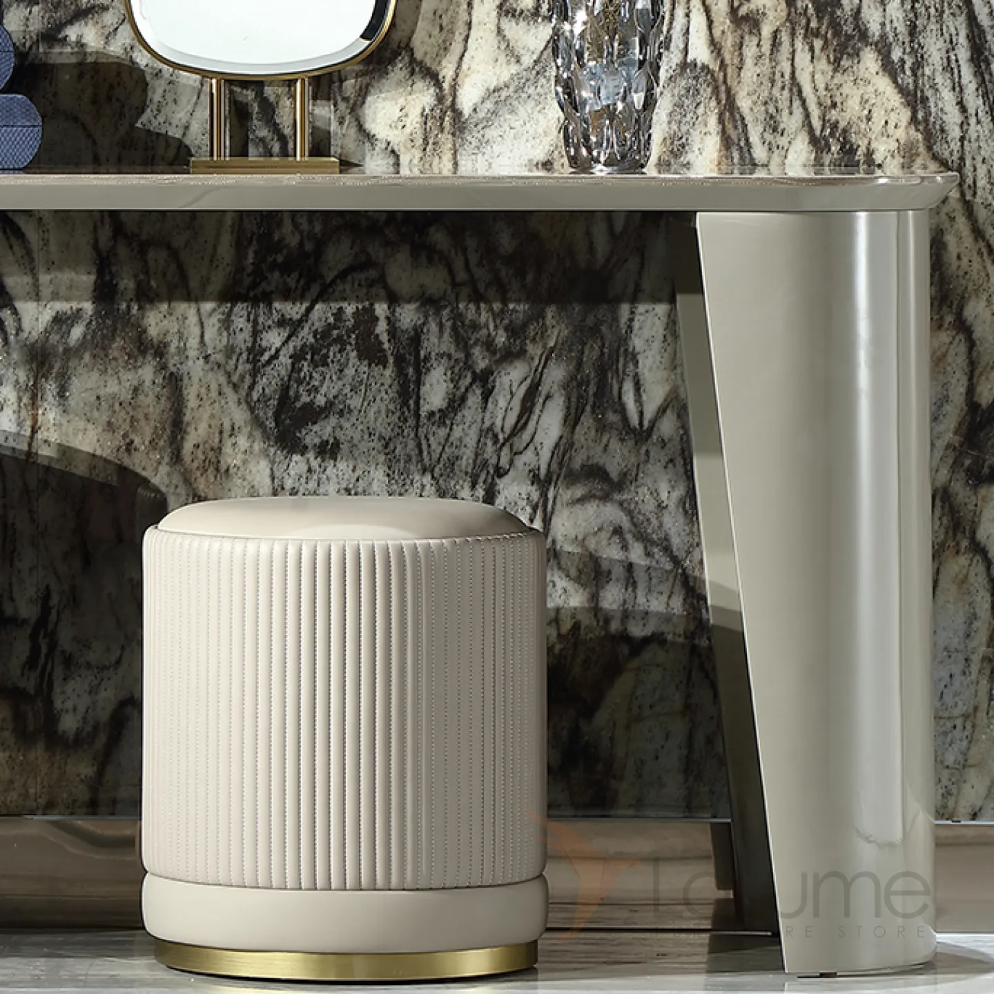 Туалетный столик с зеркалом в нежных бежевых тонах выполнен из латуни и древесины красного дерева, покрытых декоративным слоем. В ножке столика есть полка с дверцей, где можно хранить косметику.
