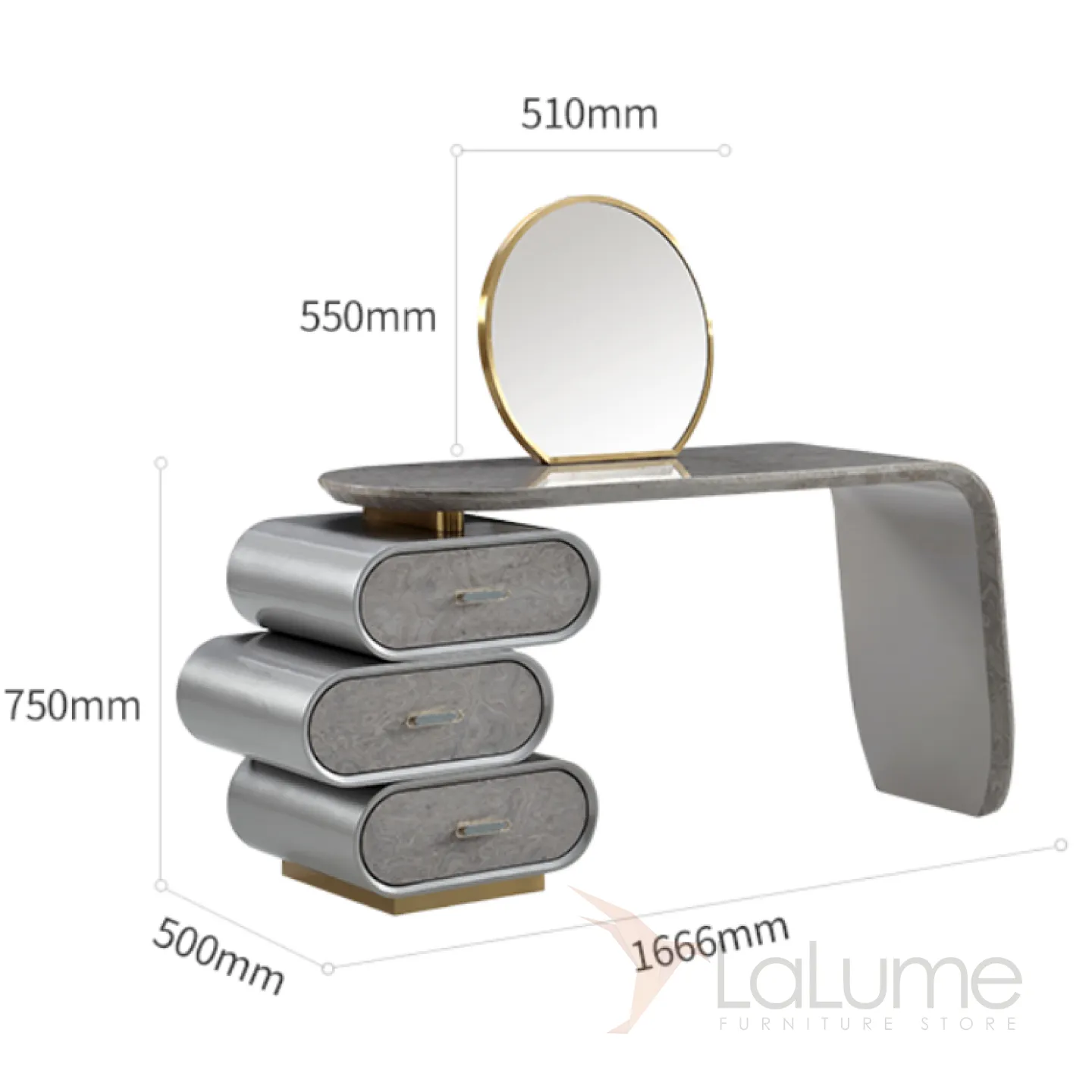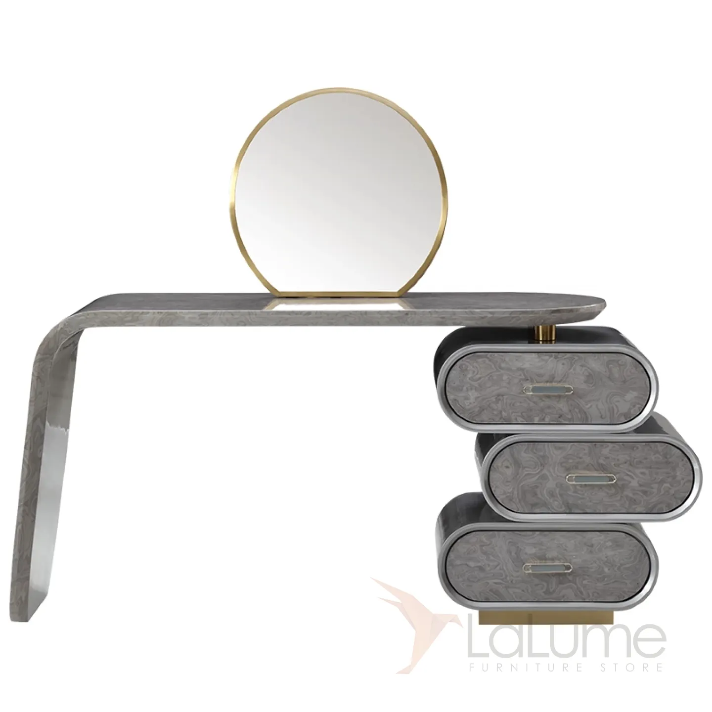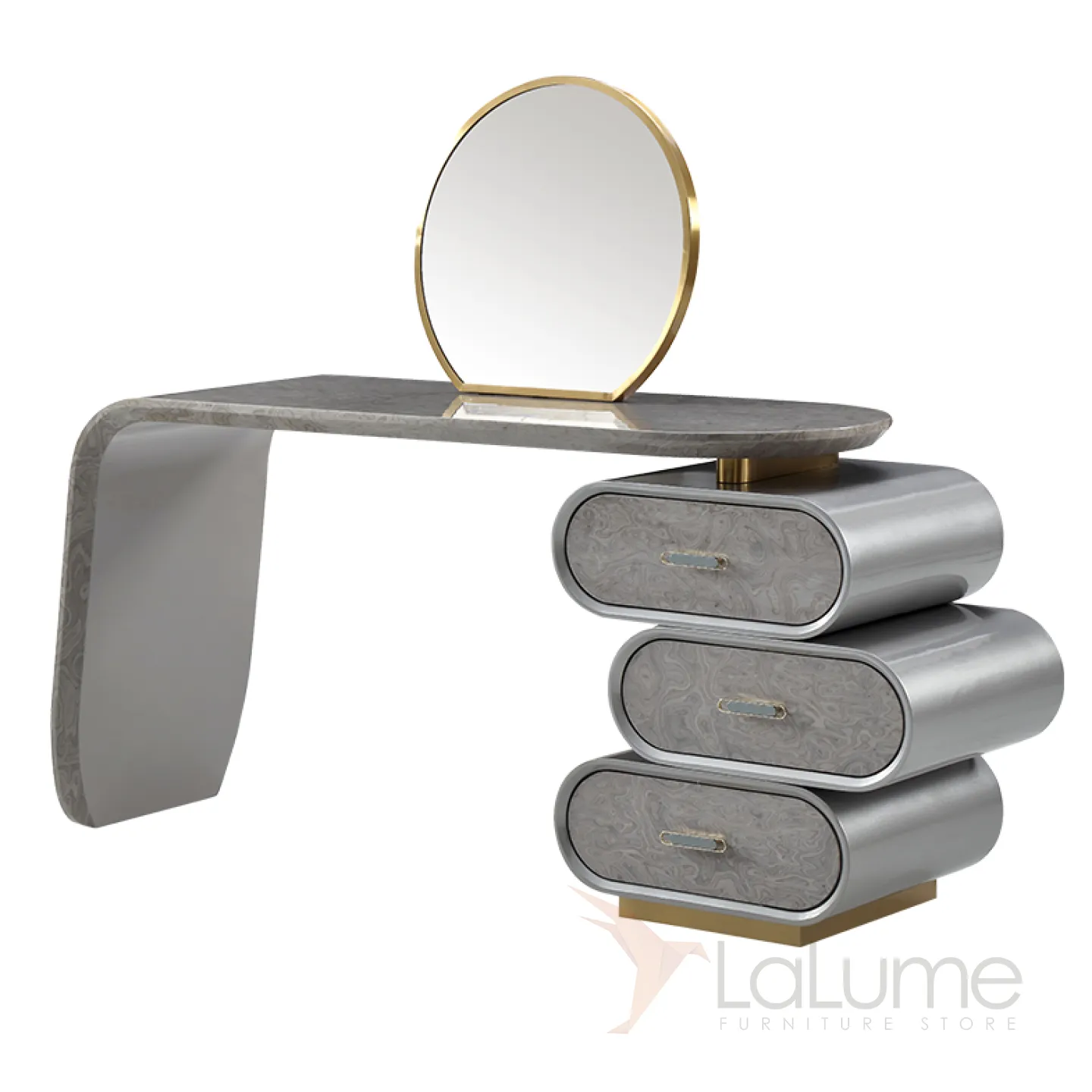 Элегантный туалетный столик с зеркалом в серебристой гамме сочетает в себе нержавеющую сталь и массив бука с декоративным покрытием. Модель оснащена тремя удобными ящиками в основании для хранения косметических принадлежностей. Изысканные линии и продуманная функциональность делают этот столик настоящим украшением интерьера, который непременно покорит женское сердце.