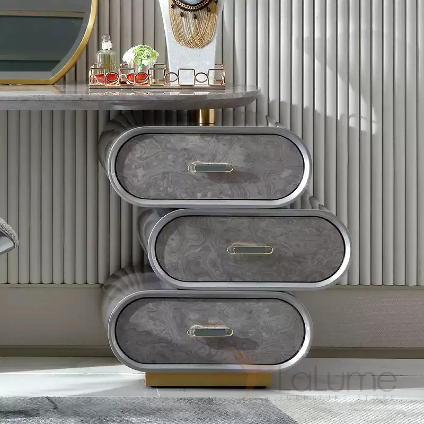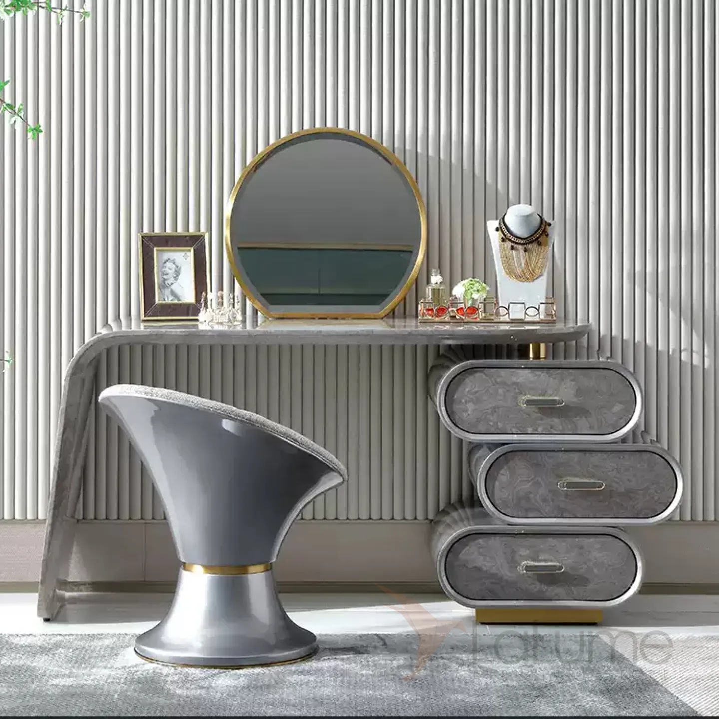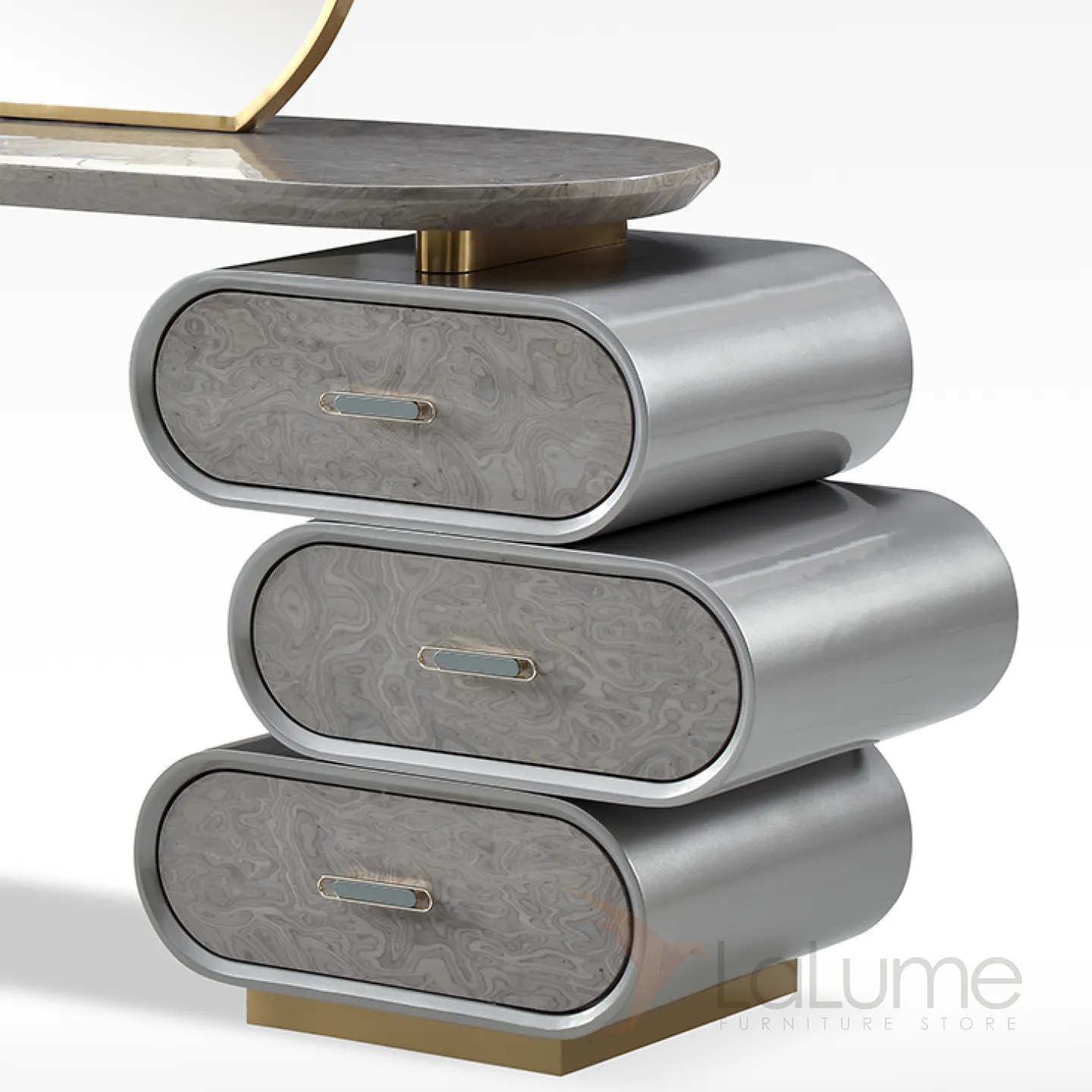 Элегантный туалетный столик с зеркалом в серебристой гамме сочетает в себе нержавеющую сталь и массив бука с декоративным покрытием. Модель оснащена тремя удобными ящиками в основании для хранения косметических принадлежностей. Изысканные линии и продуманная функциональность делают этот столик настоящим украшением интерьера, который непременно покорит женское сердце.