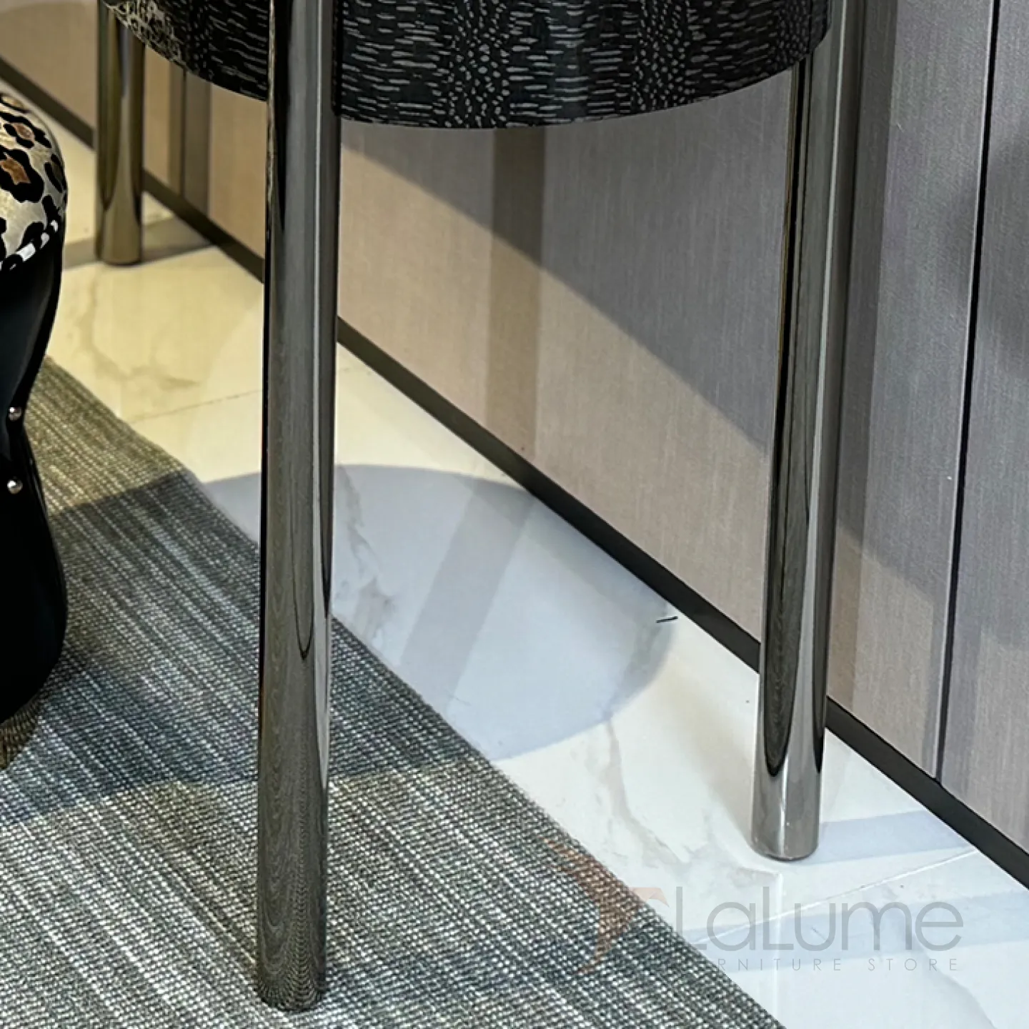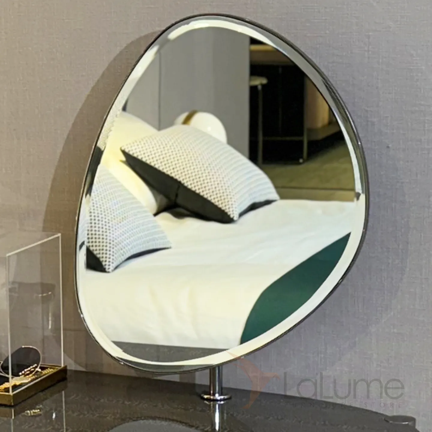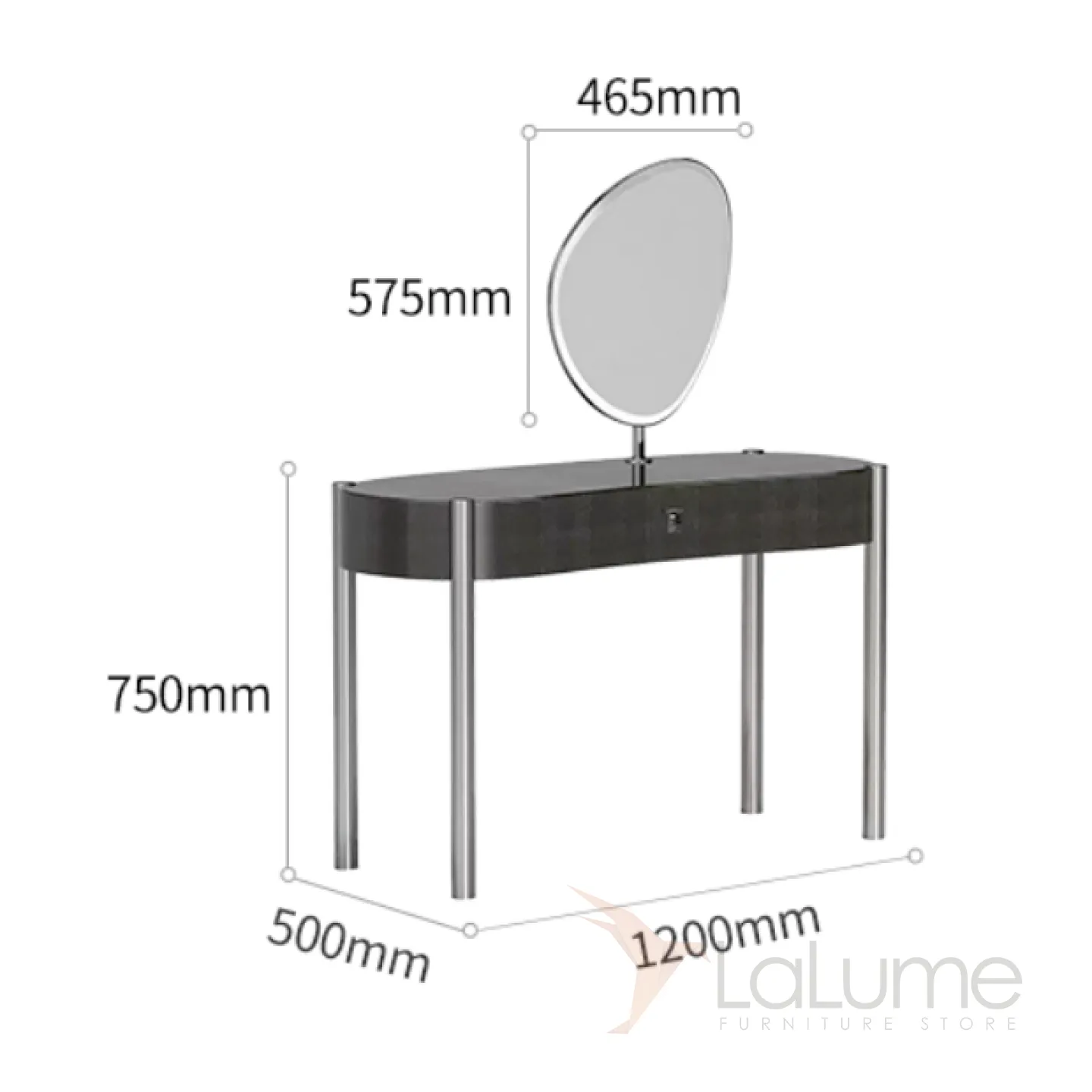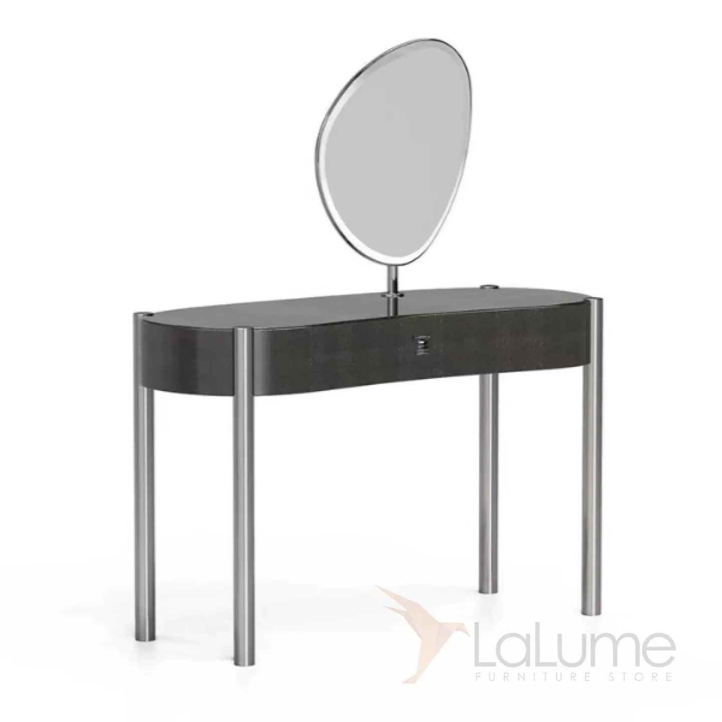 Изысканный туалетный столик с зеркалом, выполненный из нержавеющей стали и массива бука, имеет декоративное покрытие. В нём предусмотрен выдвижной ящик для косметики.