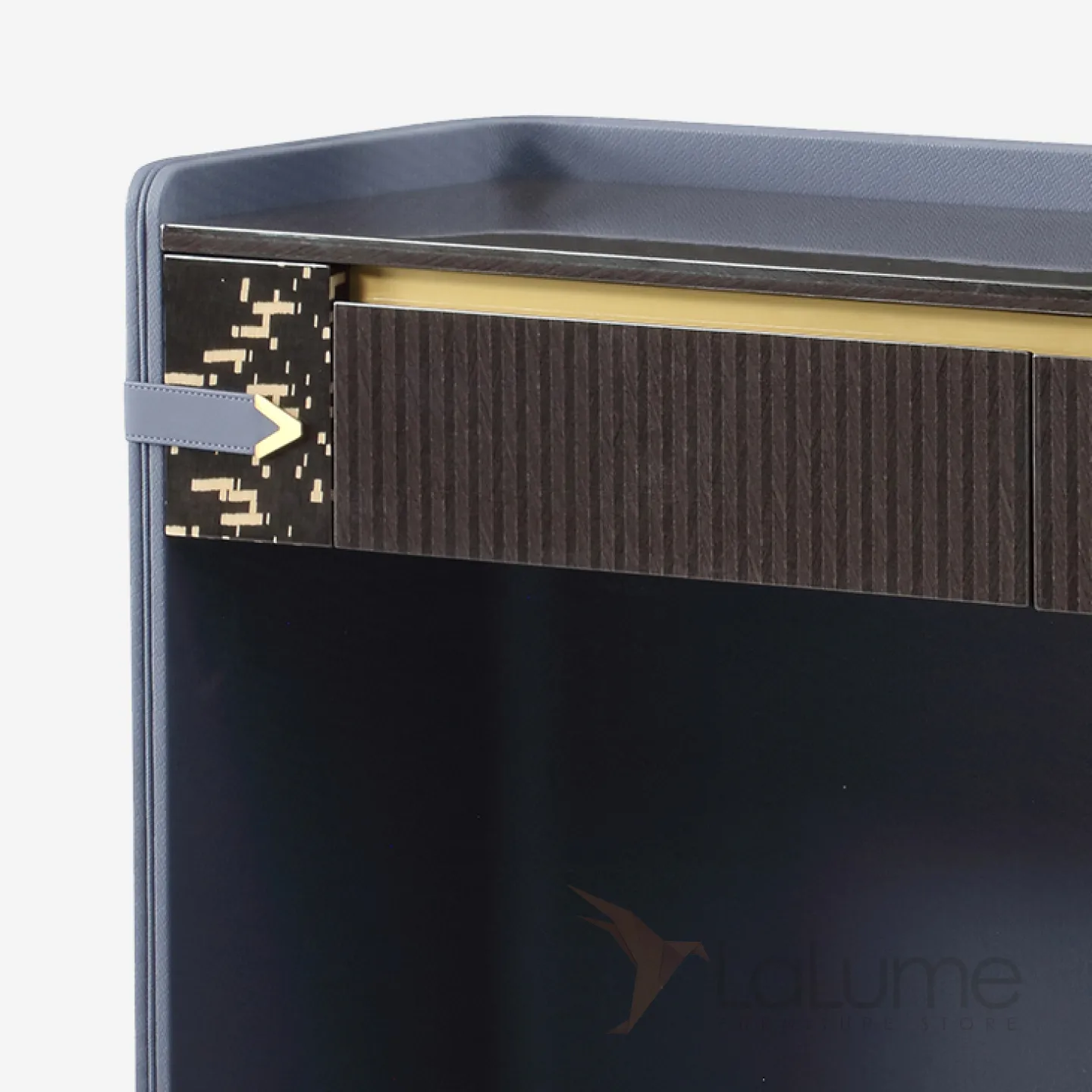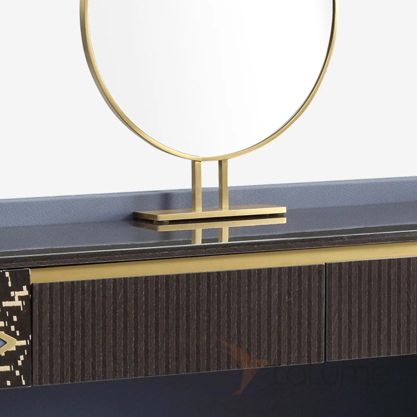 Туалетный столик из массива дерева, покрытого матовой кожей, с поверхностью из шпона. В нём предусмотрено два выдвижных ящика для косметики, а также встроенное зеркало. Изящные формы и продуманная конструкция делают его настоящим украшением интерьера. Такой столик станет прекрасным дополнением к женскому туалетному столику.