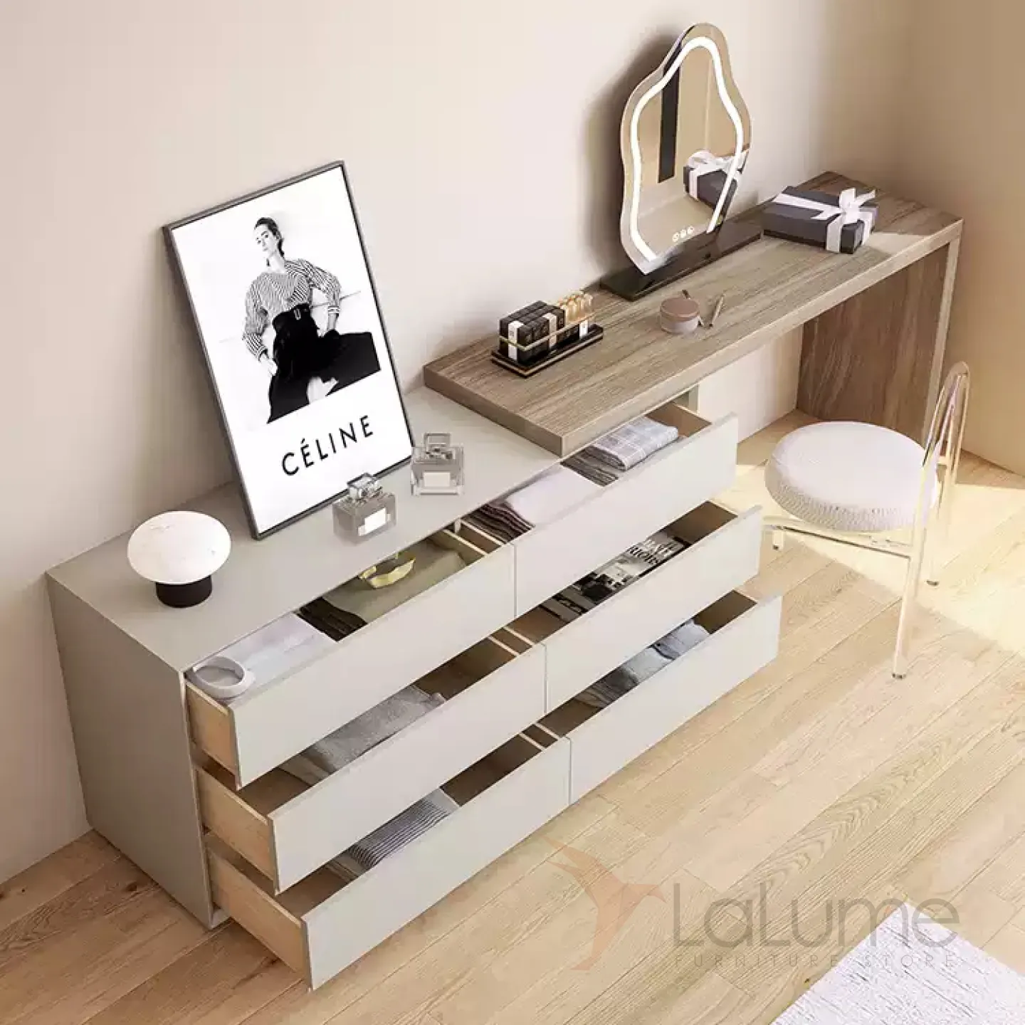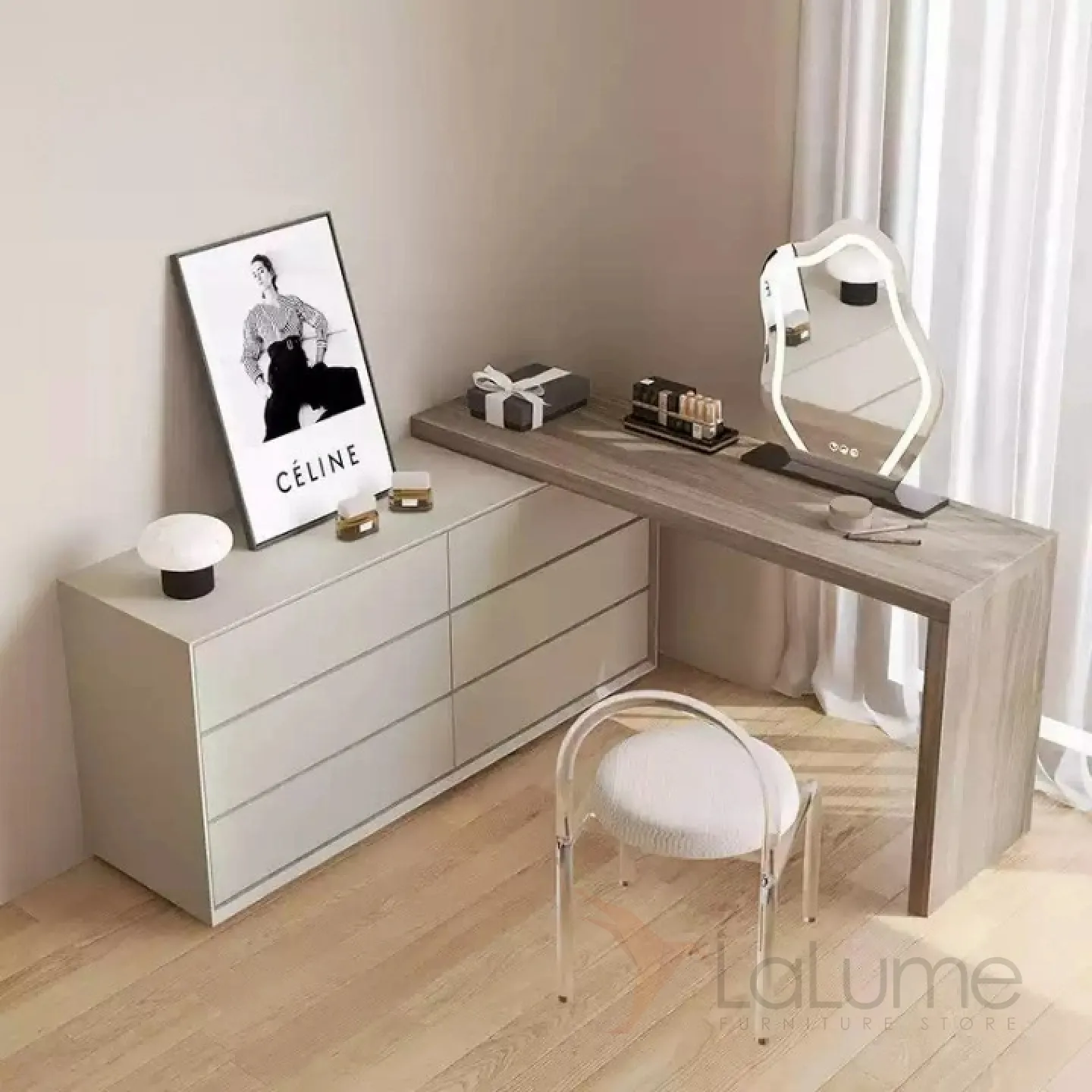 Эргономичный столик для макияжа с универсальной системой расположения: столик можно свободно позиционировать относительно шестисекционной тумбы. Широкий выбор размеров и две базовые комплектации – с зеркалом или без него.