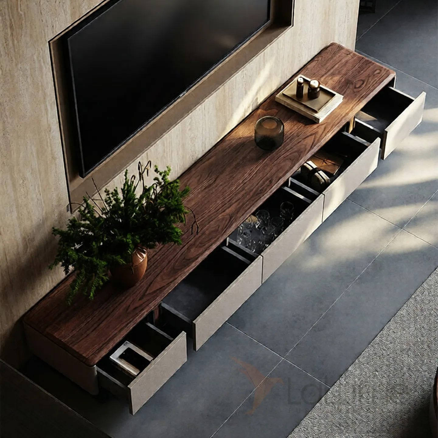 Тумба под телевизор из древесины чёрного или грецкого ореха, дополнен пятью выдвижными ящиками.