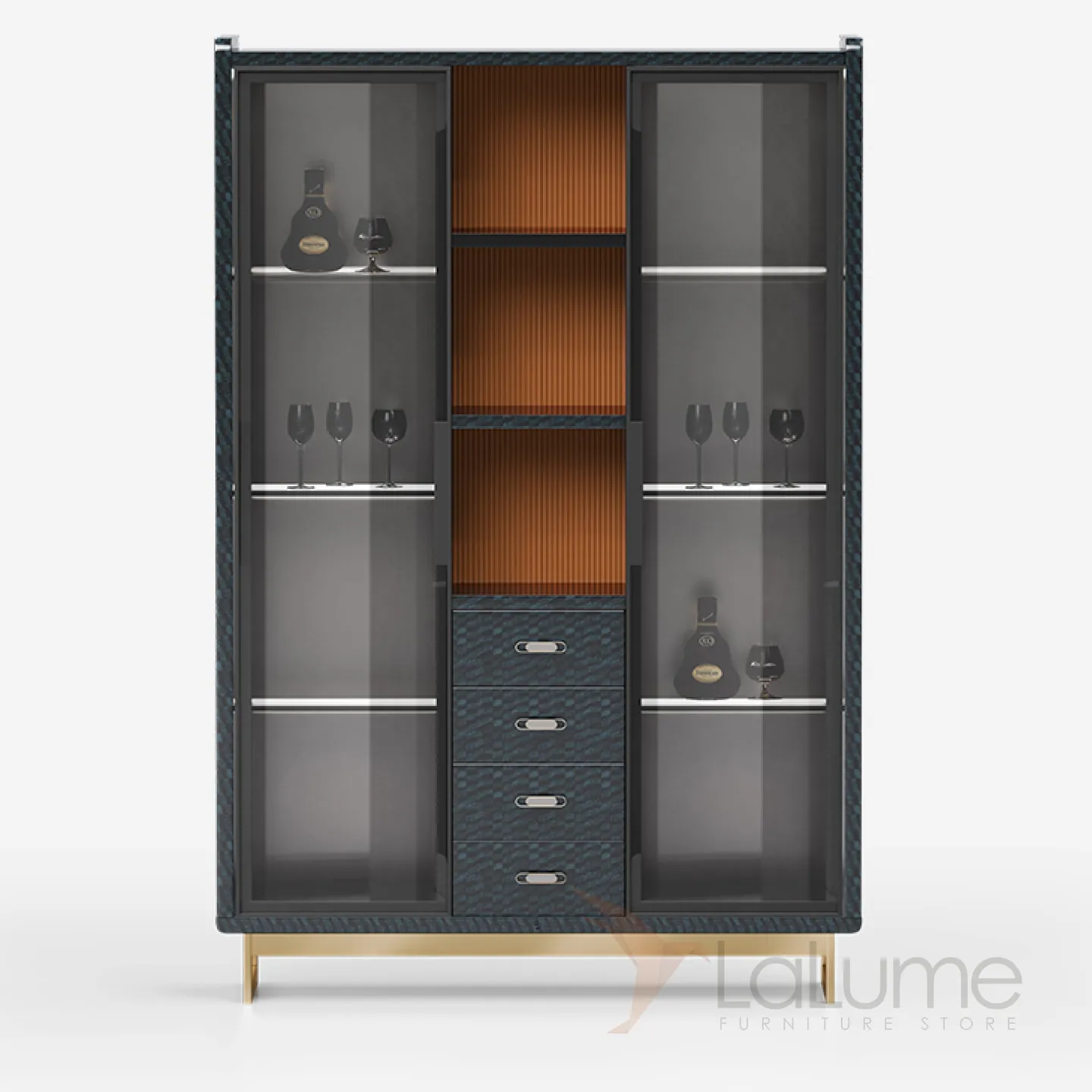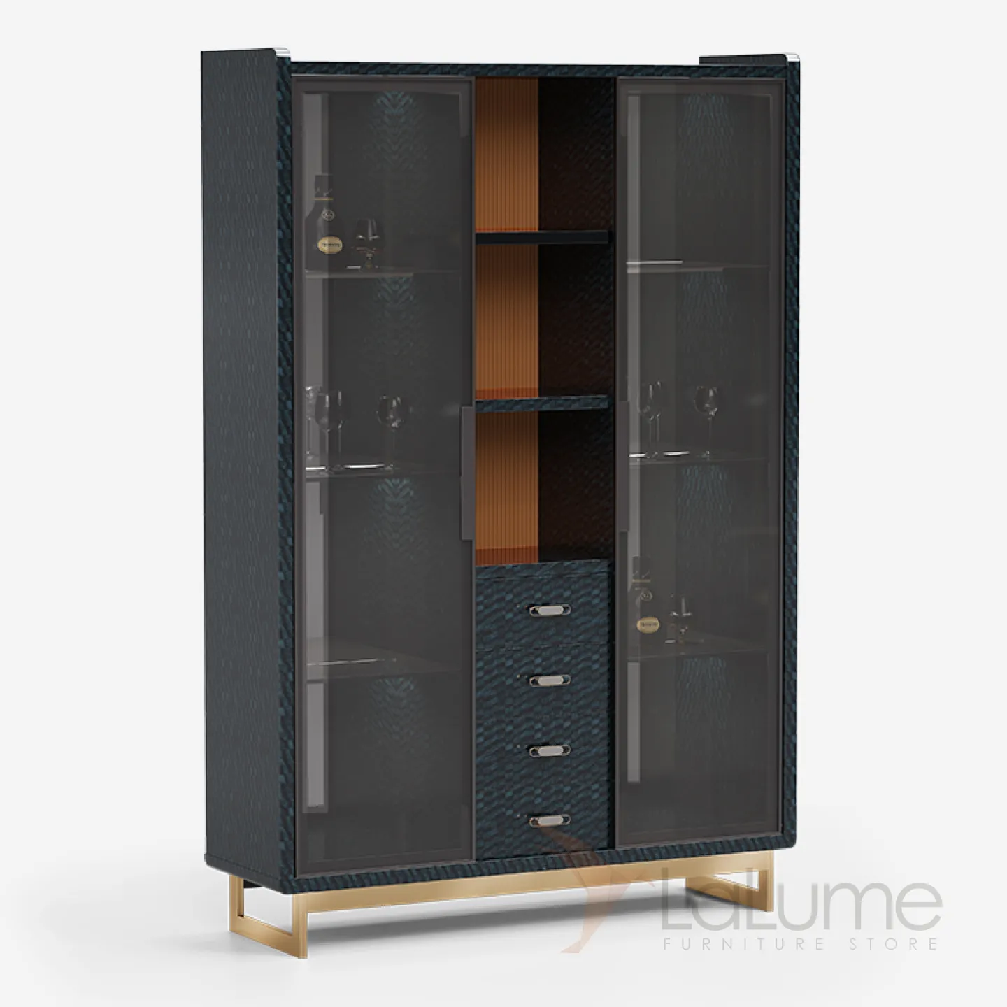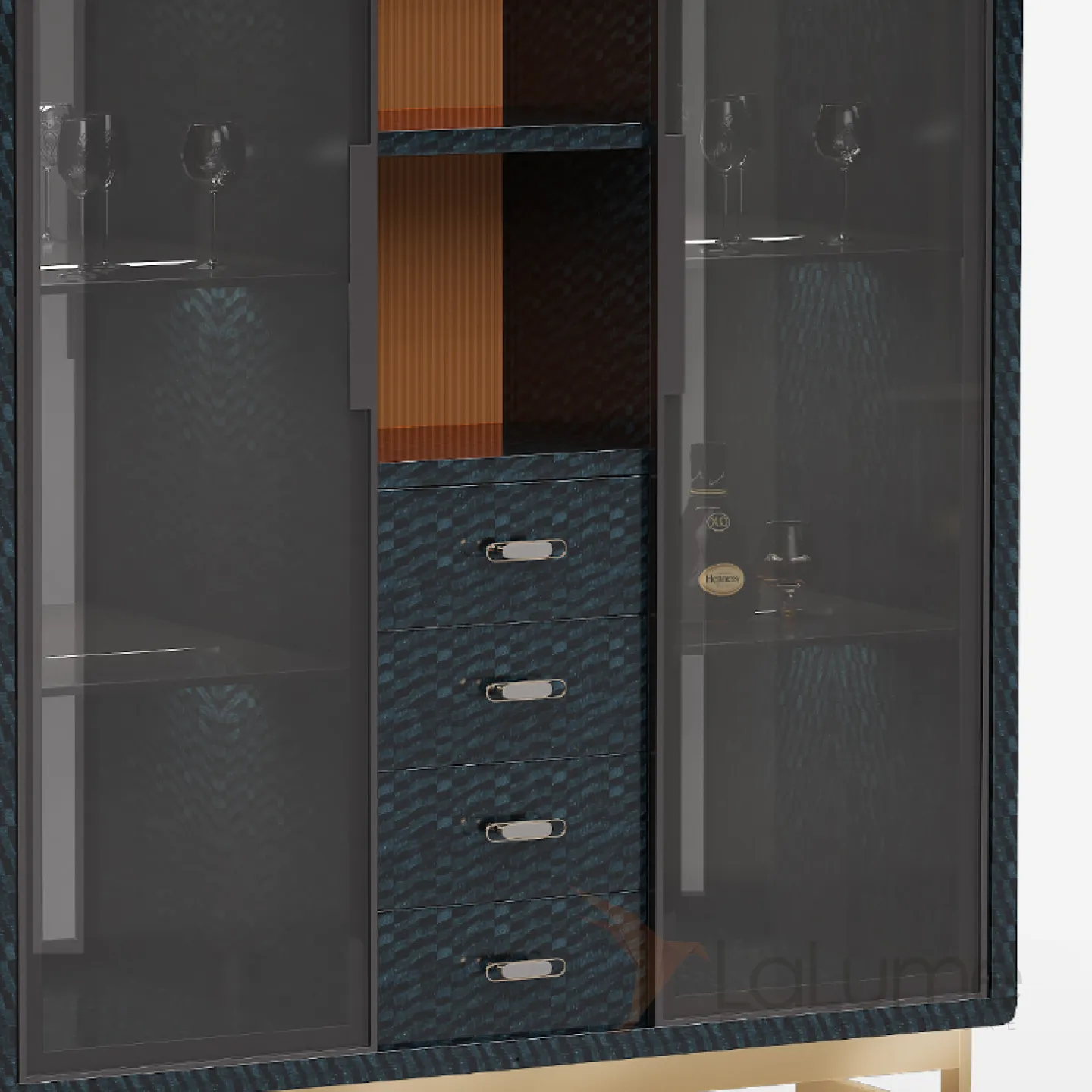 Винный шкаф из бука с дверцами и полками из закаленного стекла. Есть четыре выдвижных ящиков и открытые полки. Внутренняя стенка украшена разноцветной фактурой. Ножки из латуни, покрытые золотой краской.