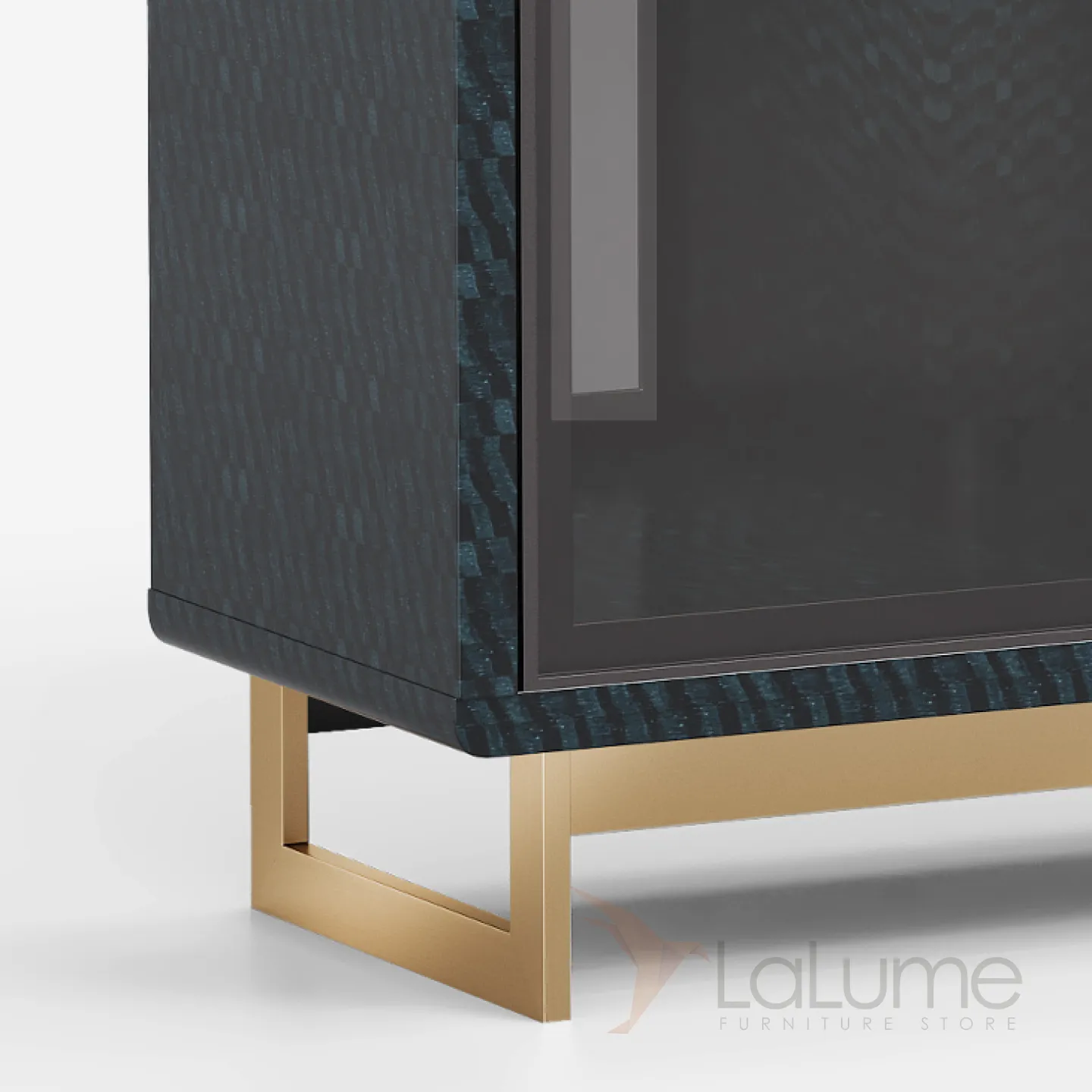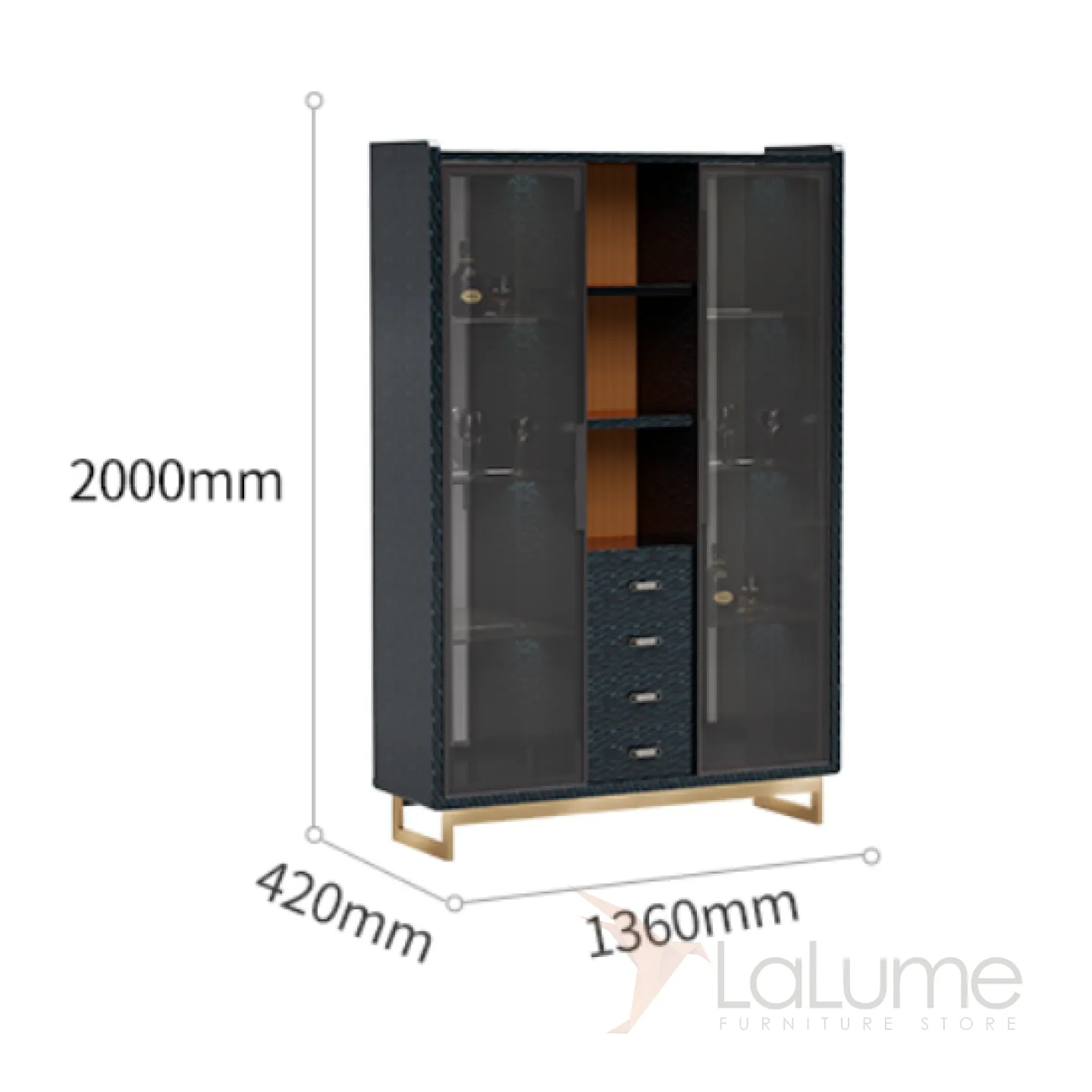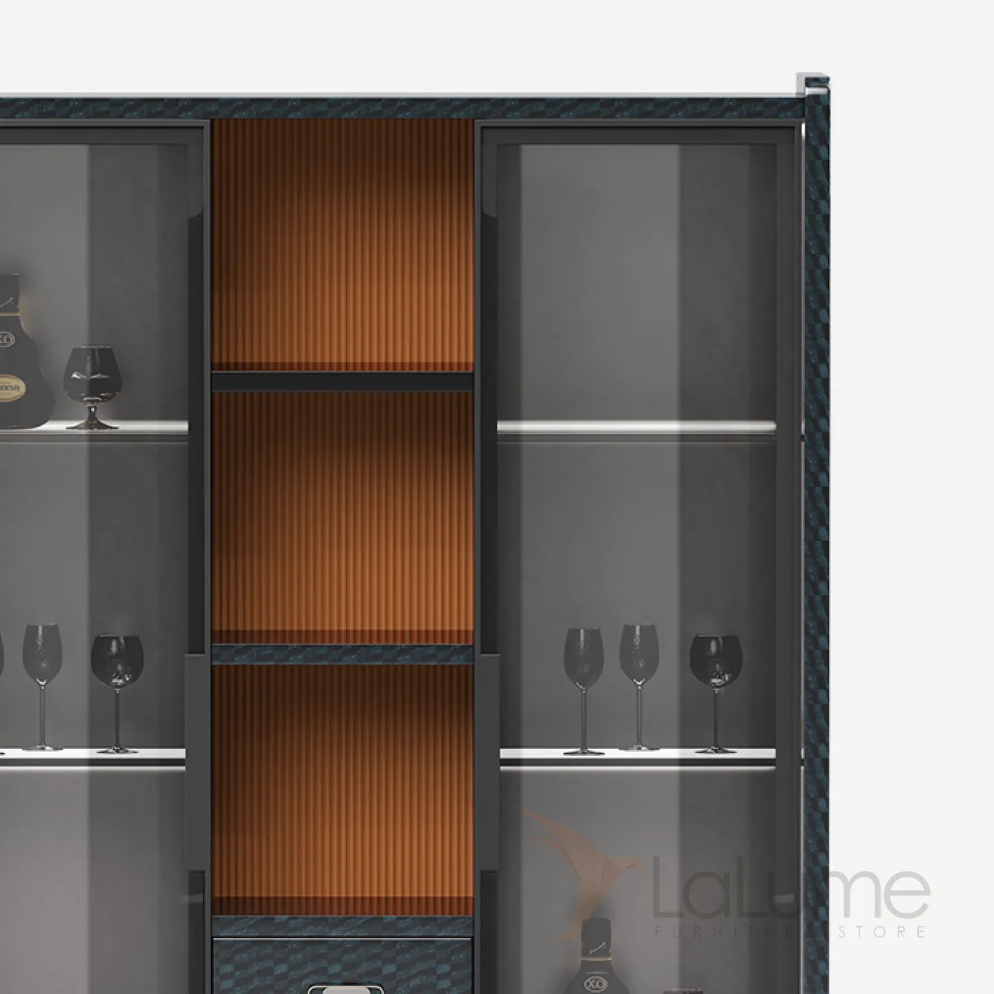 Винный шкаф из бука с дверцами и полками из закаленного стекла. Есть четыре выдвижных ящиков и открытые полки. Внутренняя стенка украшена разноцветной фактурой. Ножки из латуни, покрытые золотой краской.