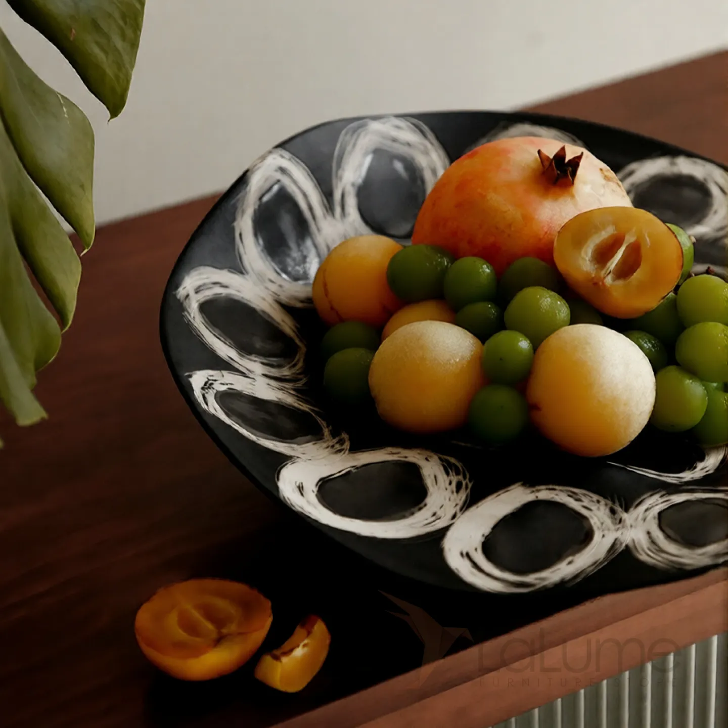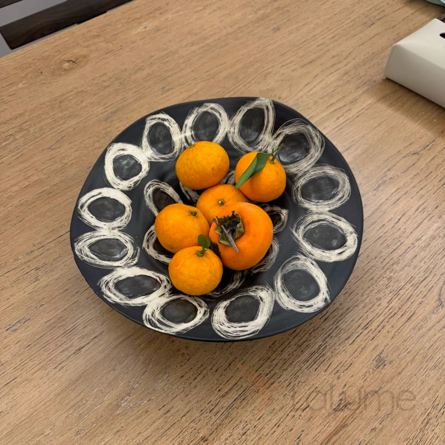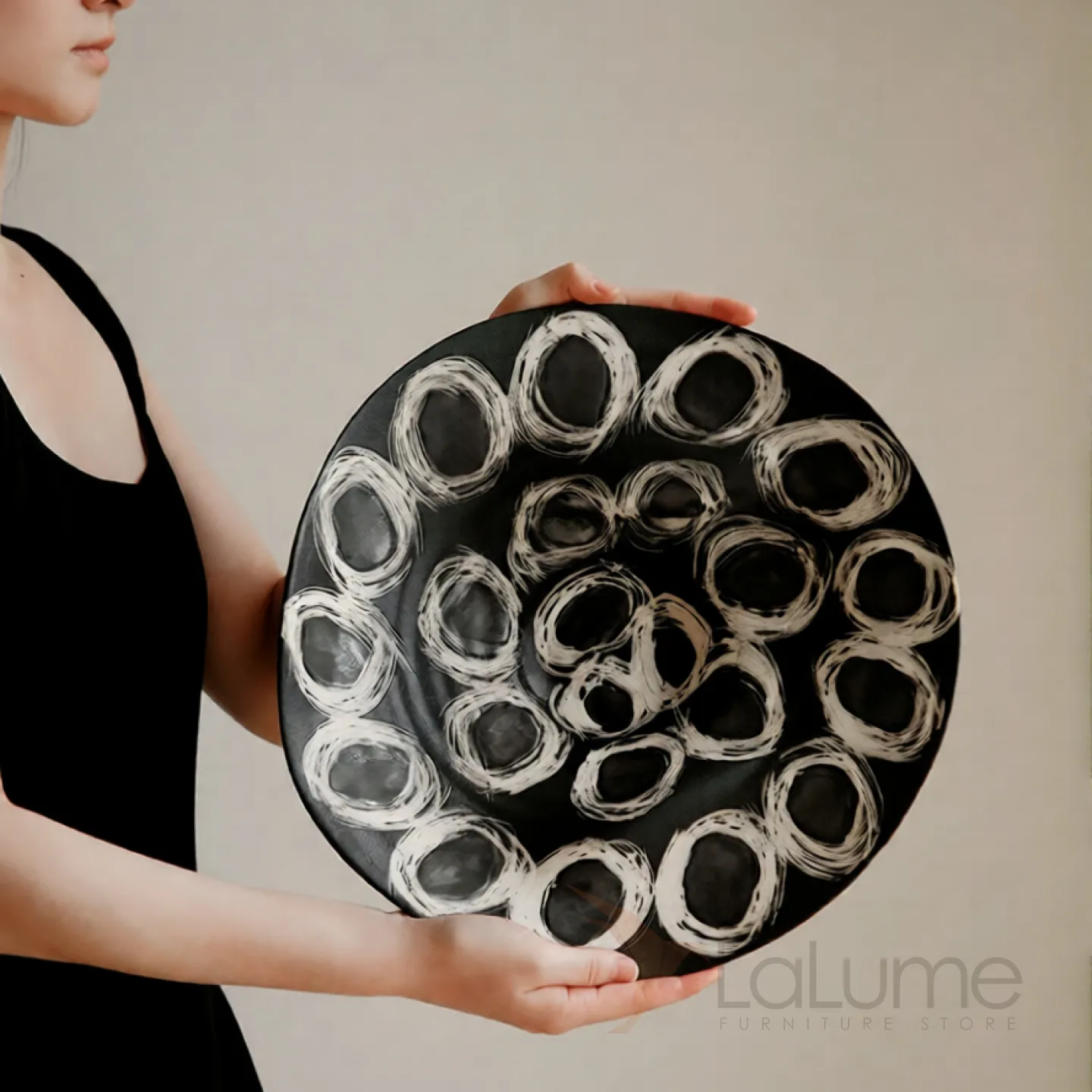 Элегантное винтажное блюдо асимметричной формы, выполненное в чёрно-белой гамме. Украшено выразительным абстрактным орнаментом из белых кругов и завитков на глубоком чёрном фоне. Благодаря необычной форме и художественному дизайну служит не только практичной посудой, но и стильным элементом декора. Идеально подойдёт для сервировки фруктов, закусок или как изысканная декоративная чаша в интерьере.