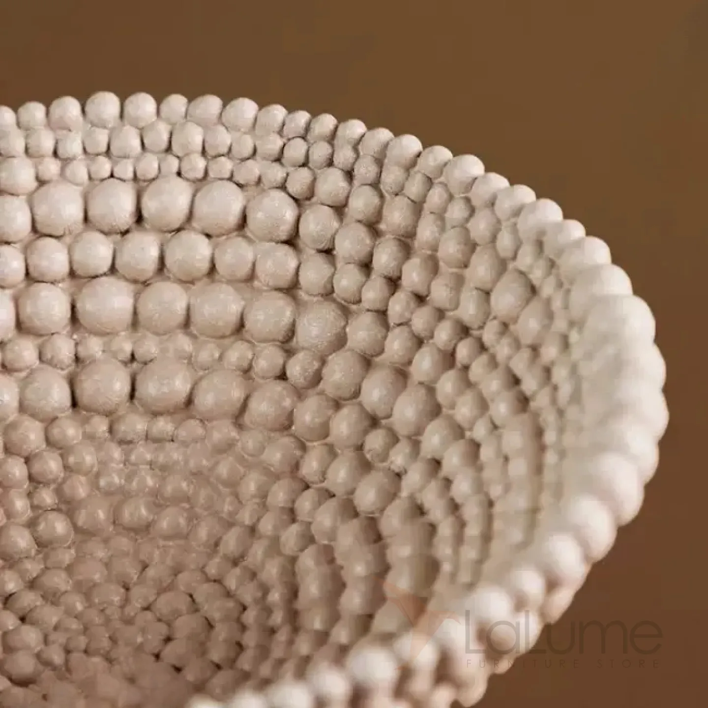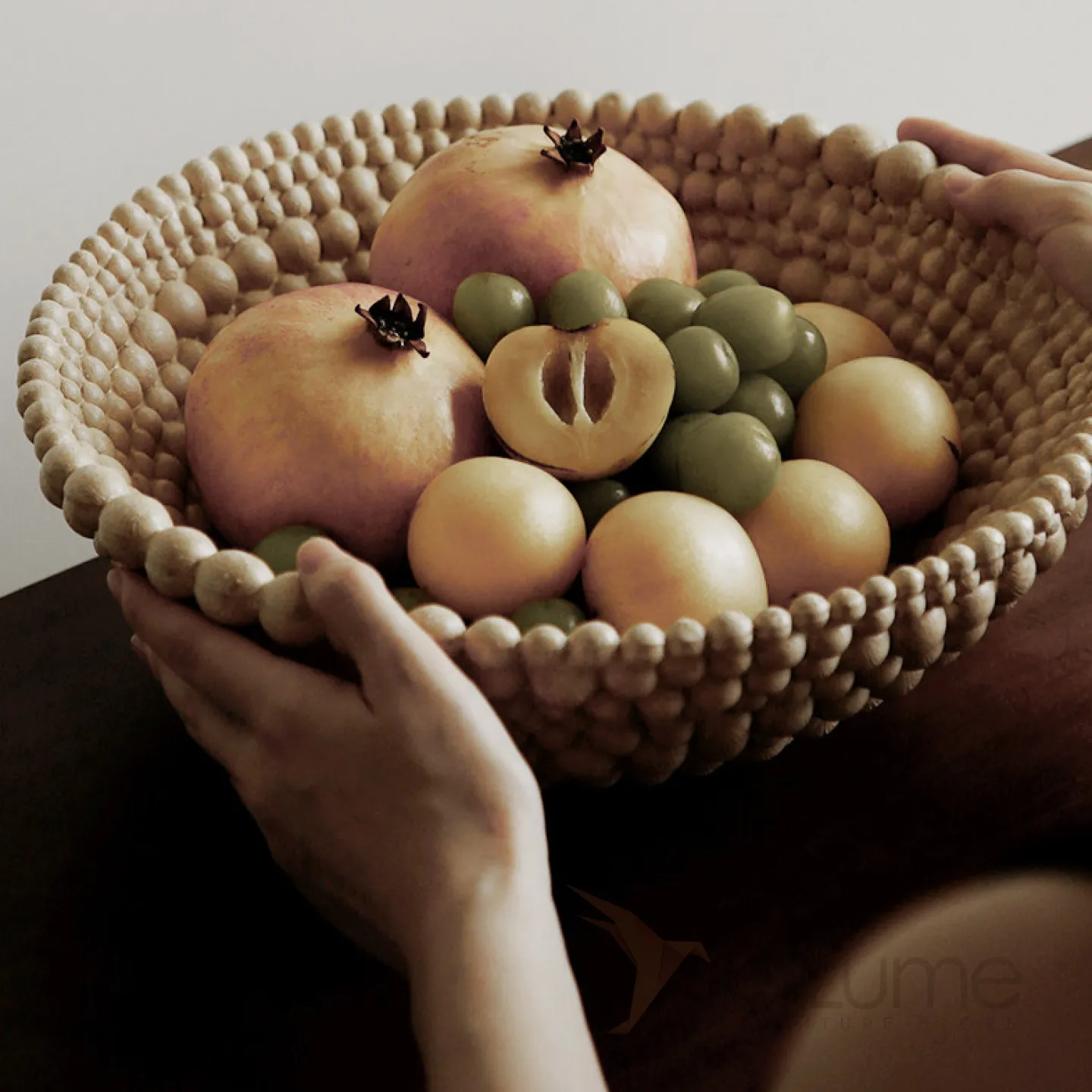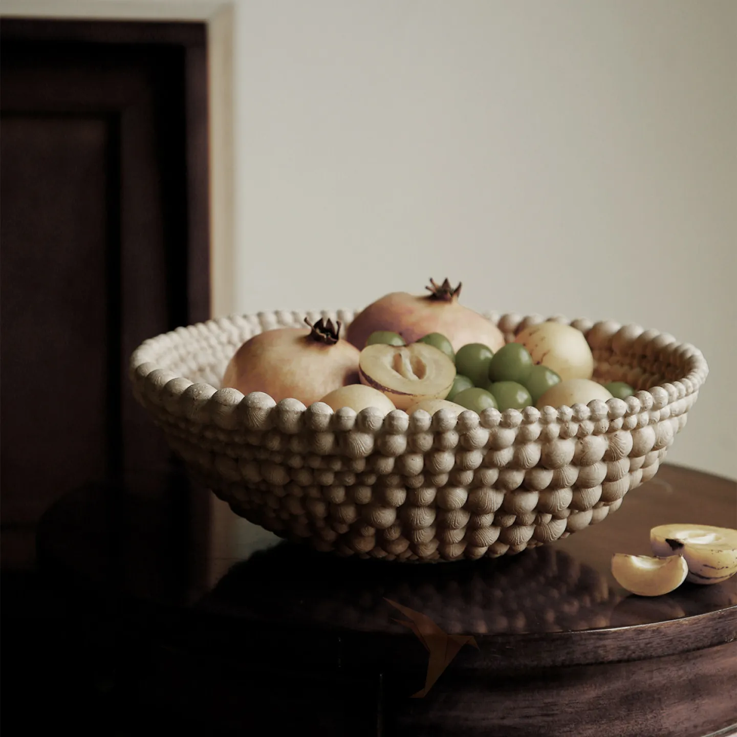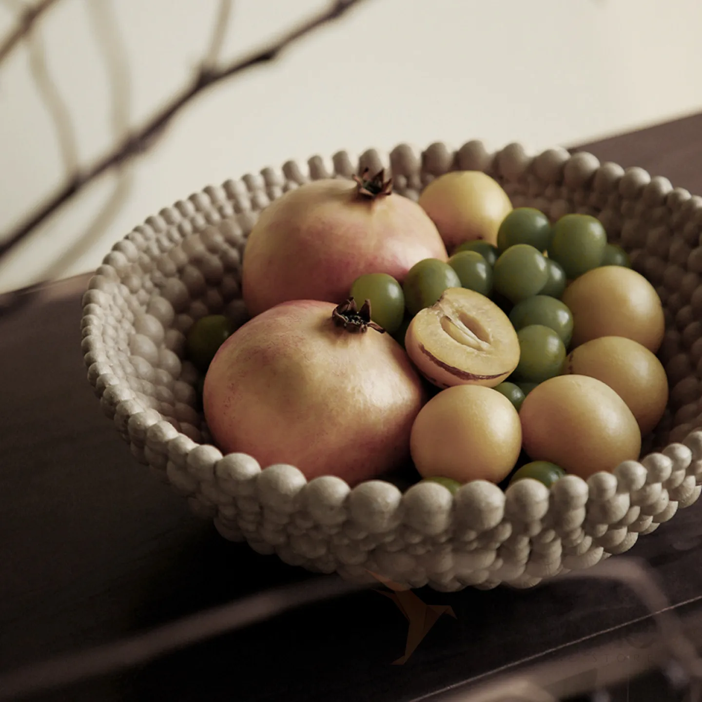 Элегантная фруктовница из смолы с оригинальным дизайном: выполнена в виде чаши с рельефным узором, напоминающим объёмные бусины или шарики по краю. Нейтральный, приглушённый оттенок гармонично впишется в любой интерьер — от минималистичного до эклектичного. Прочная, устойчивая конструкция позволяет использовать её не только для сервировки свежих фруктов (как на фото — гранаты, виноград, сливы), но и для декоративных композиций.