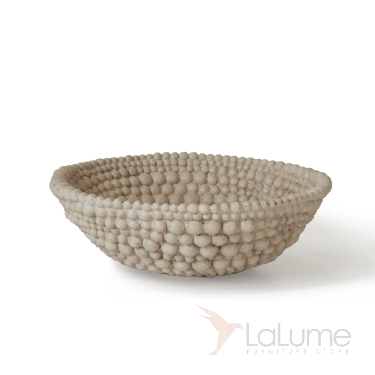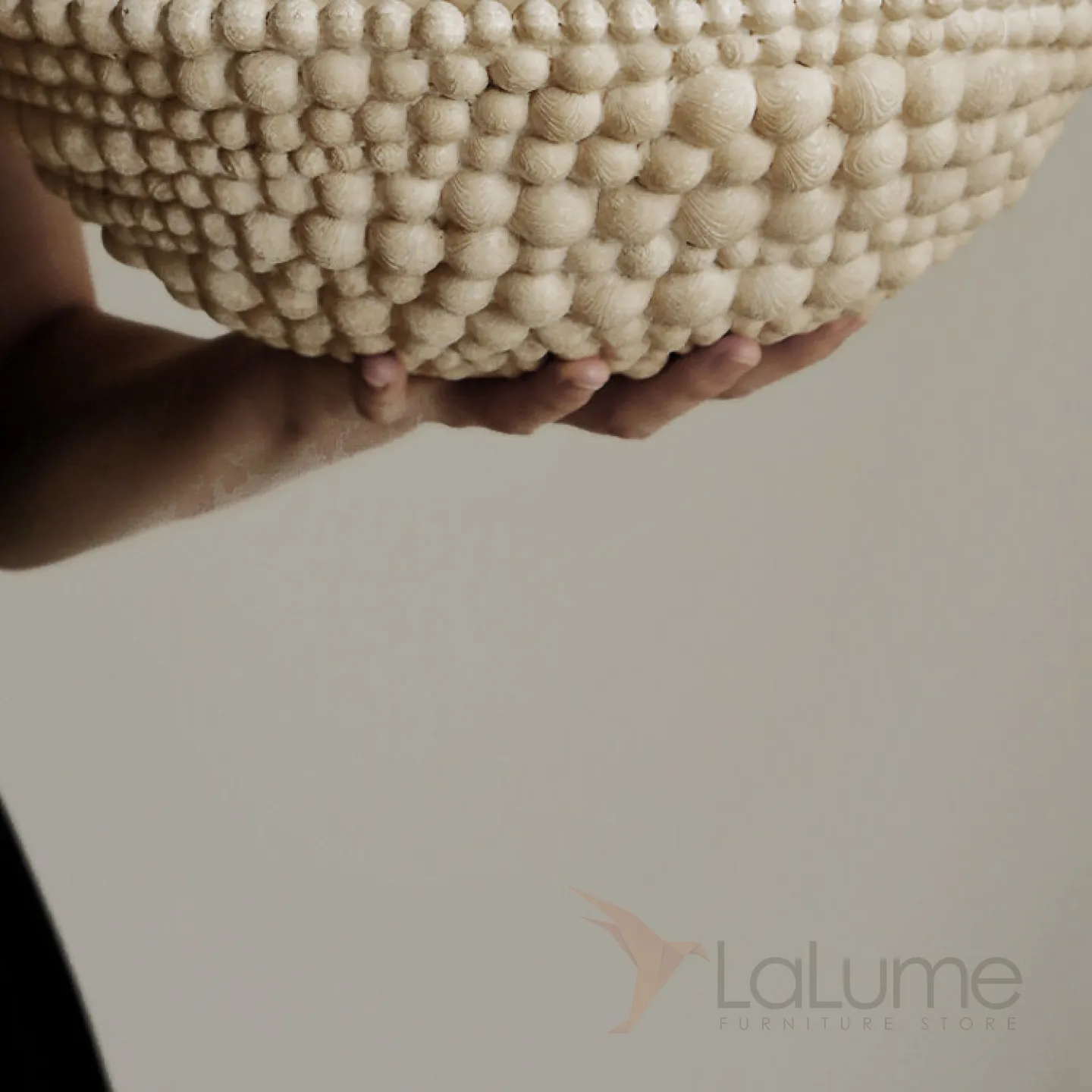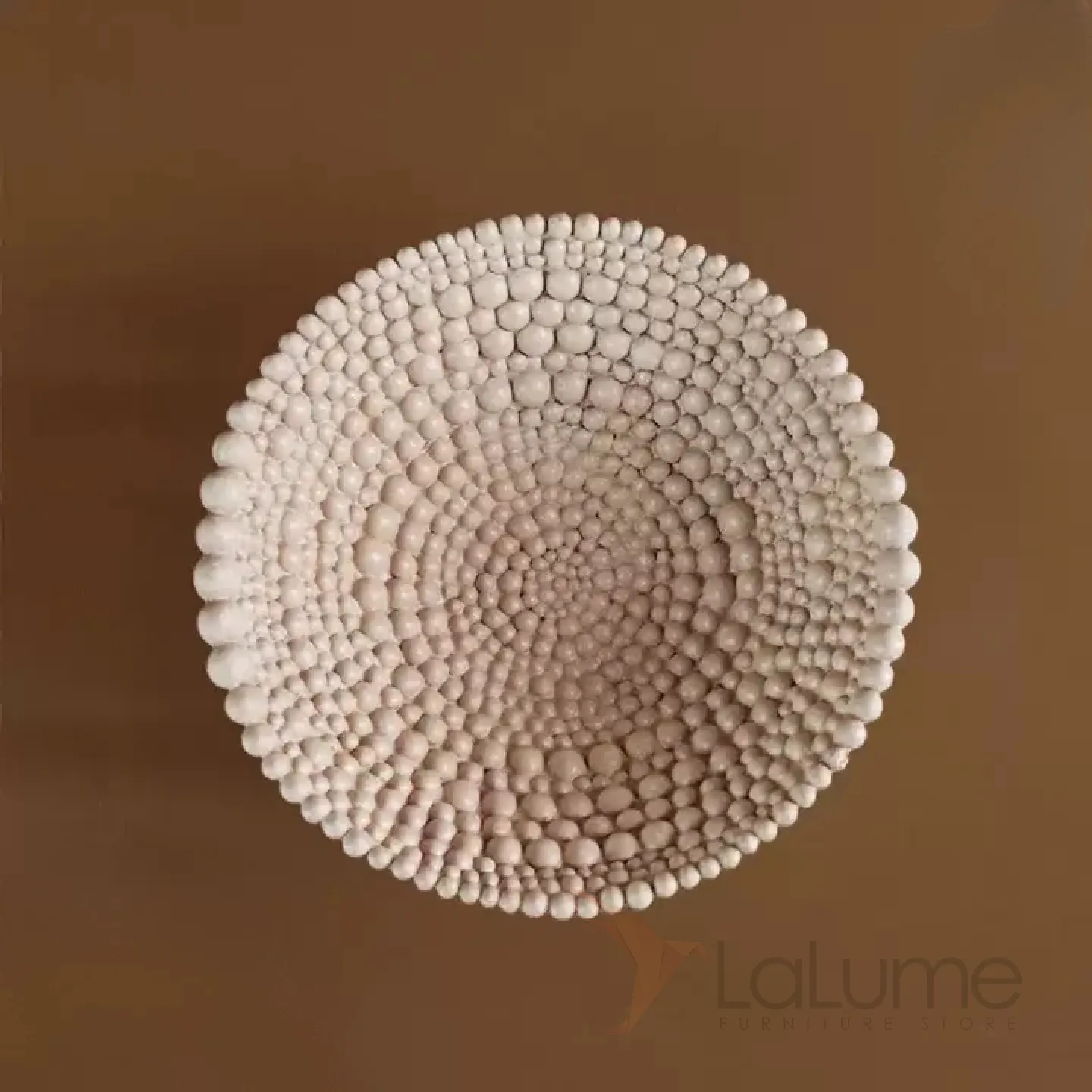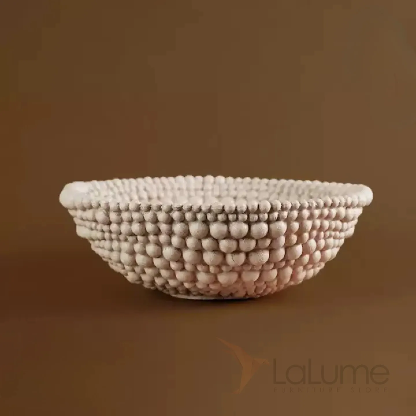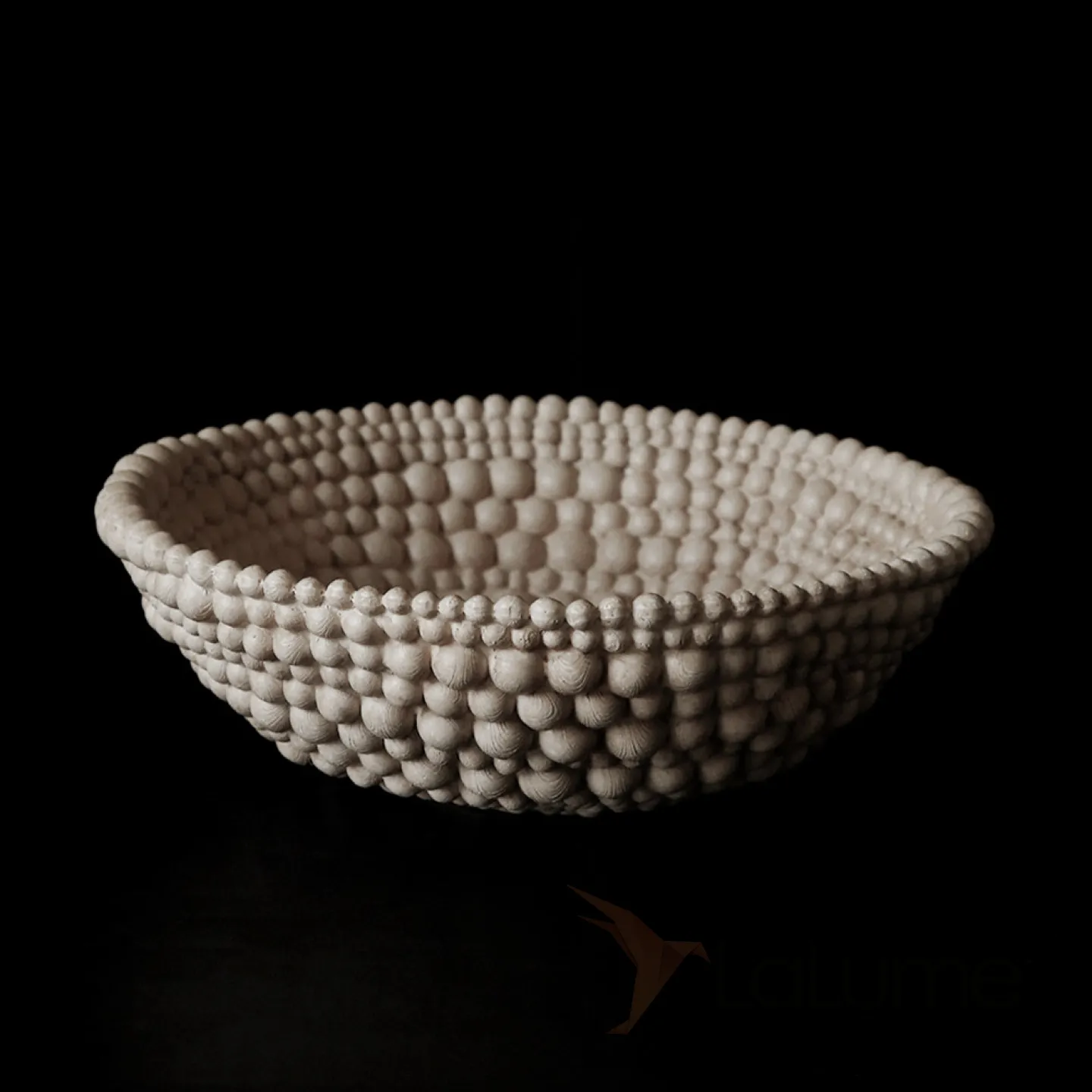 Элегантная фруктовница из смолы с оригинальным дизайном: выполнена в виде чаши с рельефным узором, напоминающим объёмные бусины или шарики по краю. Нейтральный, приглушённый оттенок гармонично впишется в любой интерьер — от минималистичного до эклектичного. Прочная, устойчивая конструкция позволяет использовать её не только для сервировки свежих фруктов (как на фото — гранаты, виноград, сливы), но и для декоративных композиций.