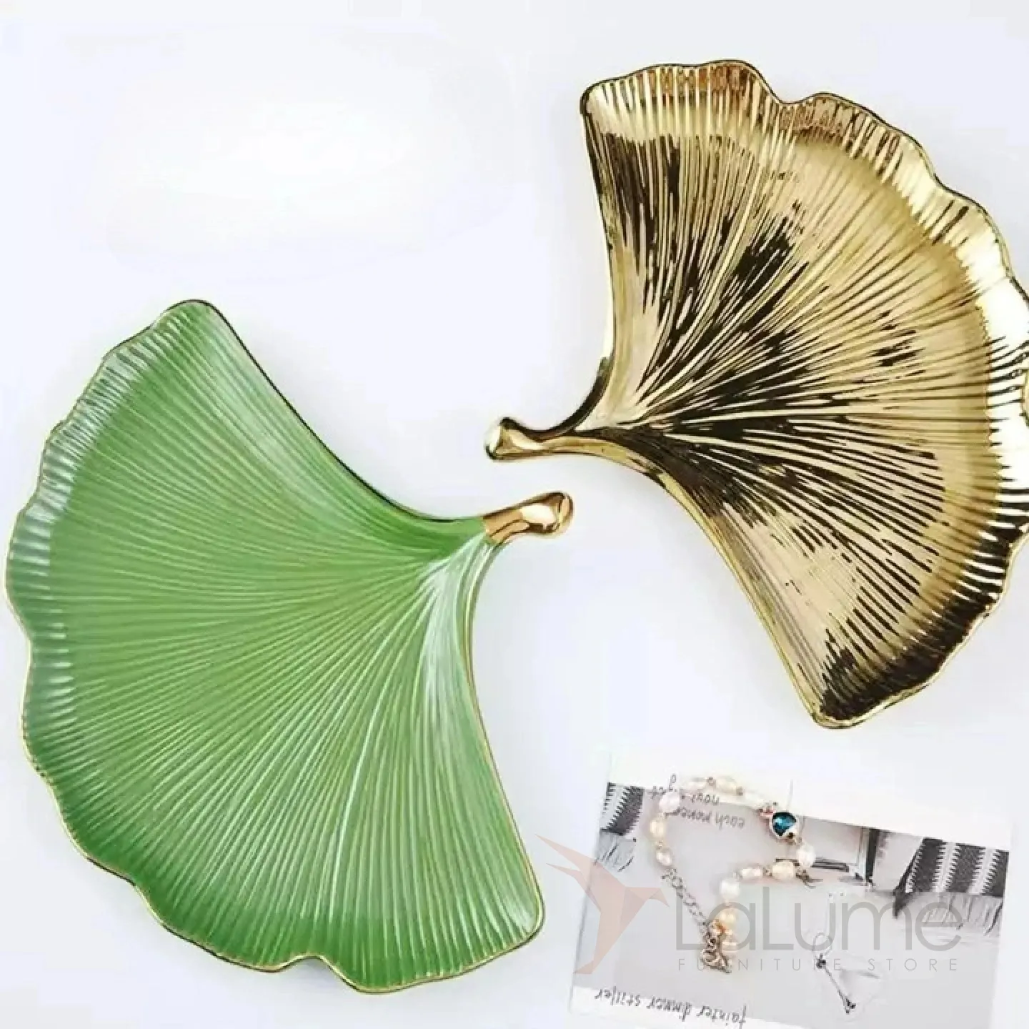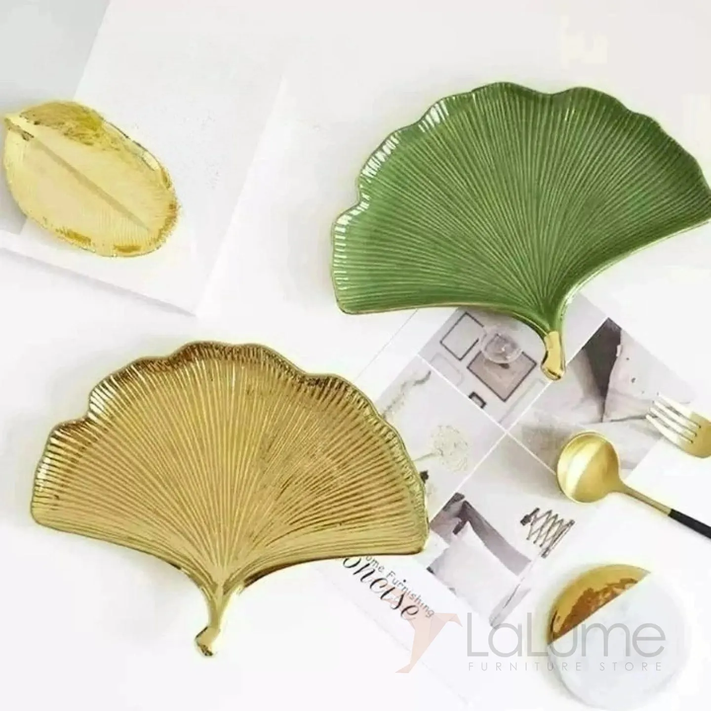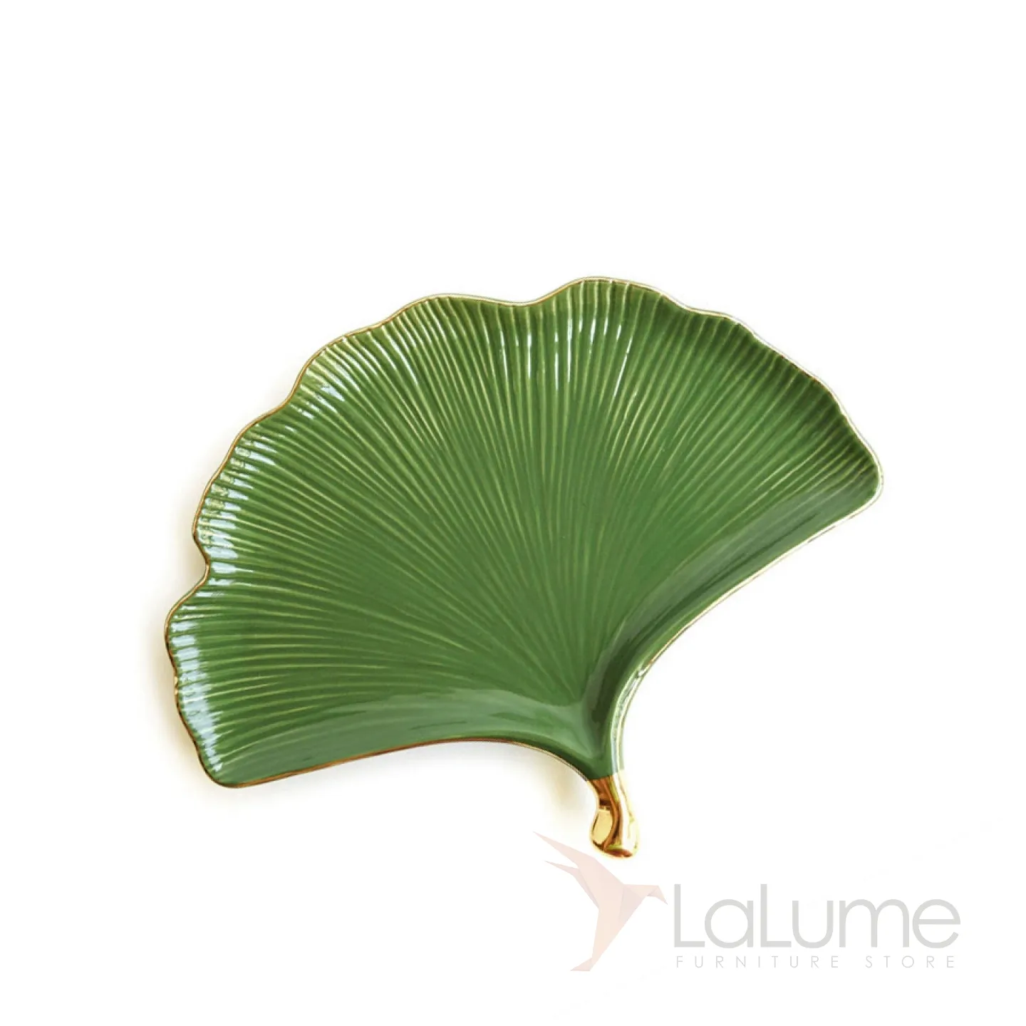Тарелка из керамики, напоминающая лист растения. Покрыта глазурью. Доступны два цвета: зелёный и золотой.