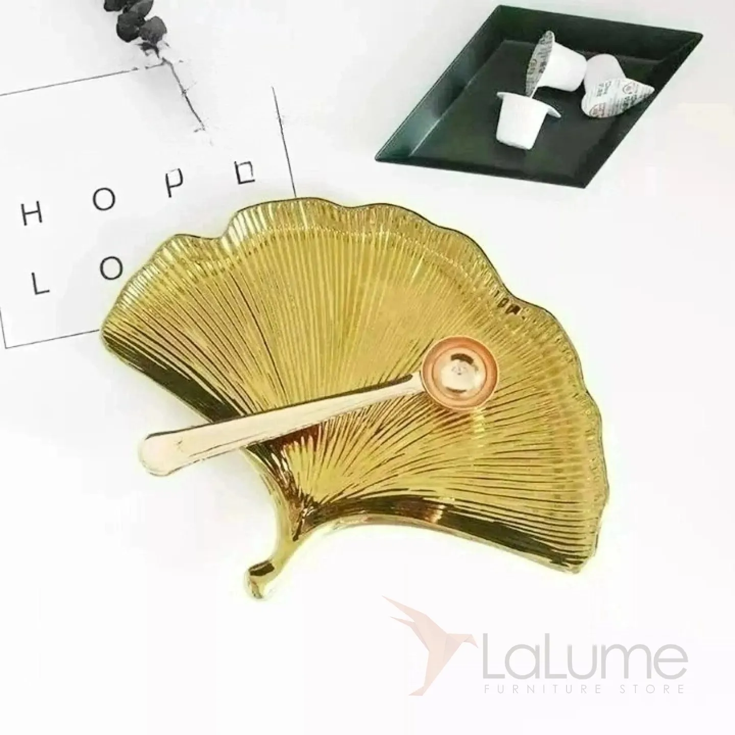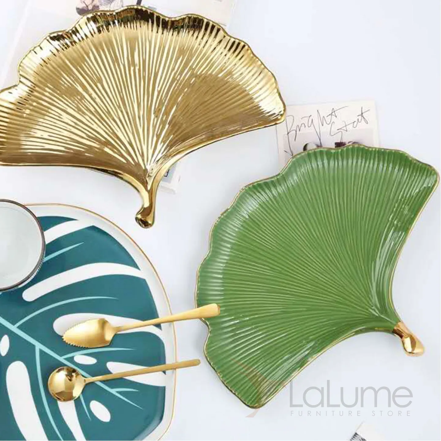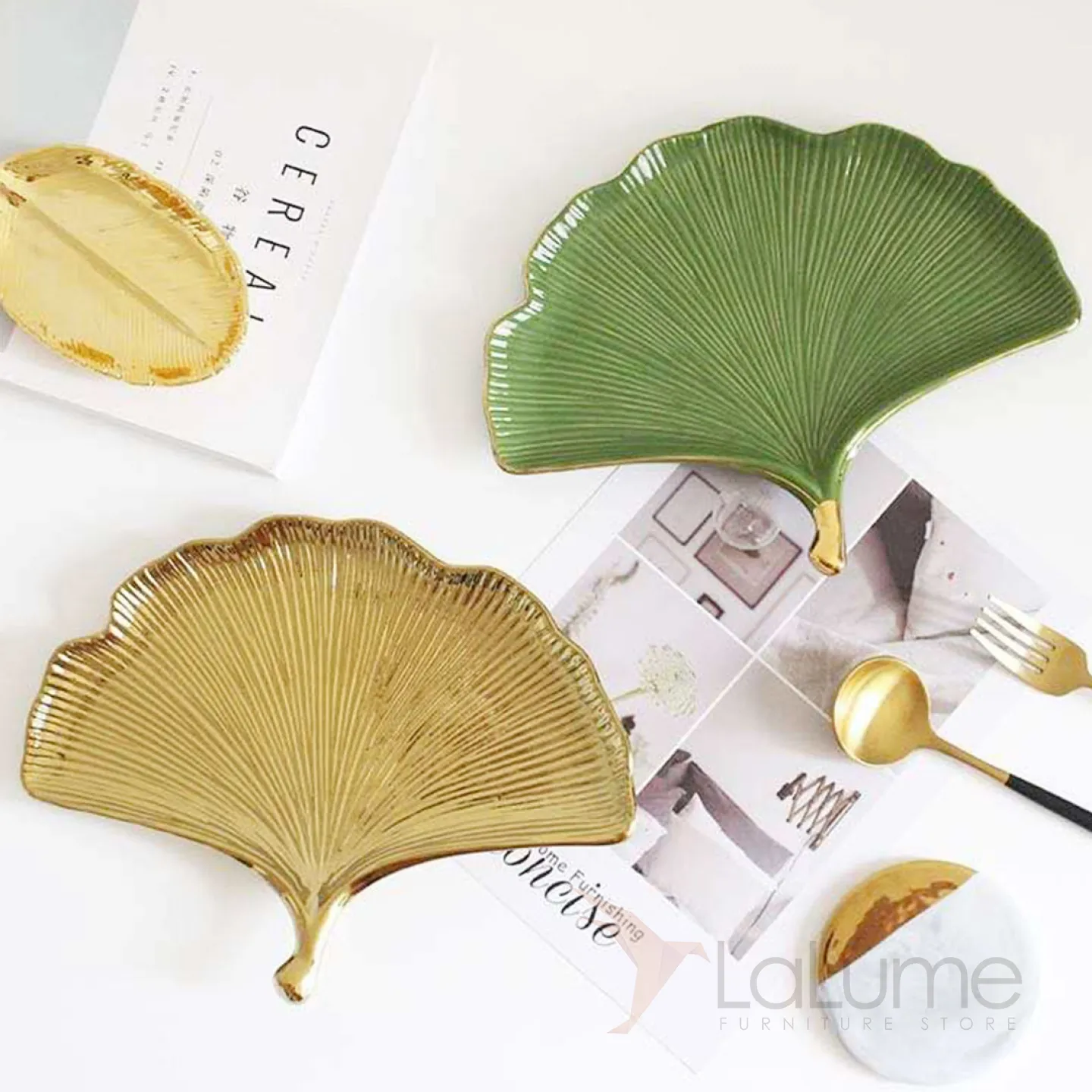Тарелка из керамики, напоминающая лист растения. Покрыта глазурью. Доступны два цвета: зелёный и золотой.