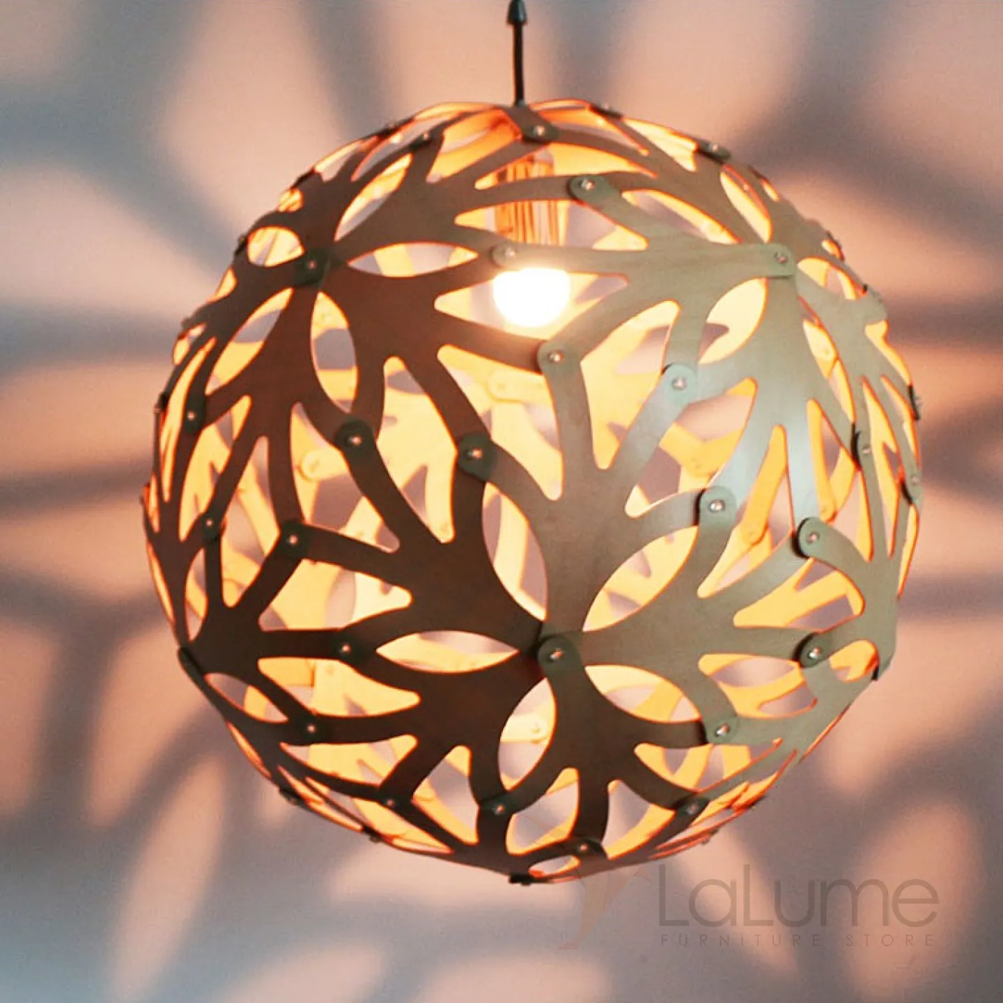 Деревянный подвесной светильник в виде ажурного шара RISTA