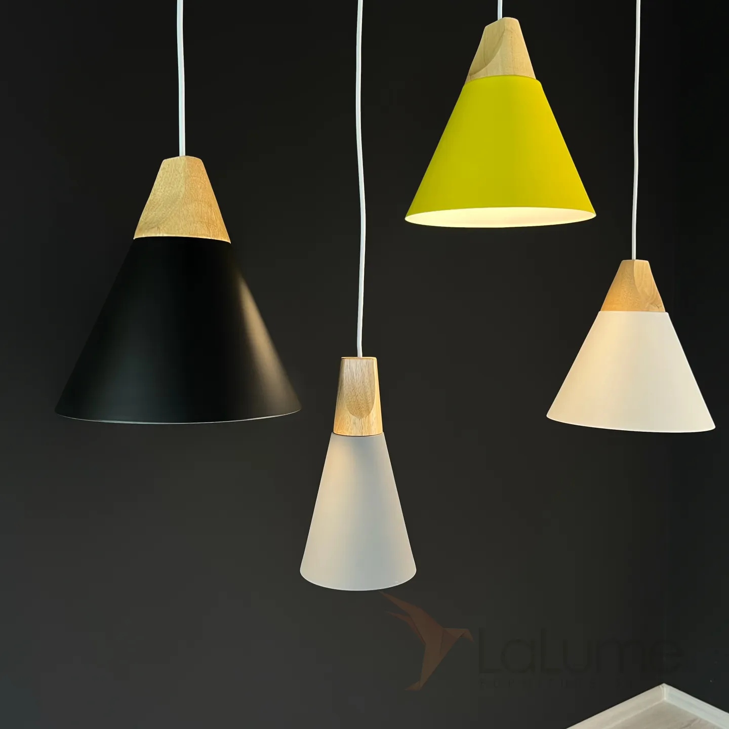 Серия подвесных светильников в скандинавском стиле с металлическими конусными абажурами и деревянным клипом. Прекрасно комбинируются в группы, как разноуровневого, так и линейного размещения на общем потолочном диске или плоскости.