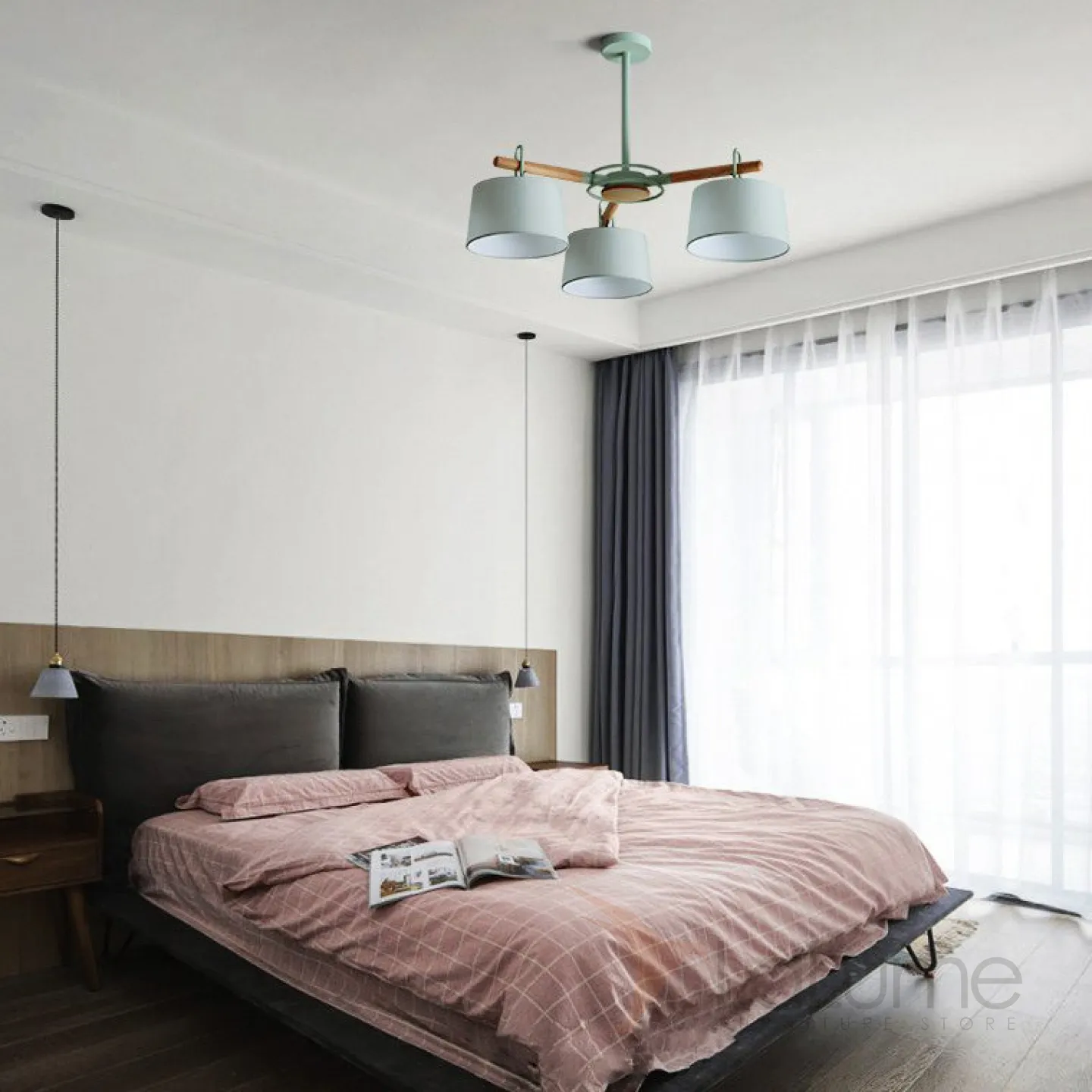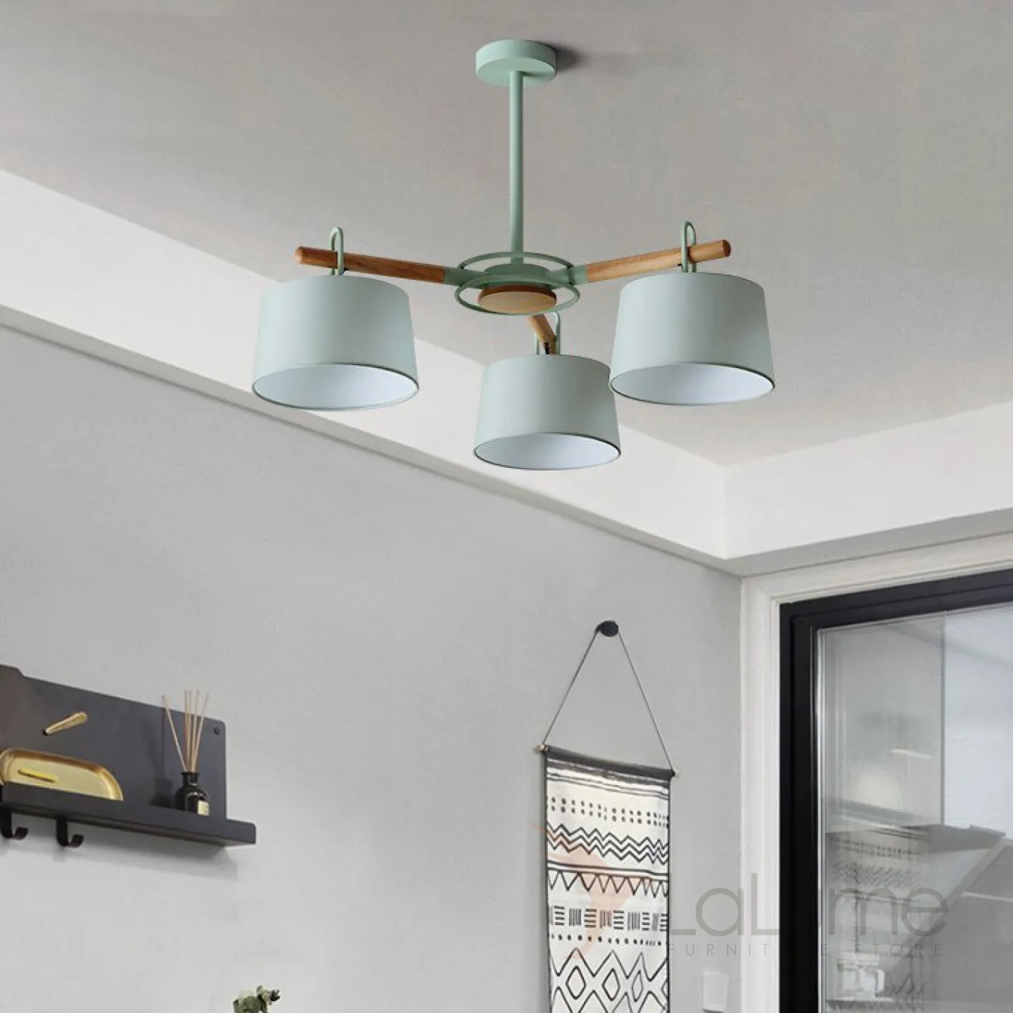 Новая люстра EVEN в стиле Сканди с текстильными плафонами на лучевом каркасе с фактурными деревянными элементами на корпусе.