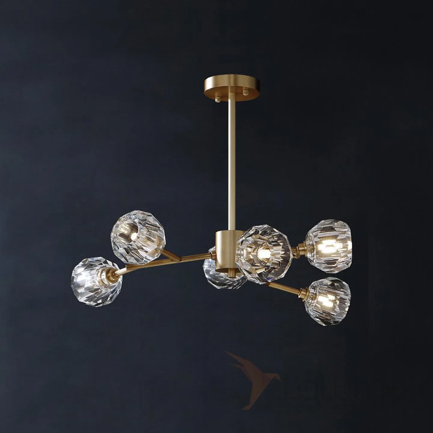 Люстра RH 6 премиального класса с тяжелыми стеклянными плафонами на ветвистом лучевом каркасе латунного цвета.