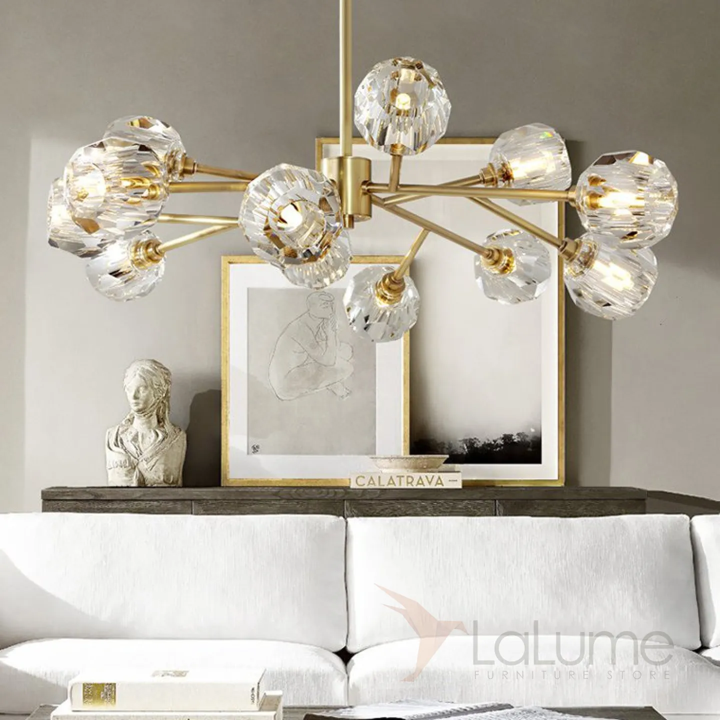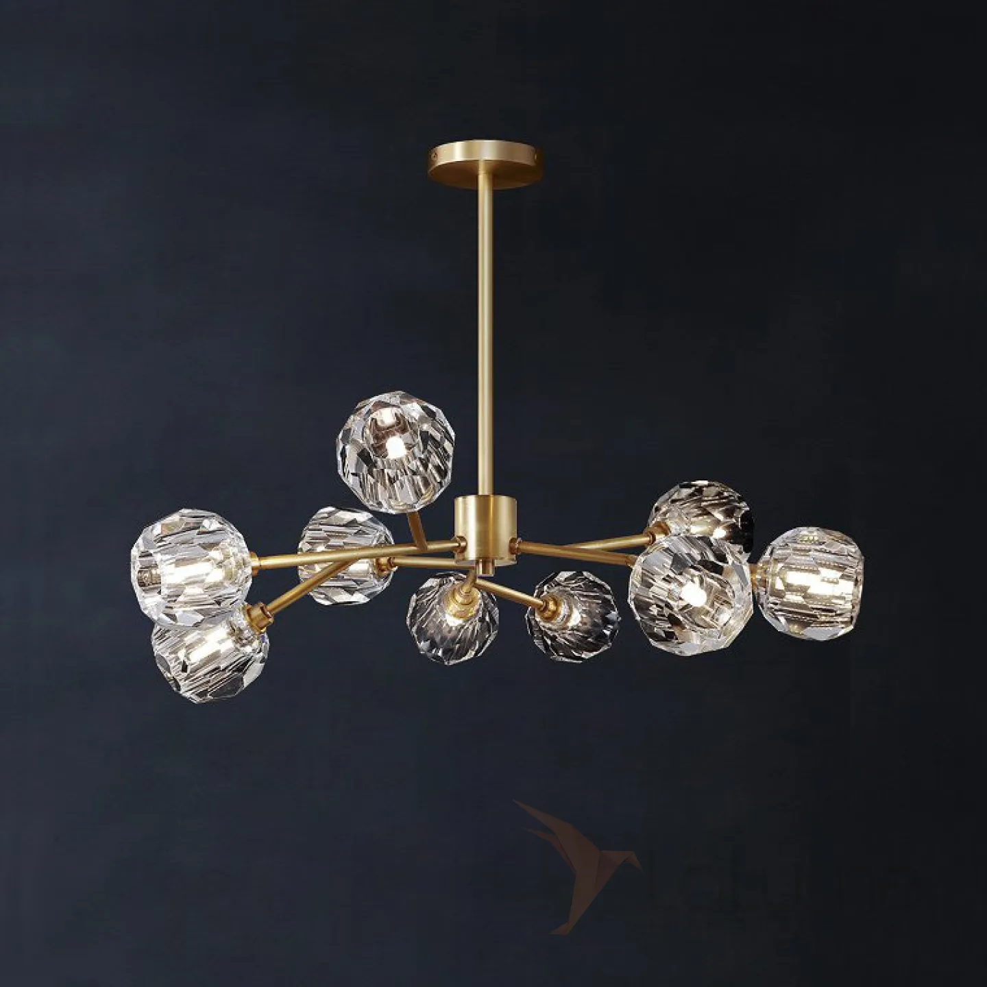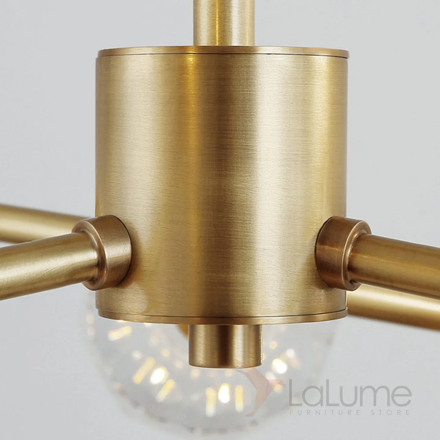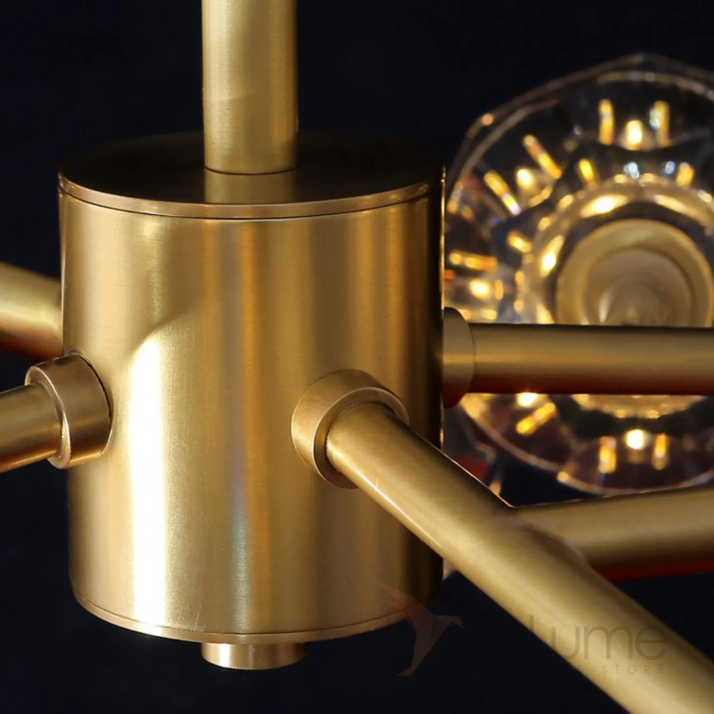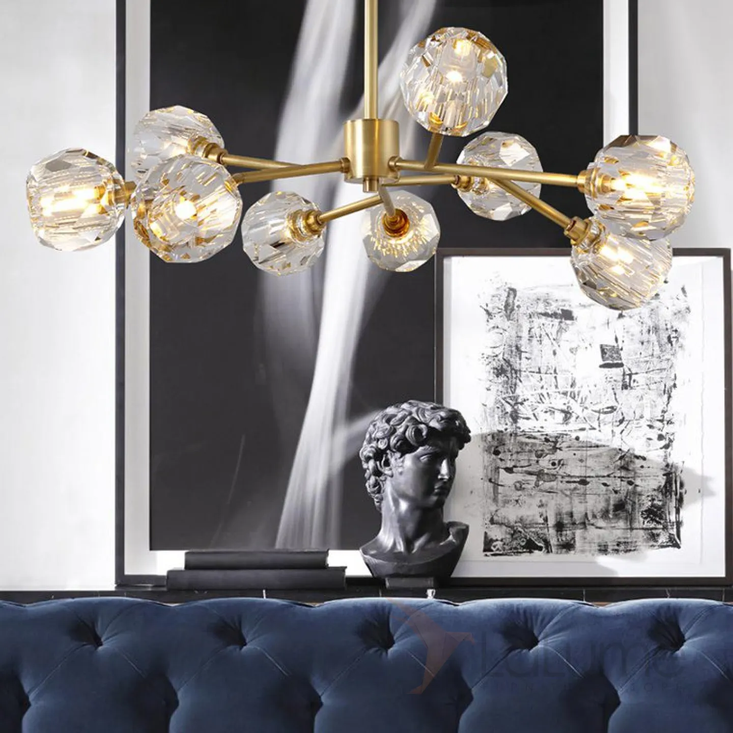 Люстра RH 9 премиального класса с тяжелыми стеклянными плафонами на ветвистом лучевом каркасе латунного цвета.
