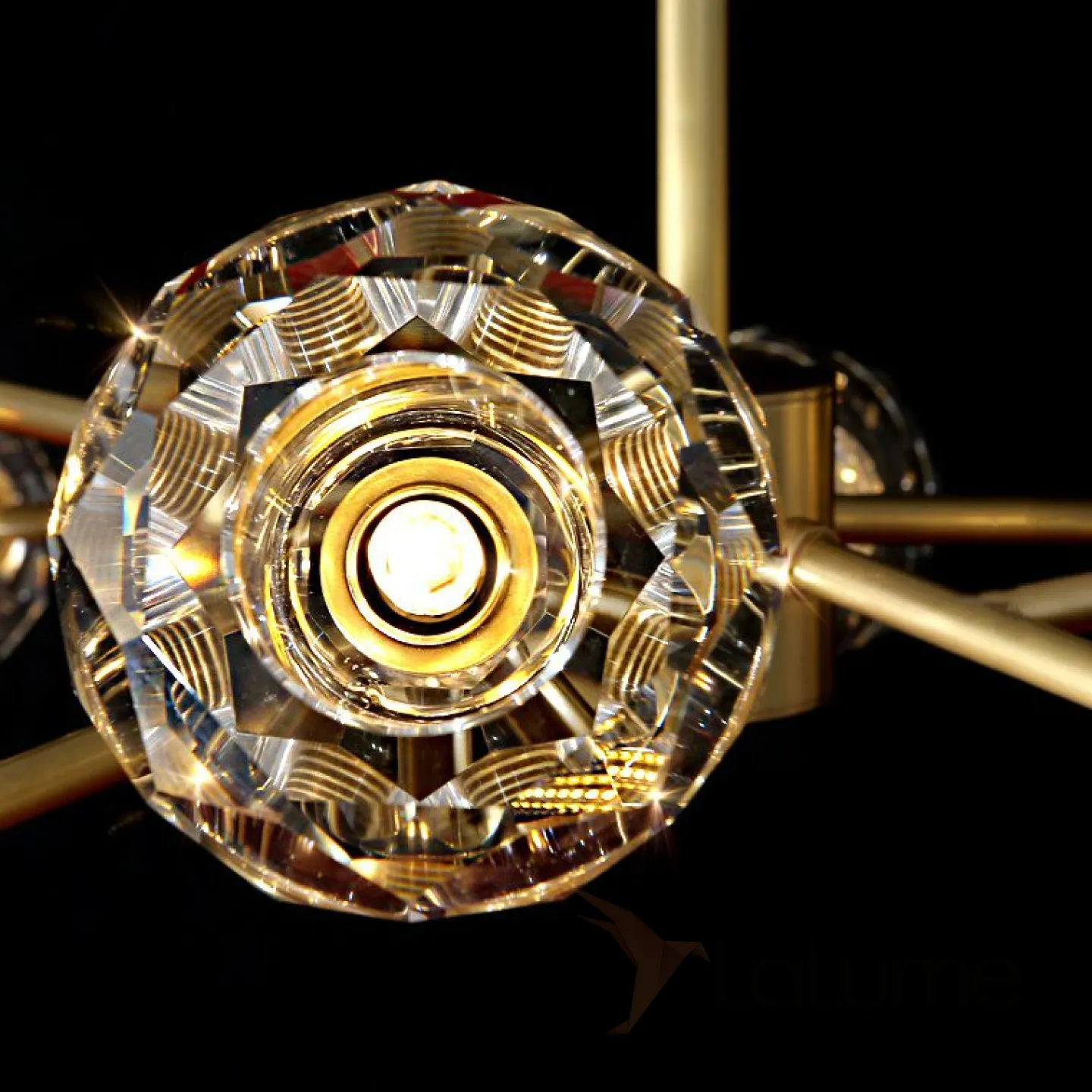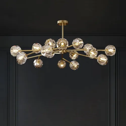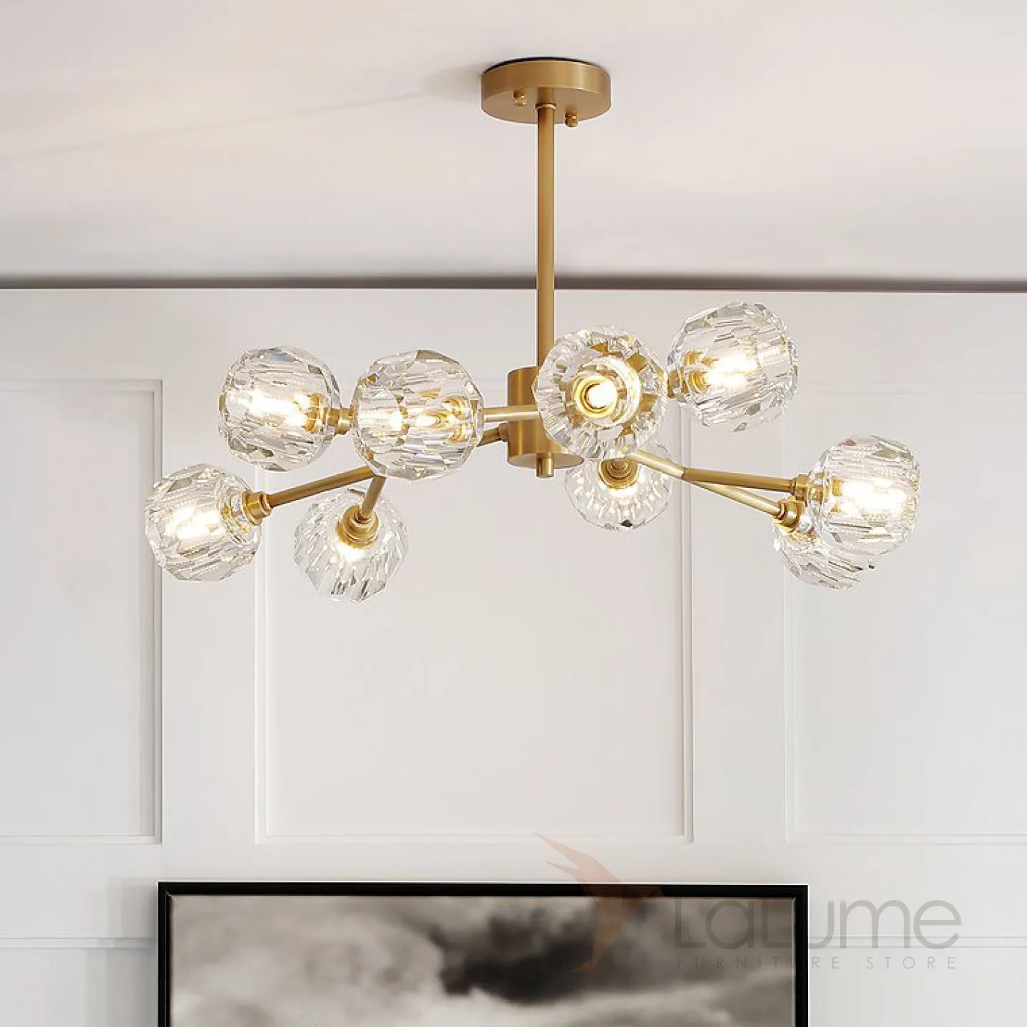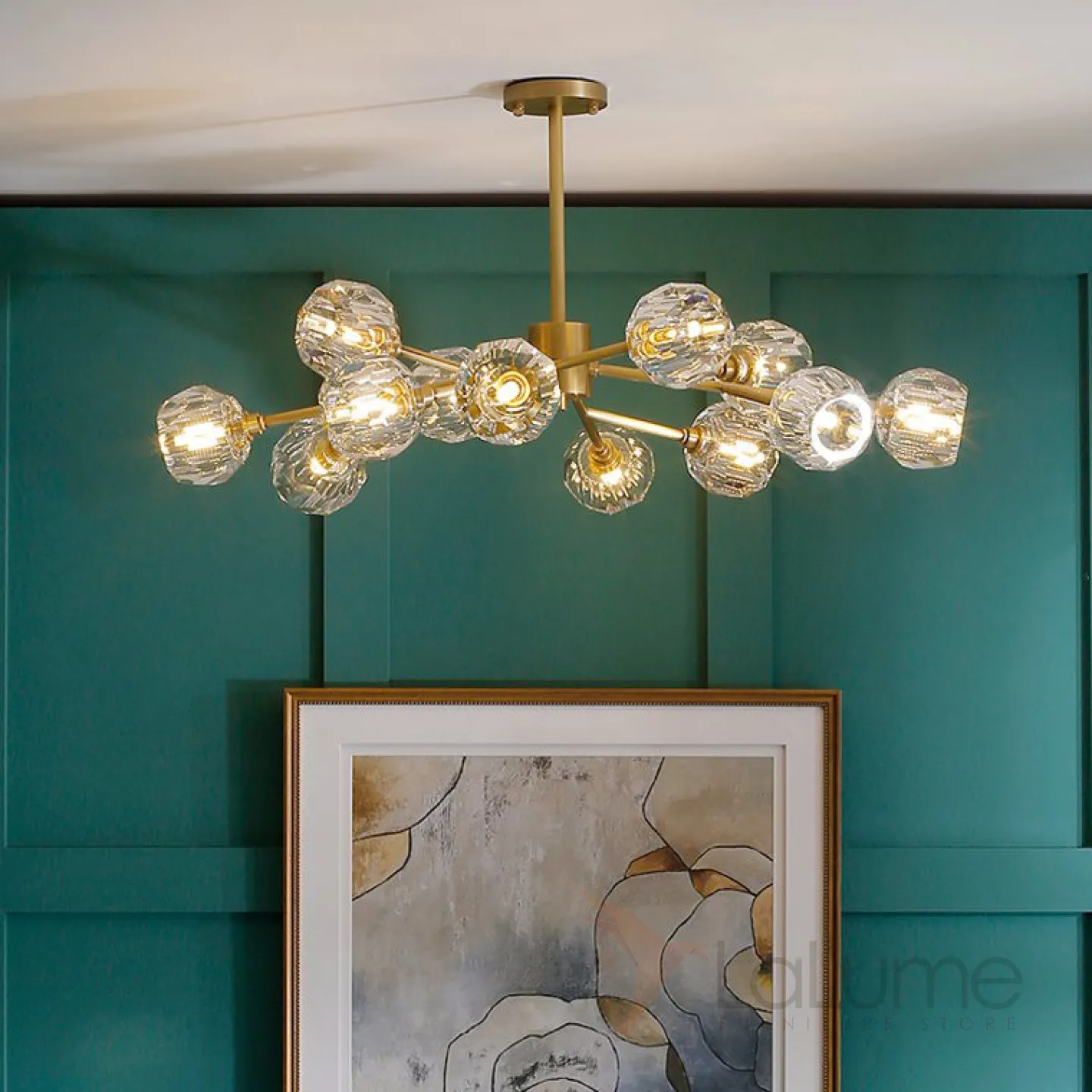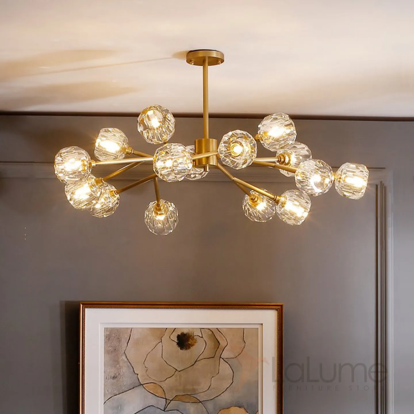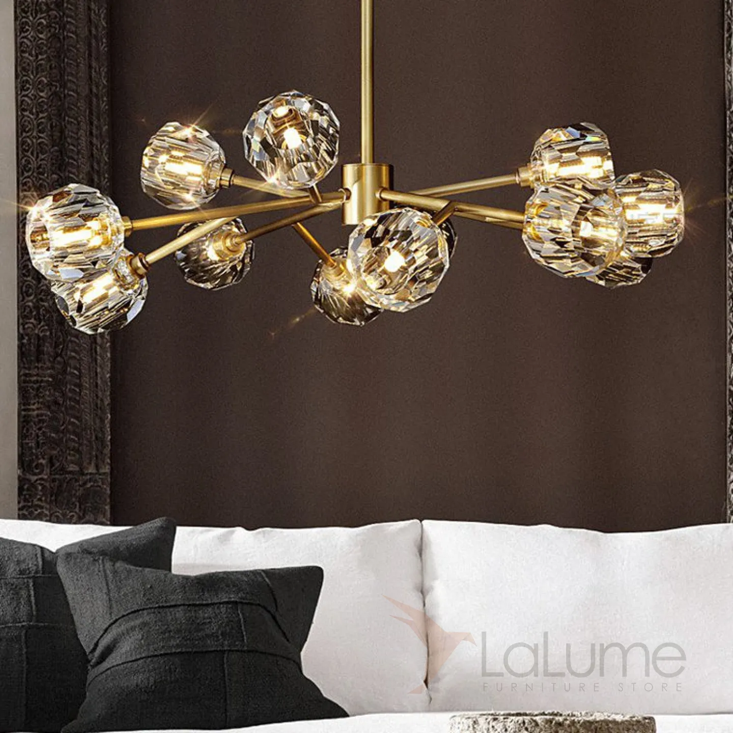 Люстра RH 9 премиального класса с тяжелыми стеклянными плафонами на ветвистом лучевом каркасе латунного цвета.