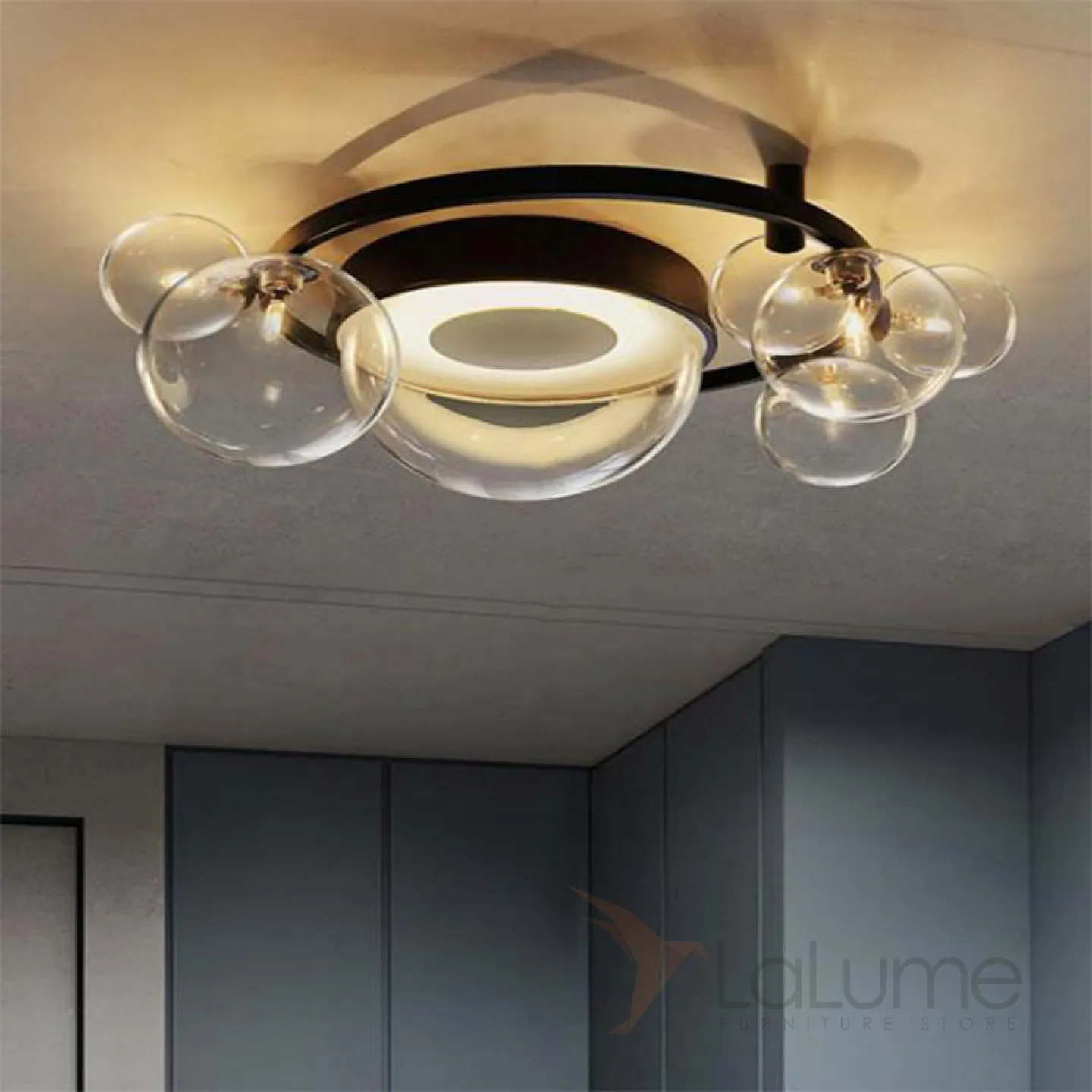 Потолочная люстра с LED-источником под прозрачной полусферой и шарообразными плафонами разного размера на кольцевом каркасе IONA CORE D55
