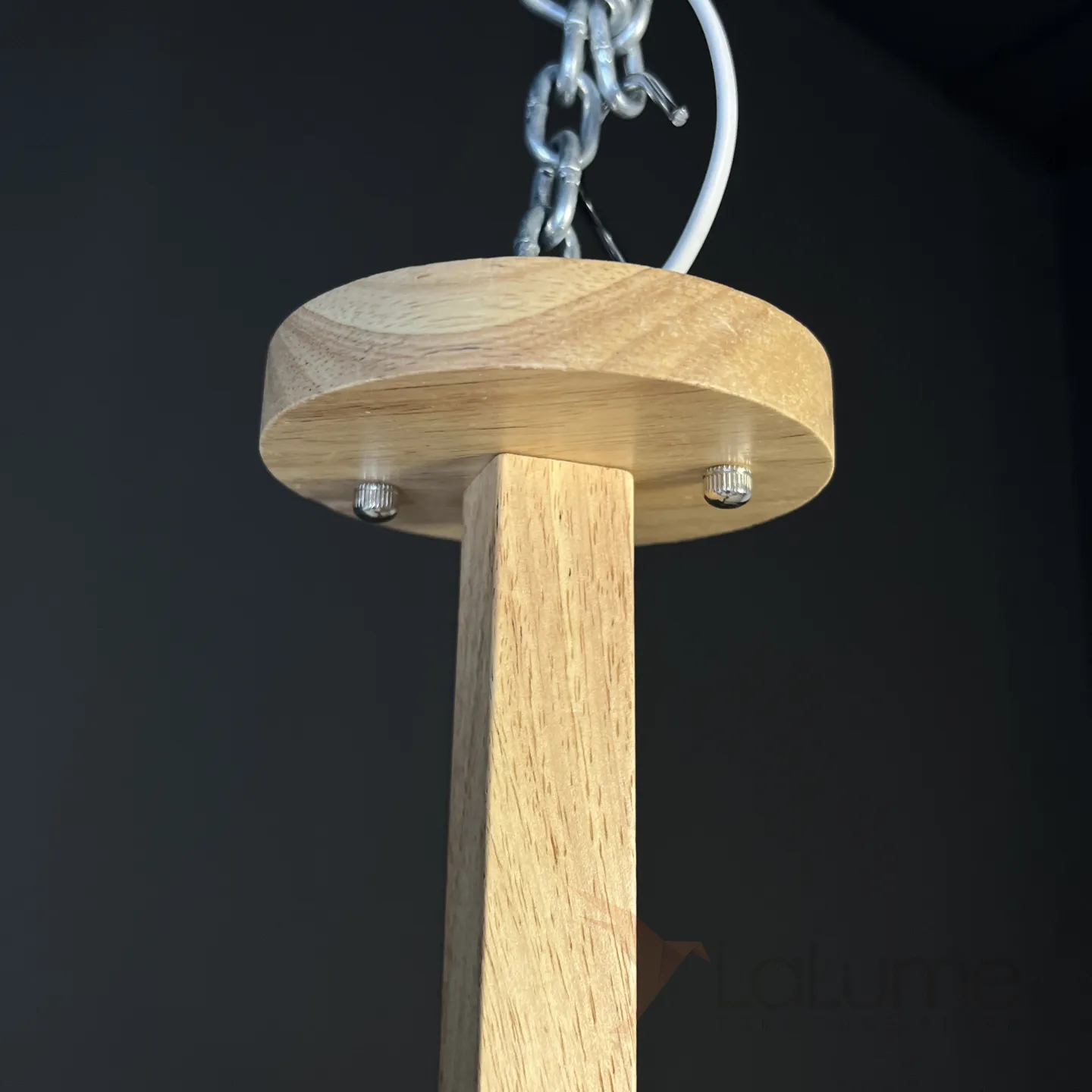 Минималистичная скандинавская люстра с разноцветными коническими плафонами на деревянном каркасе с натуральной текстурой.