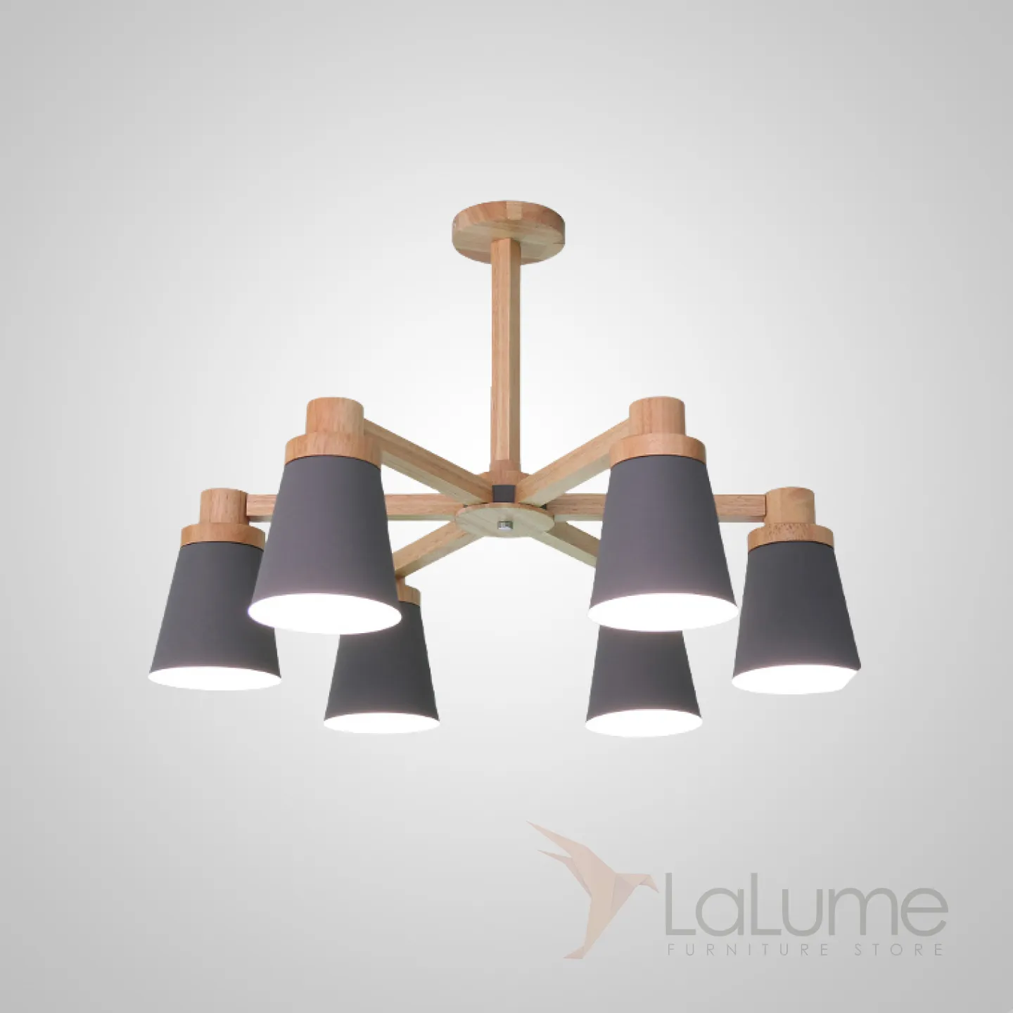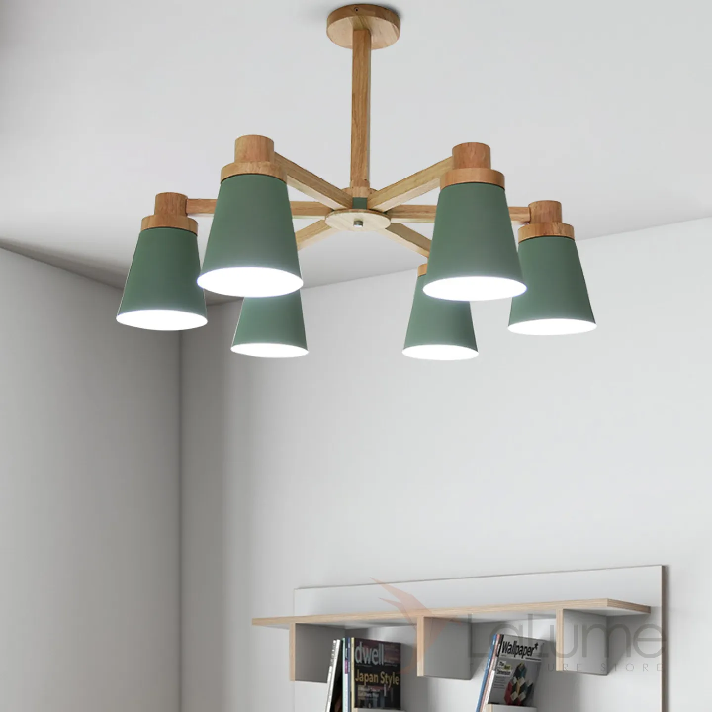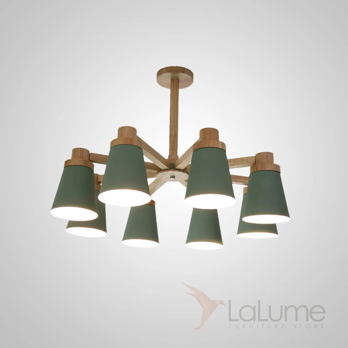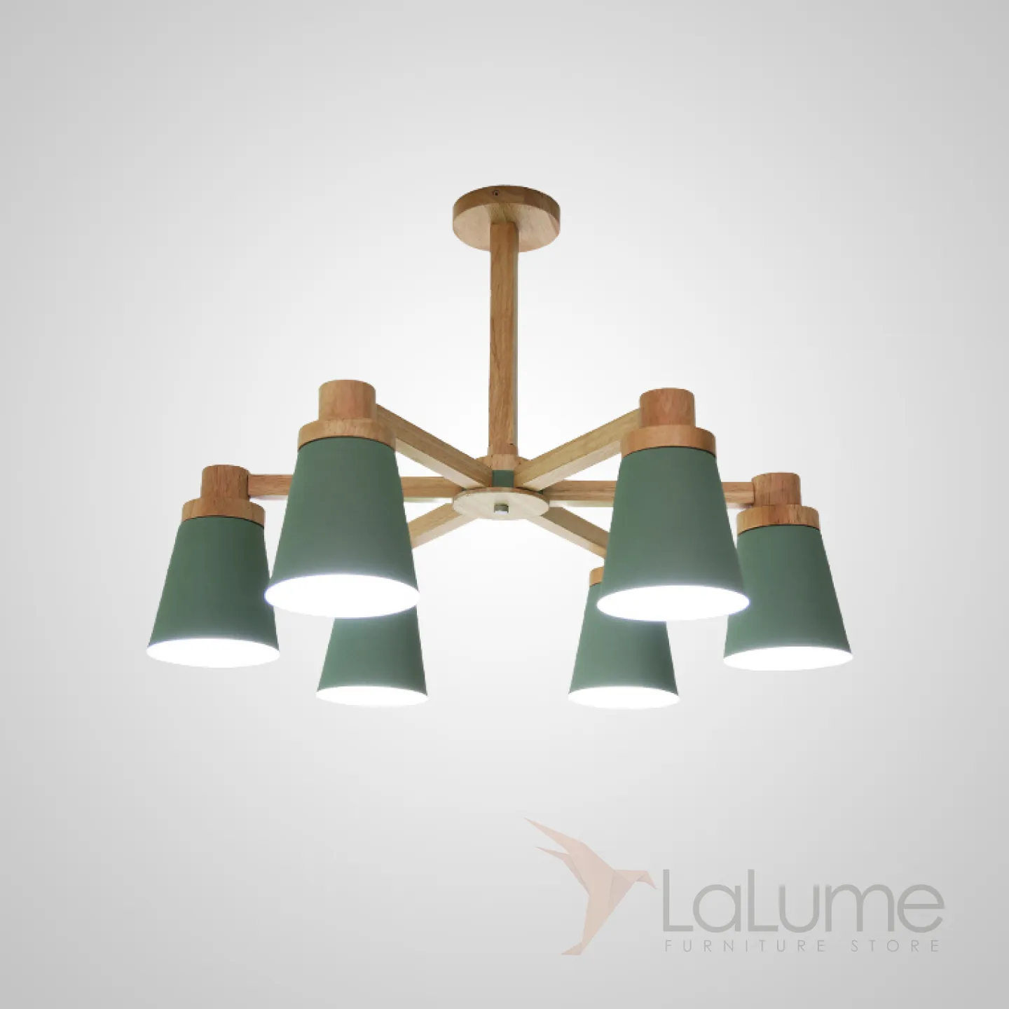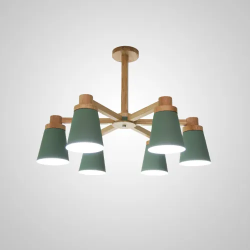 Минималистичная скандинавская люстра с разноцветными коническими плафонами на деревянном каркасе с натуральной текстурой.
