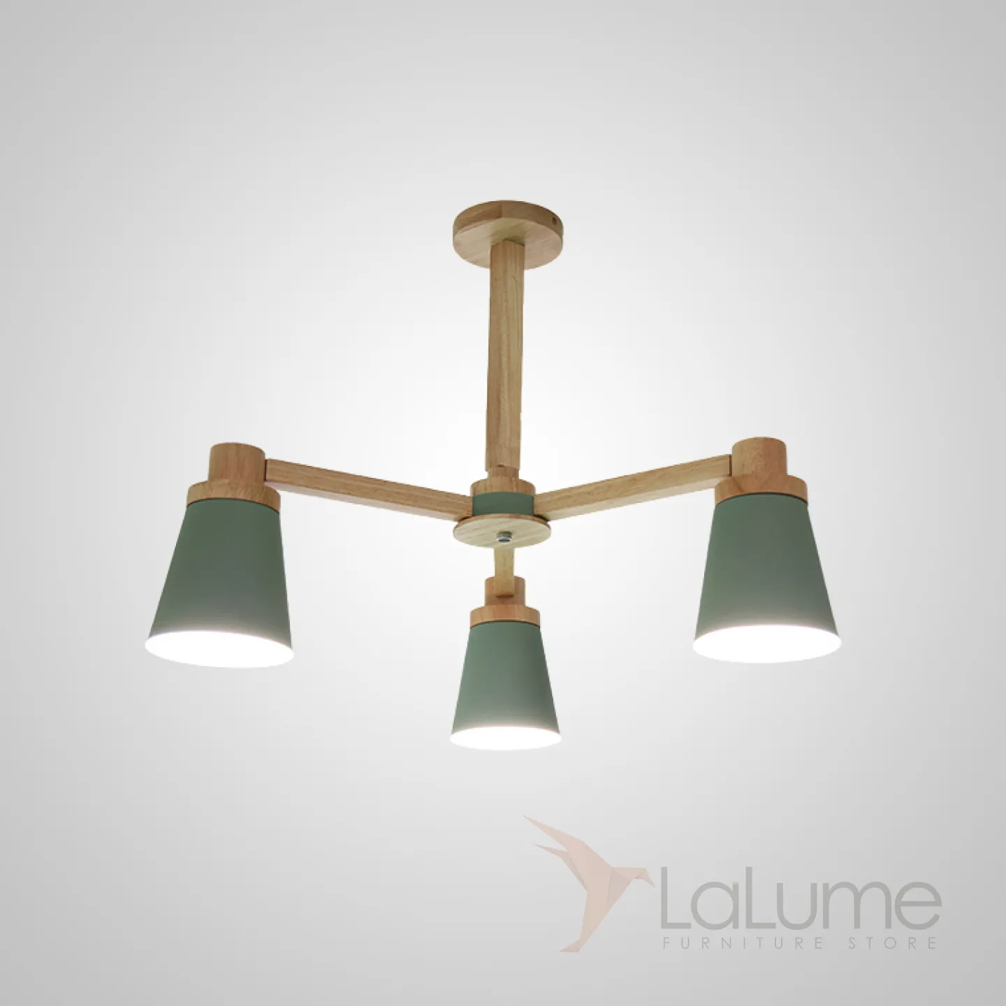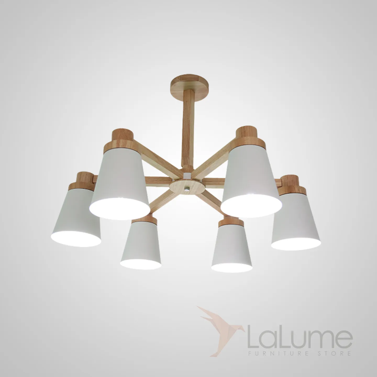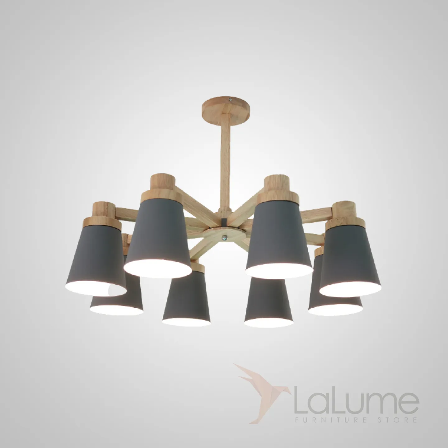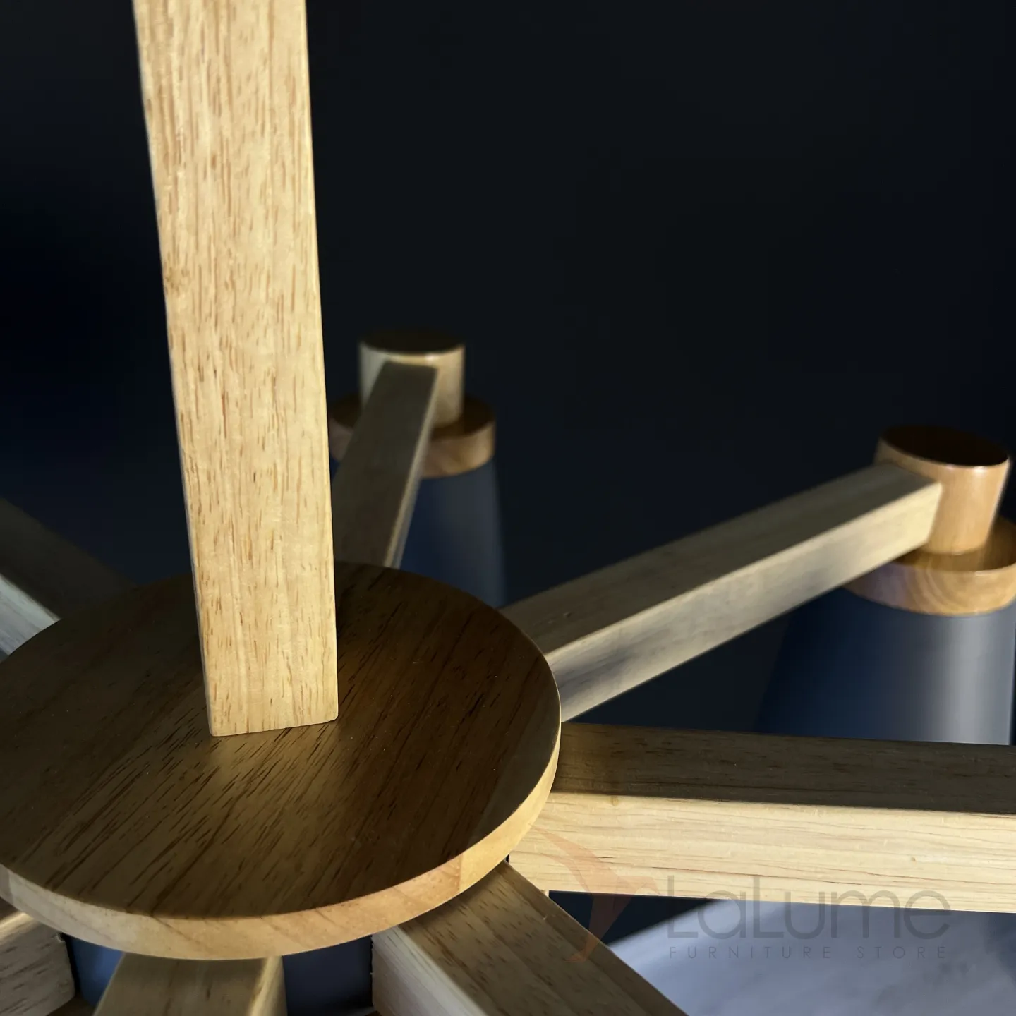 Минималистичная скандинавская люстра с разноцветными коническими плафонами на деревянном каркасе с натуральной текстурой.