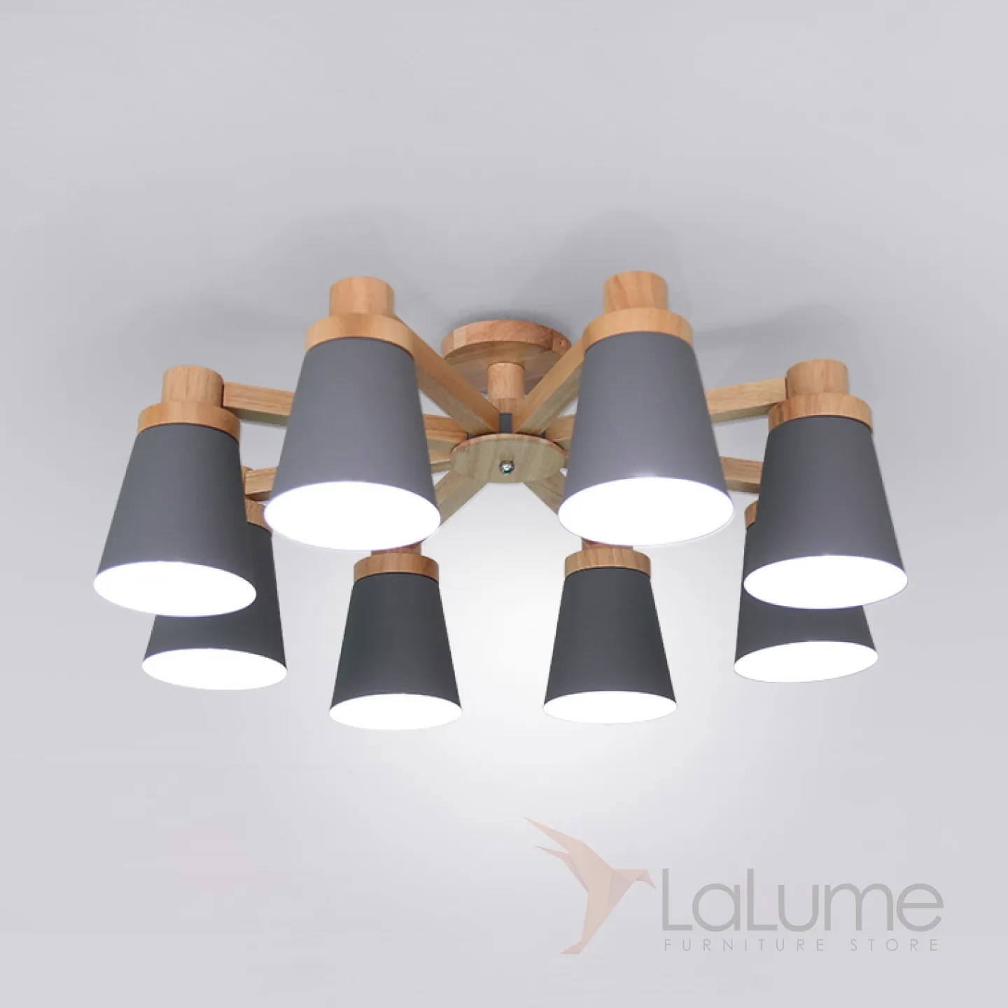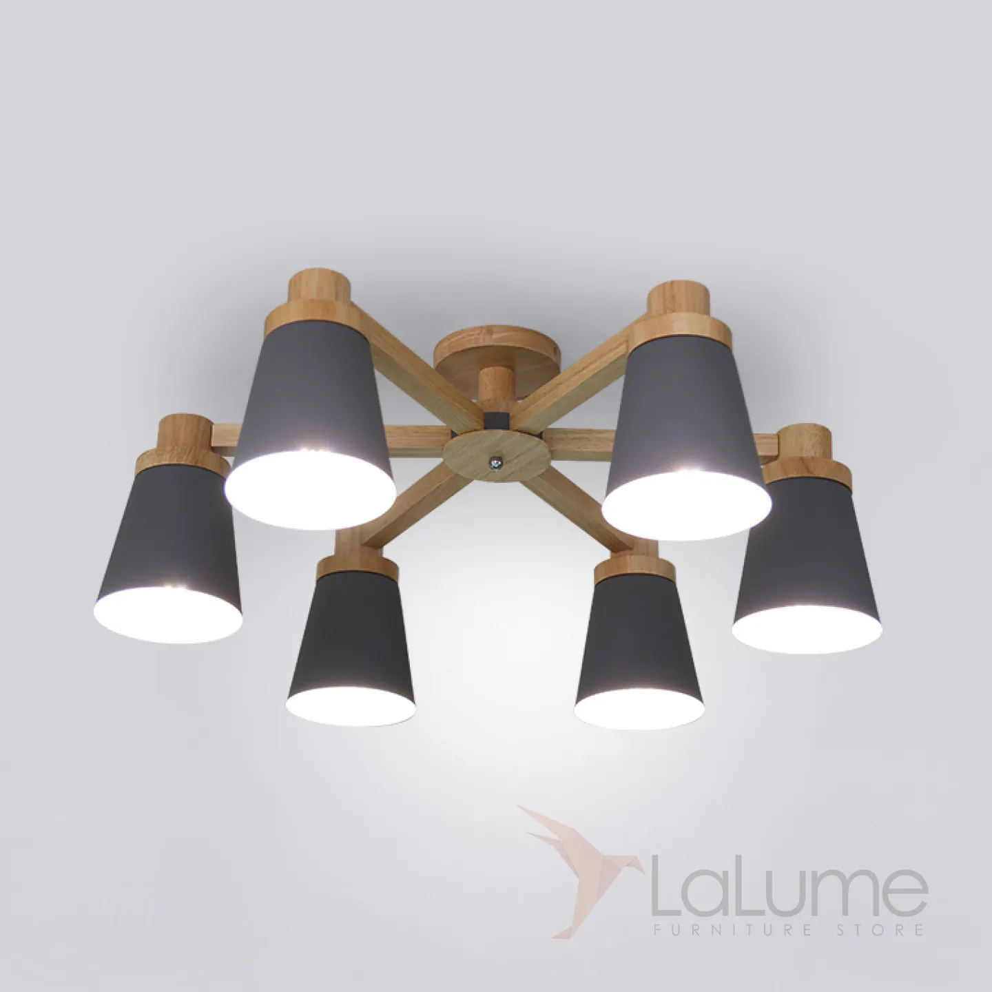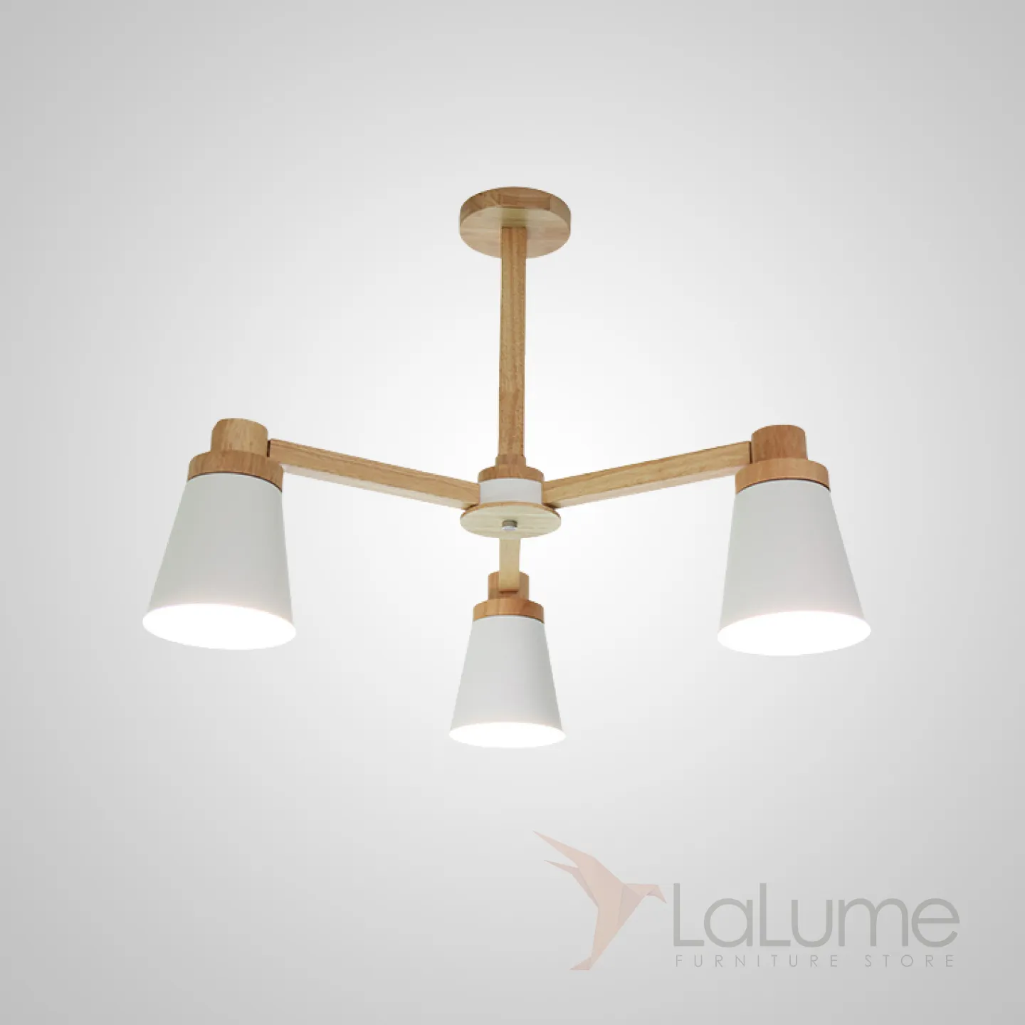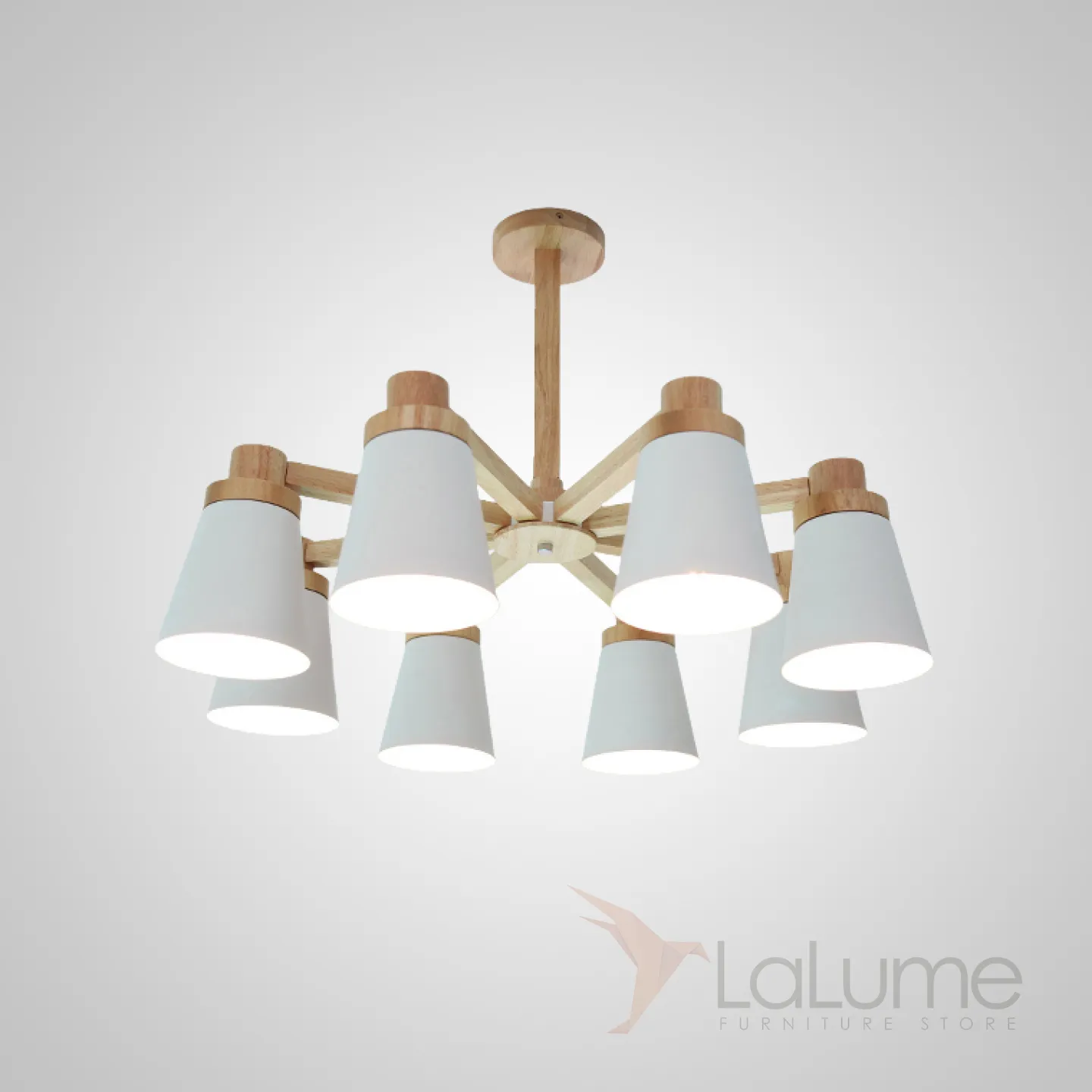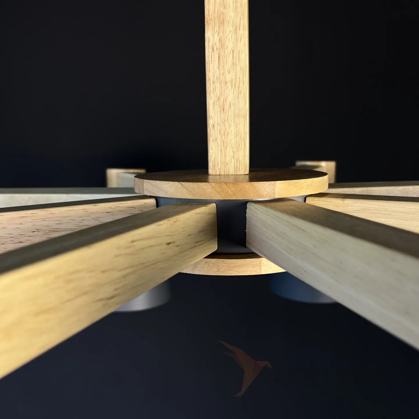 Минималистичная скандинавская люстра с разноцветными коническими плафонами на деревянном каркасе с натуральной текстурой.