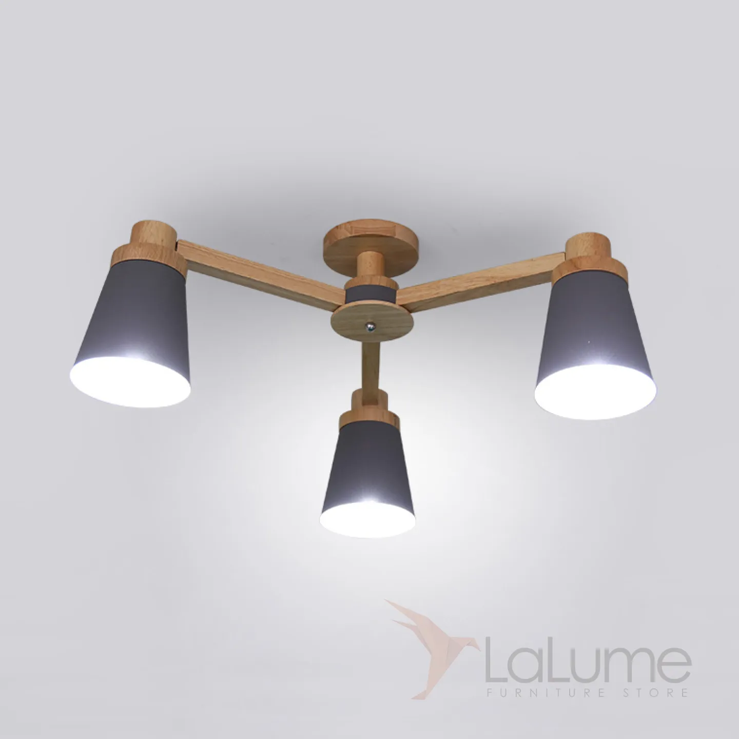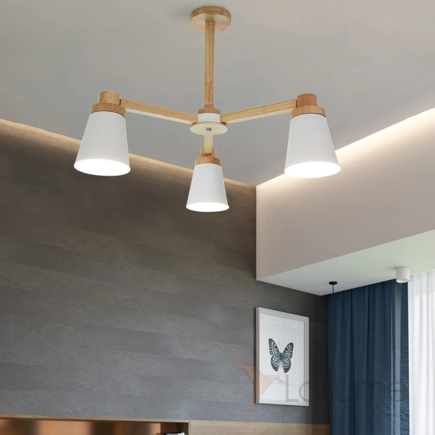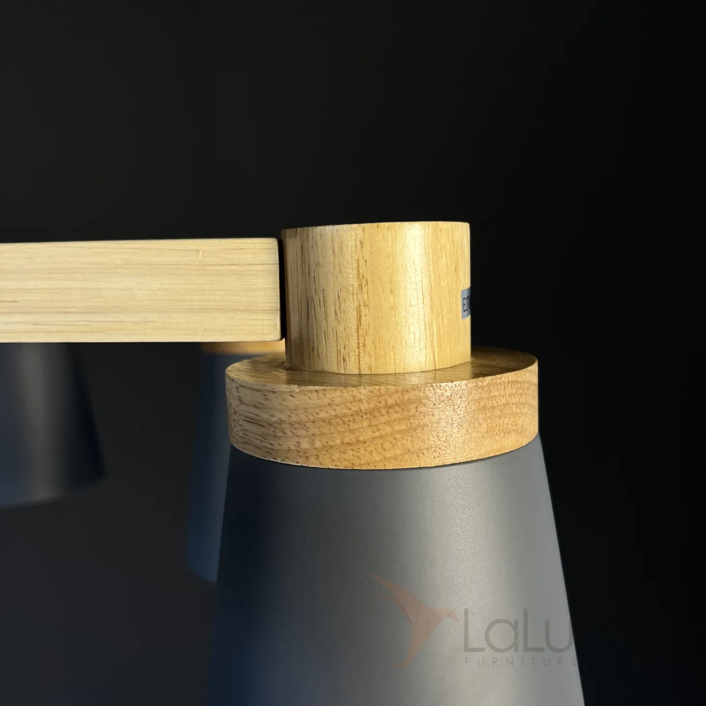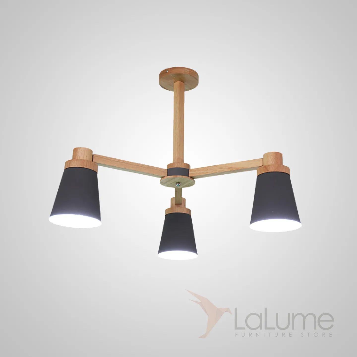 Минималистичная скандинавская люстра с разноцветными коническими плафонами на деревянном каркасе с натуральной текстурой.