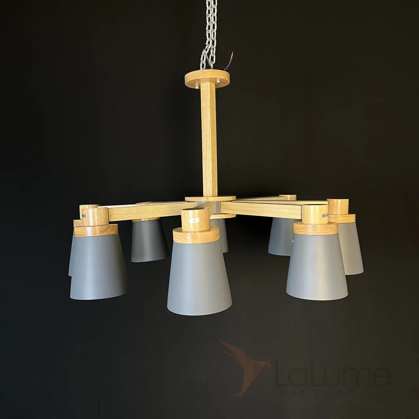 Минималистичная скандинавская люстра с разноцветными коническими плафонами на деревянном каркасе с натуральной текстурой.